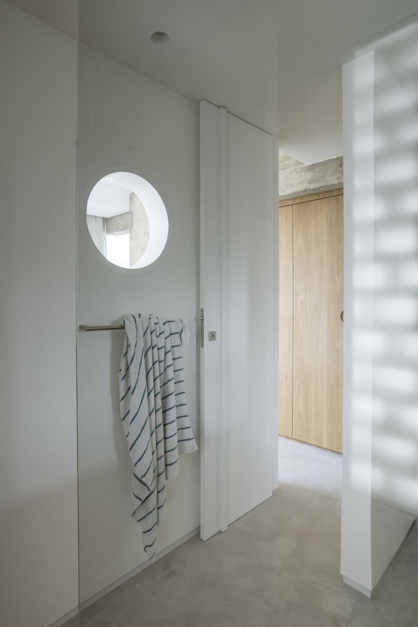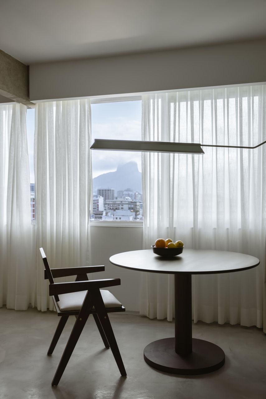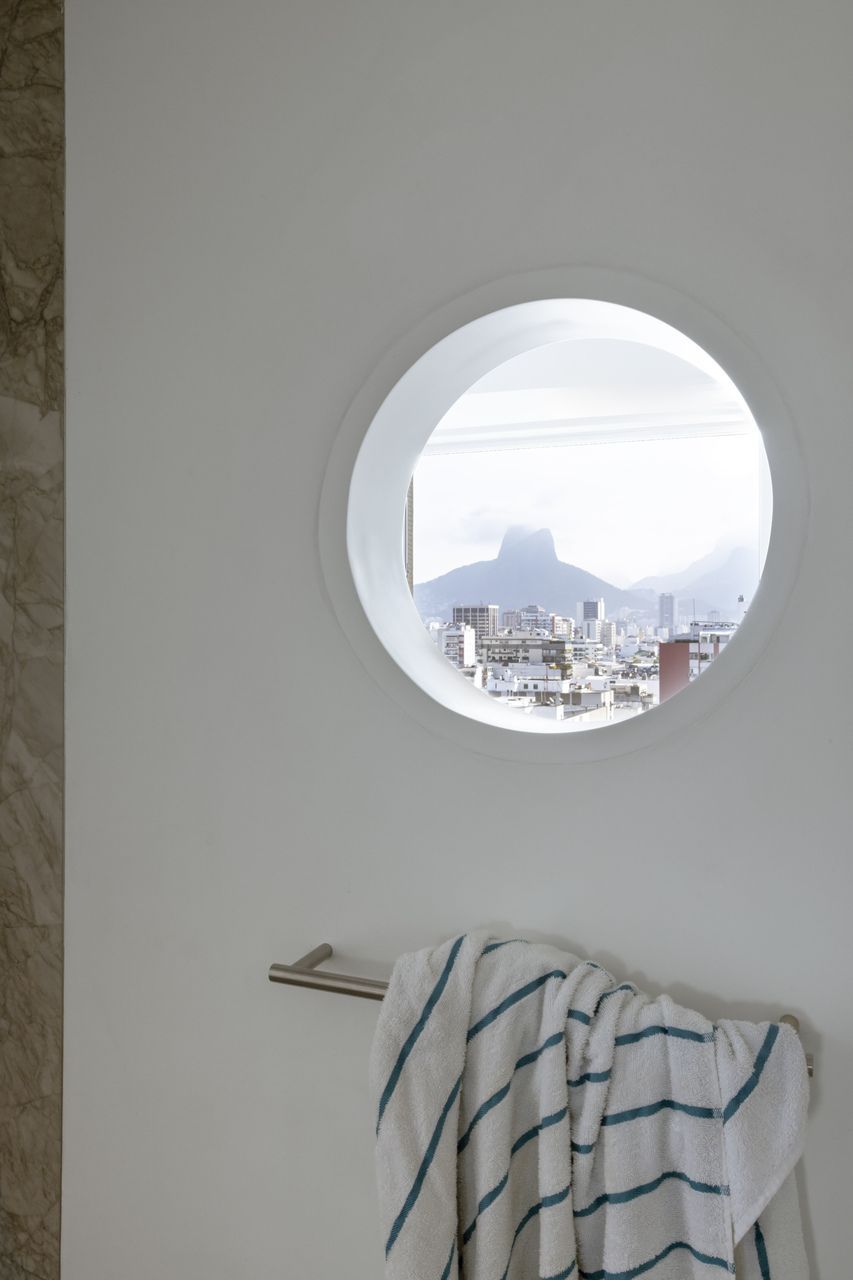 A iluminação, desenhada de forma indireta, reforça a sensação de amplitude e valoriza as superfícies claras ao longo do dia e da noite. Durante o pôr do sol, o apartamento absorve os tons alaranjados e arroxeados do céu carioca; à noite, ganha uma nova leitura, mais introspectiva. Para o arquiteto, o que torna este projeto especial é justamente a forma como a janela se transforma no elo entre todos os ambientes — circulação, paisagem e arquitetura se fundem em uma casa que reflete, com autenticidade, o modo aberto e espontâneo de viver no Rio de Janeiro.