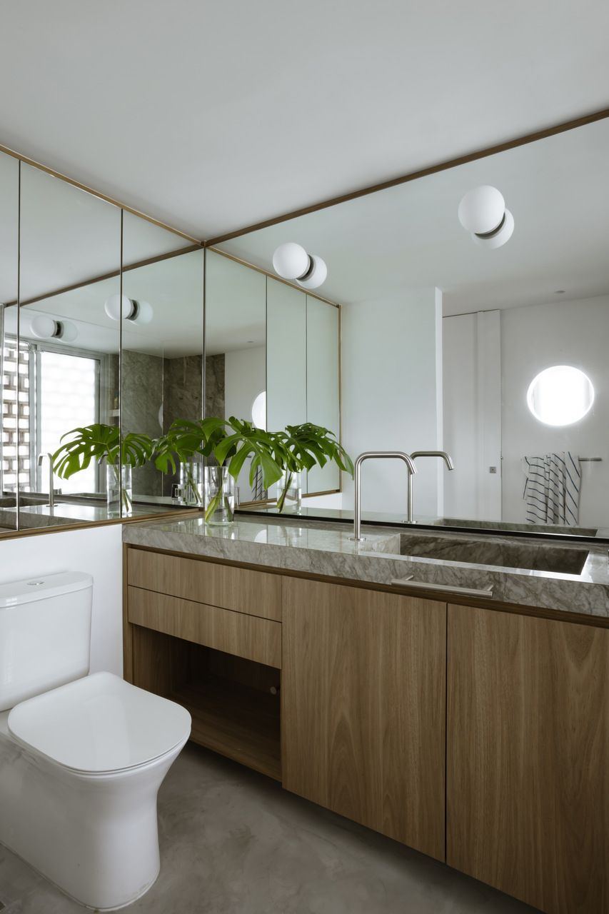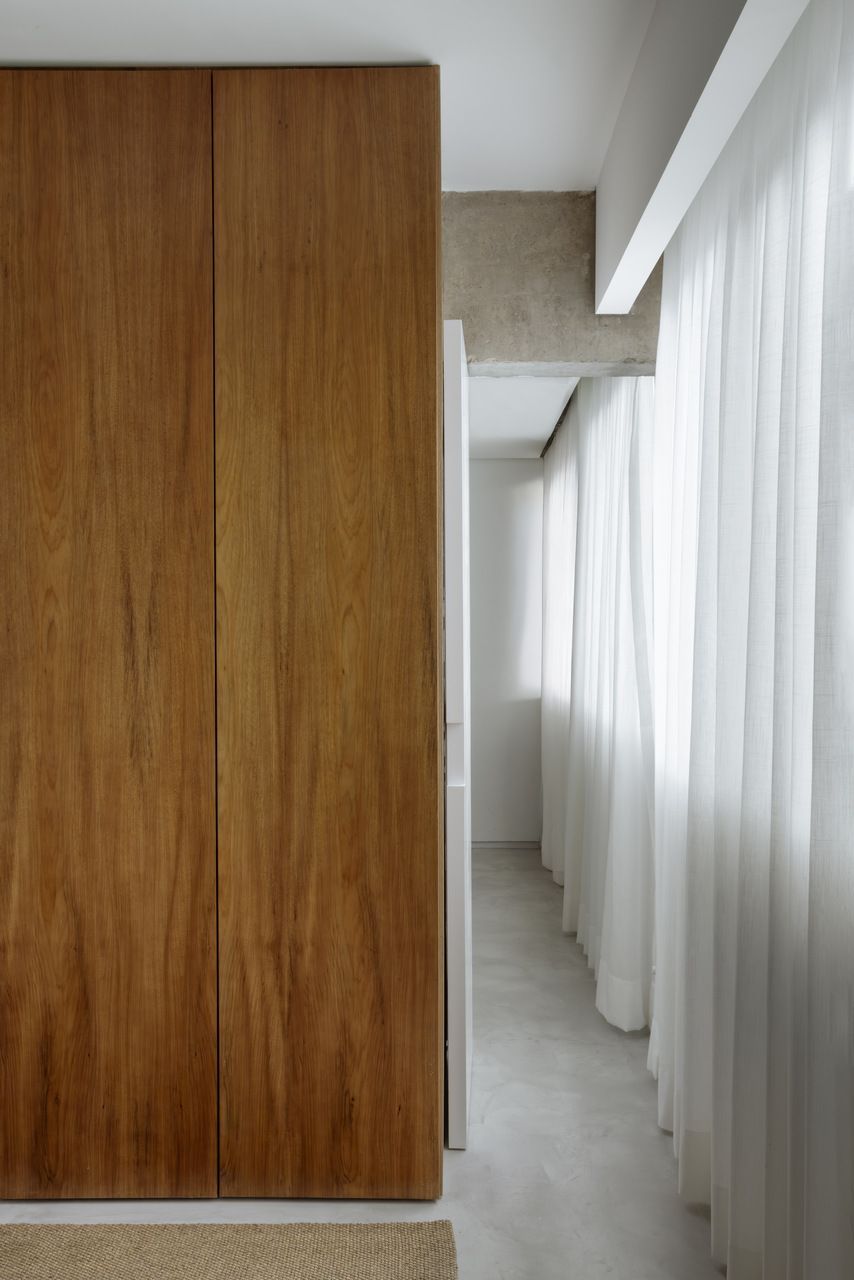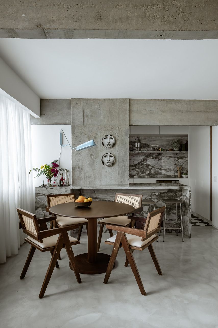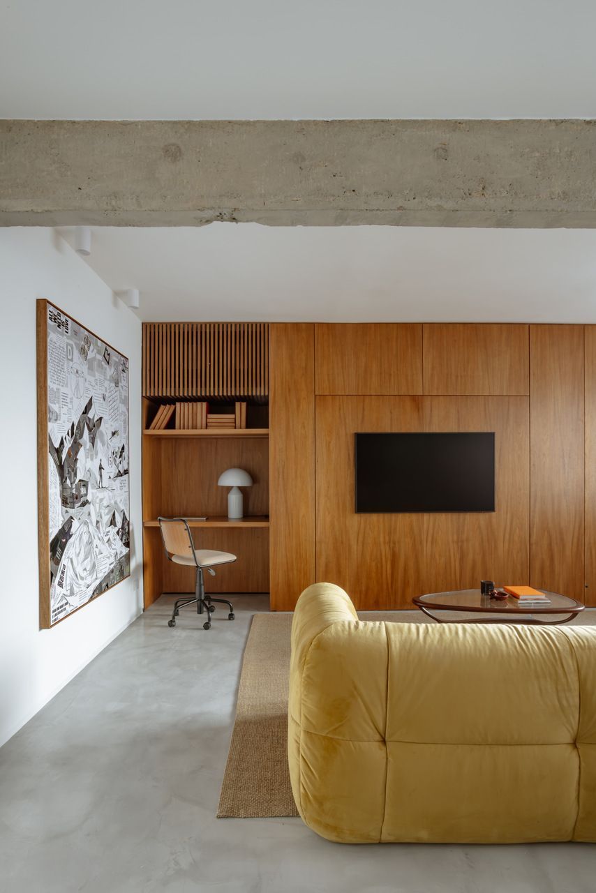 “Morar aqui me conecta todos os dias com a essência do Brasil. A combinação do concreto aparente com o freijó cria uma base muito calma, e a mistura de móveis antigos com o sofá mais moderno dá ao espaço uma personalidade que realmente me faz sentir em casa.”