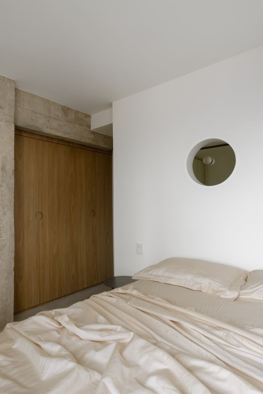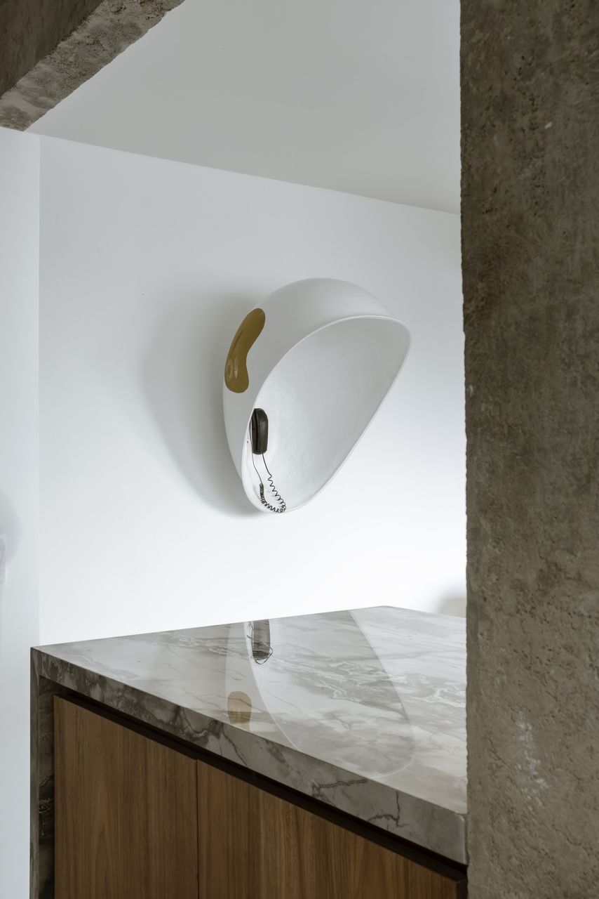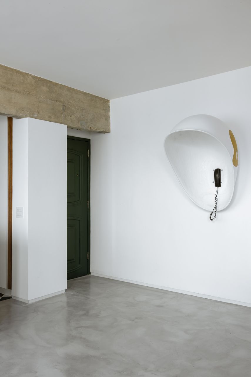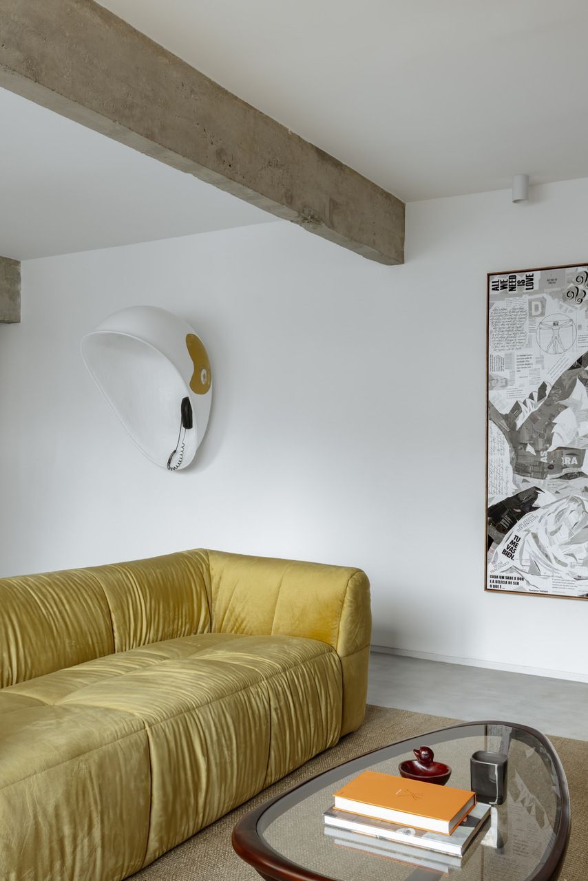 Na decoração, objetos trazidos da Colômbia — país de origem do cliente — se misturam a peças de design brasileiro, reforçando o caráter híbrido e afetivo do projeto. O grande protagonista da sala é o orelhão branco, criado por Chu Ming Silveira em 1971, incorporado desde o briefing como peça funcional e escultural. No quarto, a parede curva que envolve a cama cria uma sensação de acolhimento, enquanto na cozinha e no dormitório os elementos estruturais aparentes assumem papel decorativo.