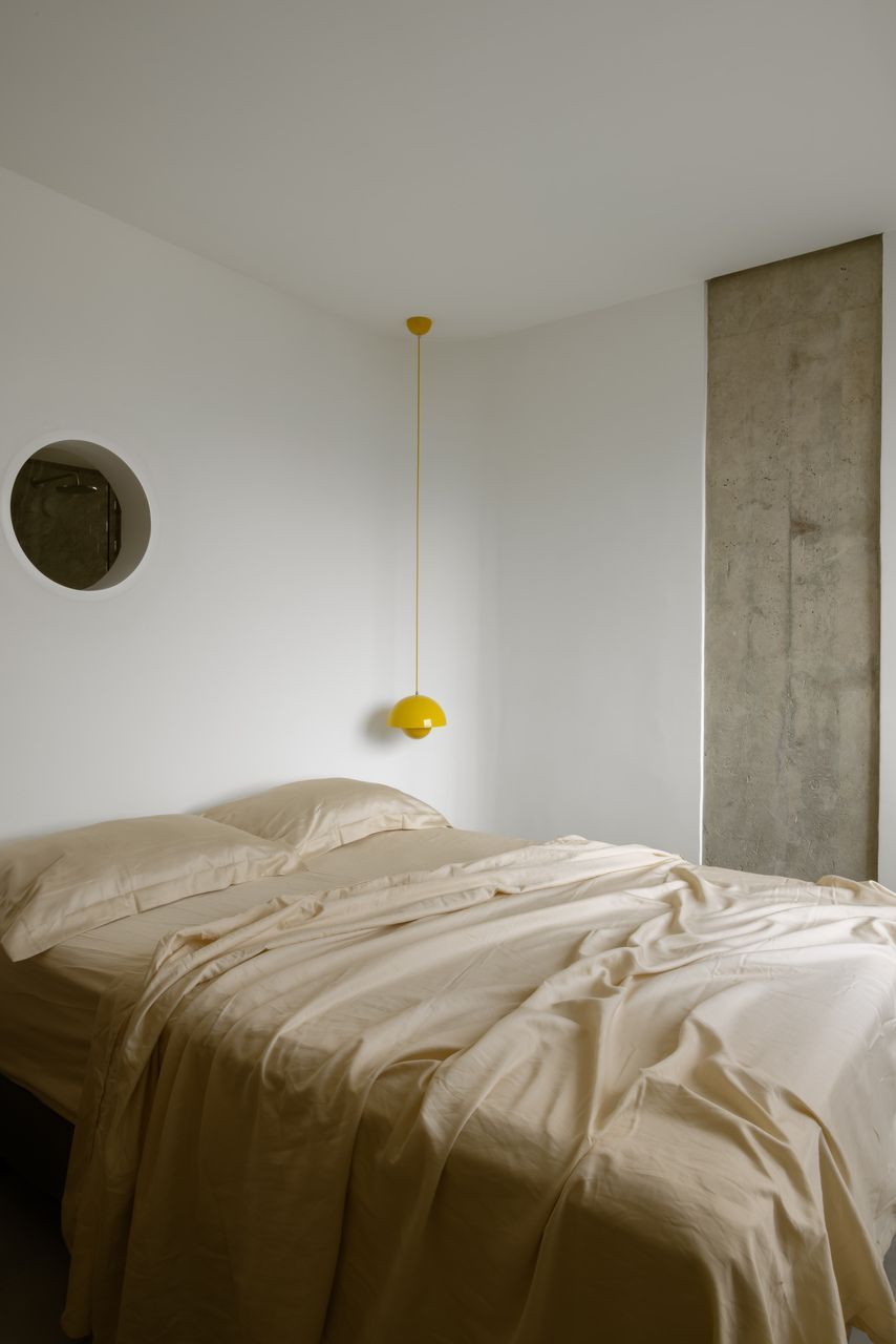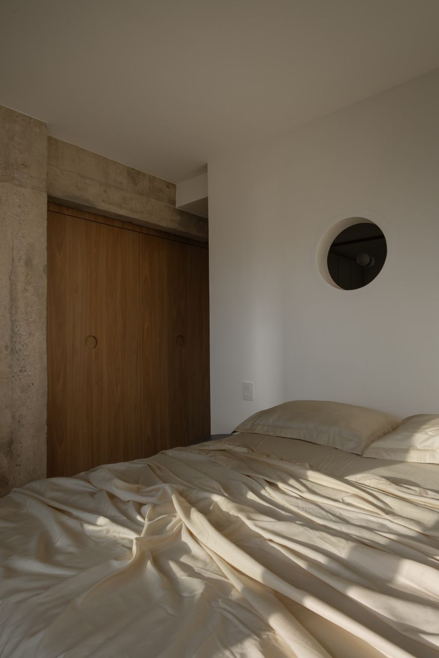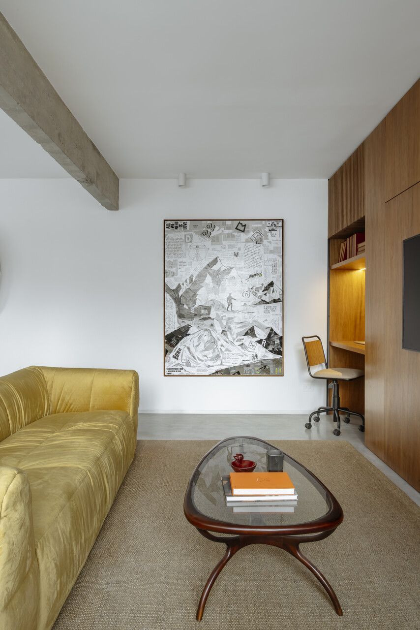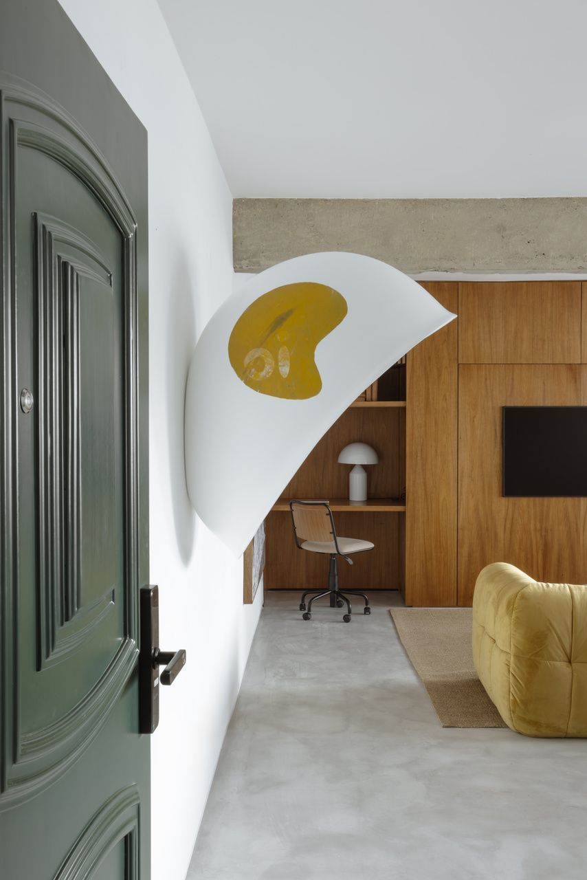 Na decoração, objetos trazidos da Colômbia — país de origem do cliente — se misturam a peças de design brasileiro, reforçando o caráter híbrido e afetivo do projeto. O grande protagonista da sala é o orelhão branco, criado por Chu Ming Silveira em 1971, incorporado desde o briefing como peça funcional e escultural. No quarto, a parede curva que envolve a cama cria uma sensação de acolhimento, enquanto na cozinha e no dormitório os elementos estruturais aparentes assumem papel decorativo.