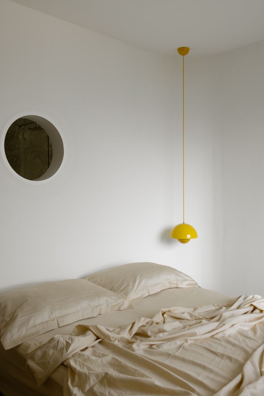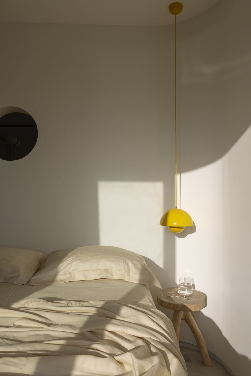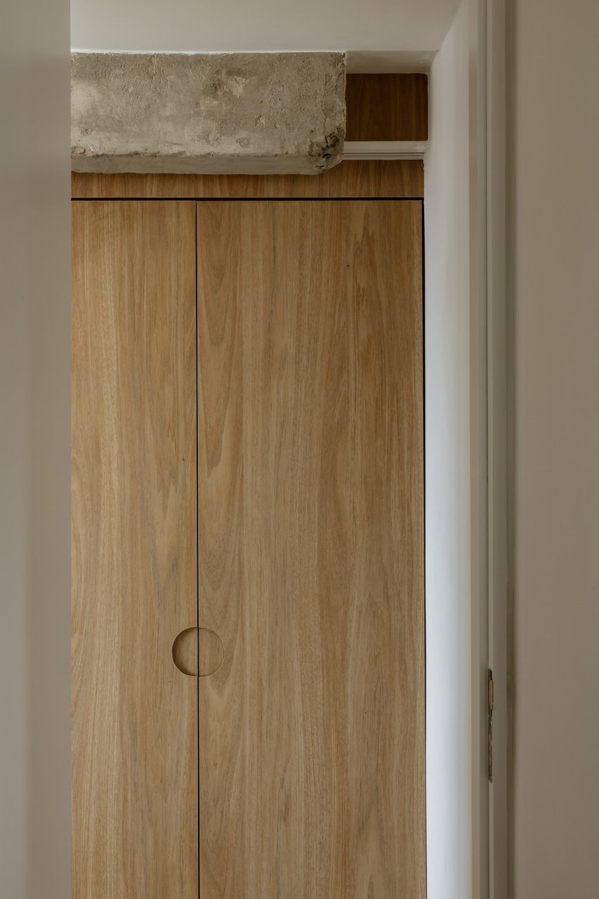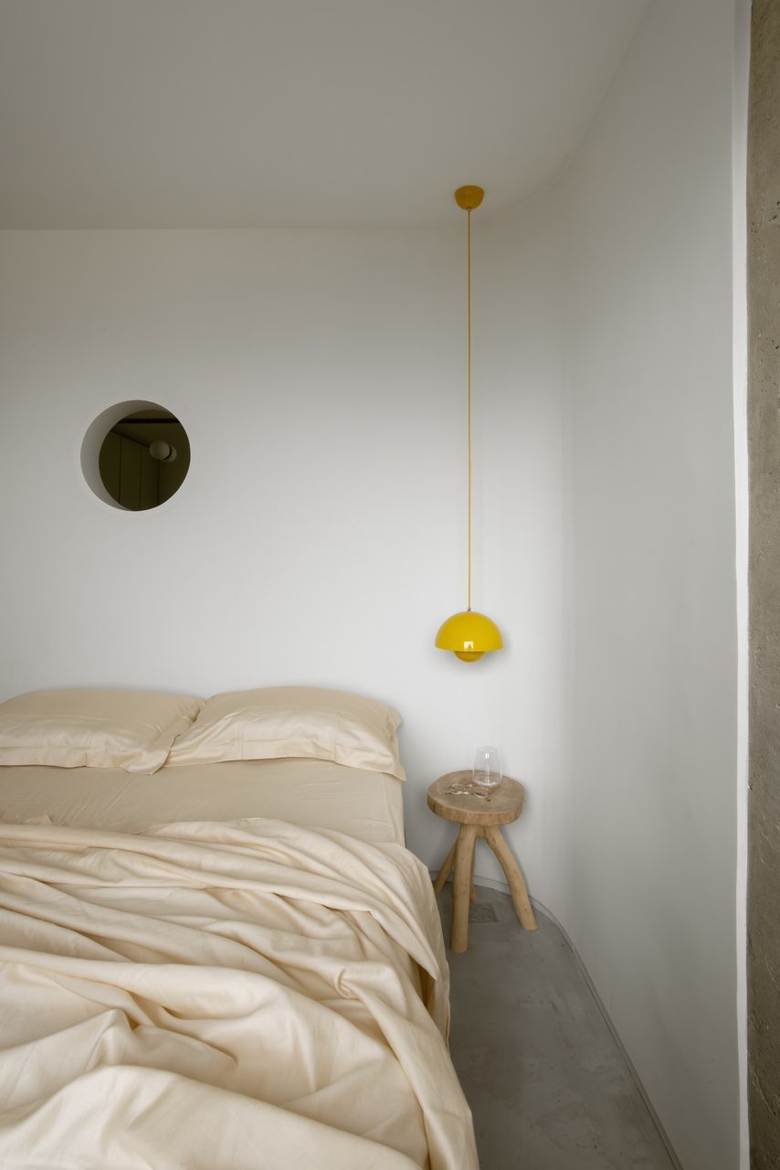 Na decoração, objetos trazidos da Colômbia — país de origem do cliente — se misturam a peças de design brasileiro, reforçando o caráter híbrido e afetivo do projeto. O grande protagonista da sala é o orelhão branco, criado por Chu Ming Silveira em 1971, incorporado desde o briefing como peça funcional e escultural. No quarto, a parede curva que envolve a cama cria uma sensação de acolhimento, enquanto na cozinha e no dormitório os elementos estruturais aparentes assumem papel decorativo.