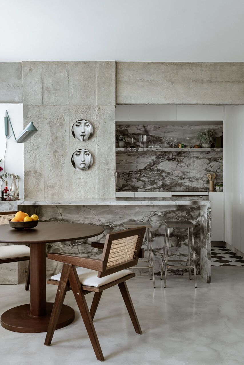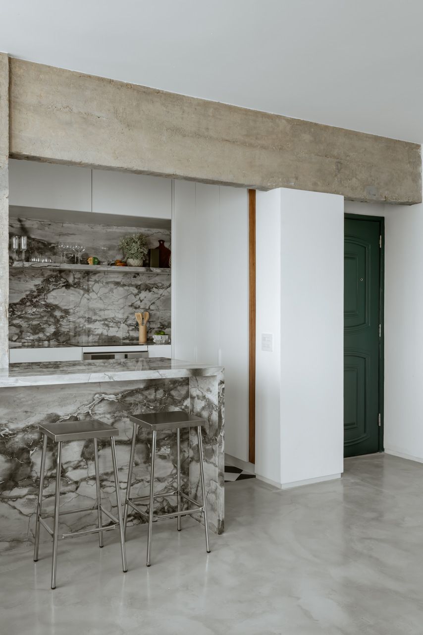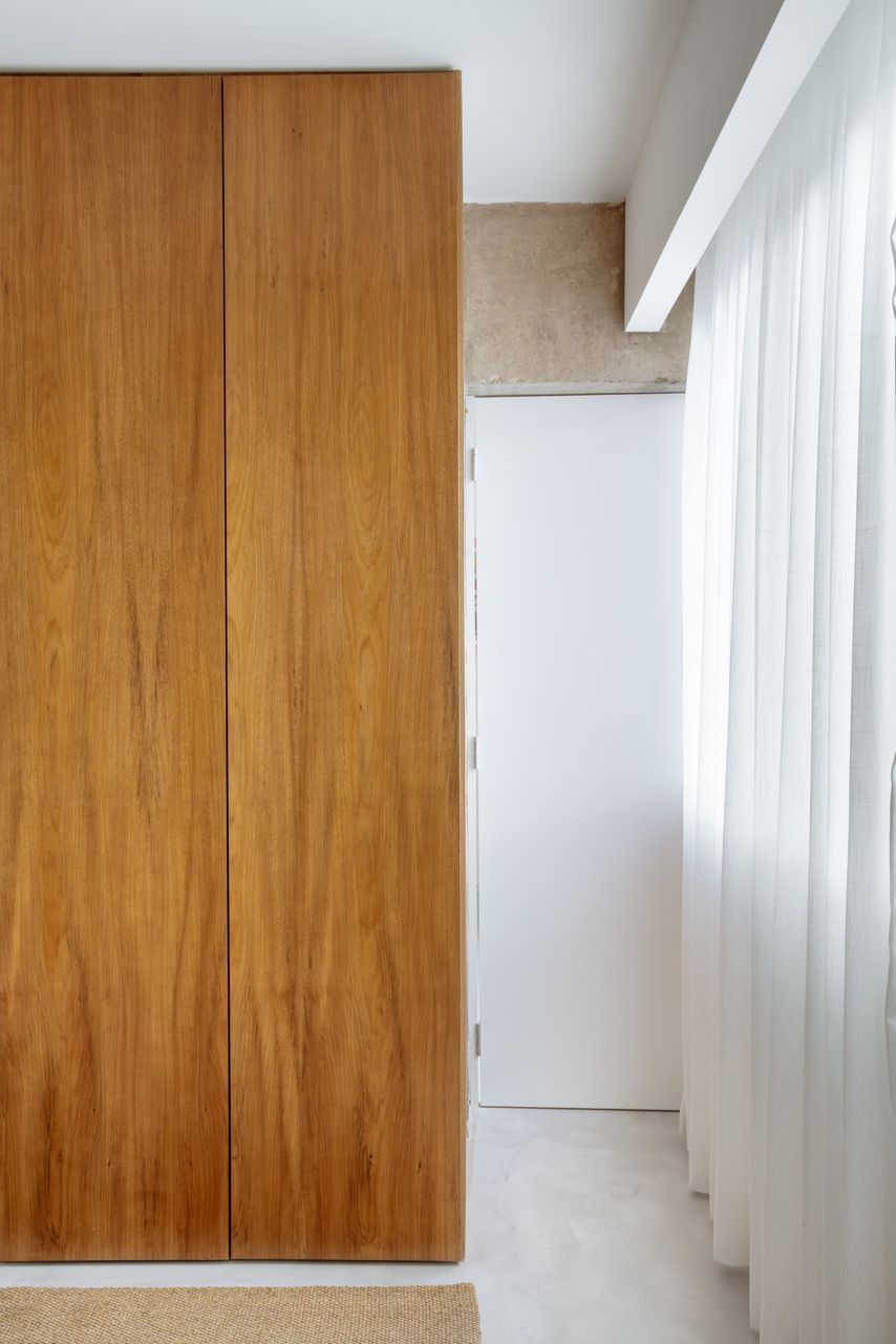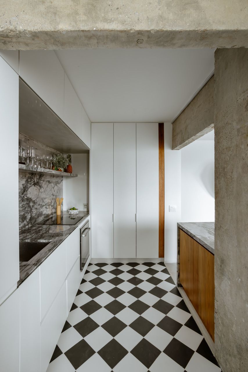 A paleta de materiais equilibra neutralidade e textura. O piso de microcimento, os quartzitos da cozinha e dos banhos e o concreto aparente criam uma base contínua e serena, enquanto o freijó aquece o ambiente com sua presença pontual e funcional. Na cozinha, o preto e branco assume um caráter quase gráfico, como se a bancada fosse um nicho escavado nas paredes claras. O piso xadrez, por sua vez, traz a bossa das ruas do Rio para dentro do apartamento e dialoga com os tons das pedras naturais.