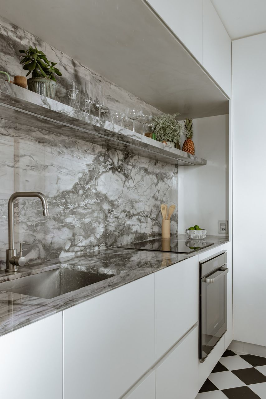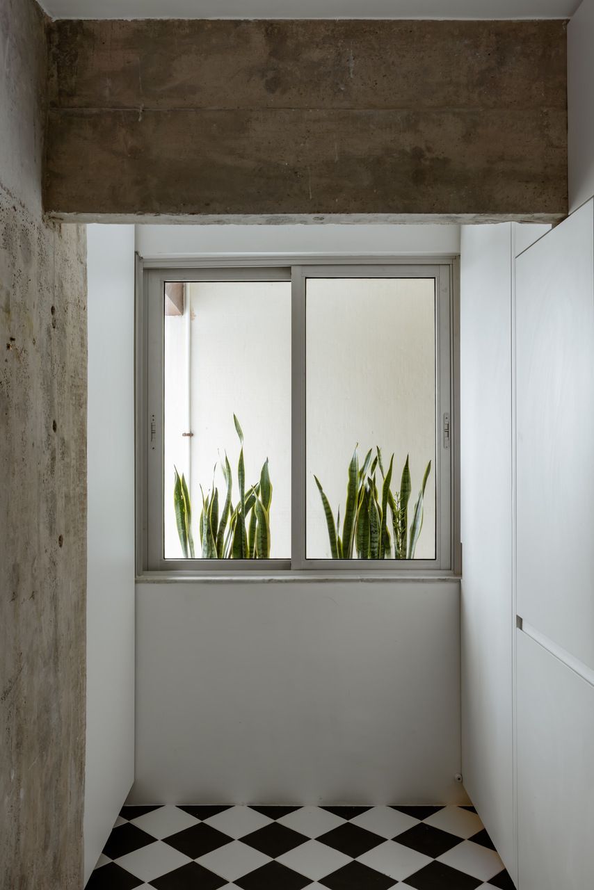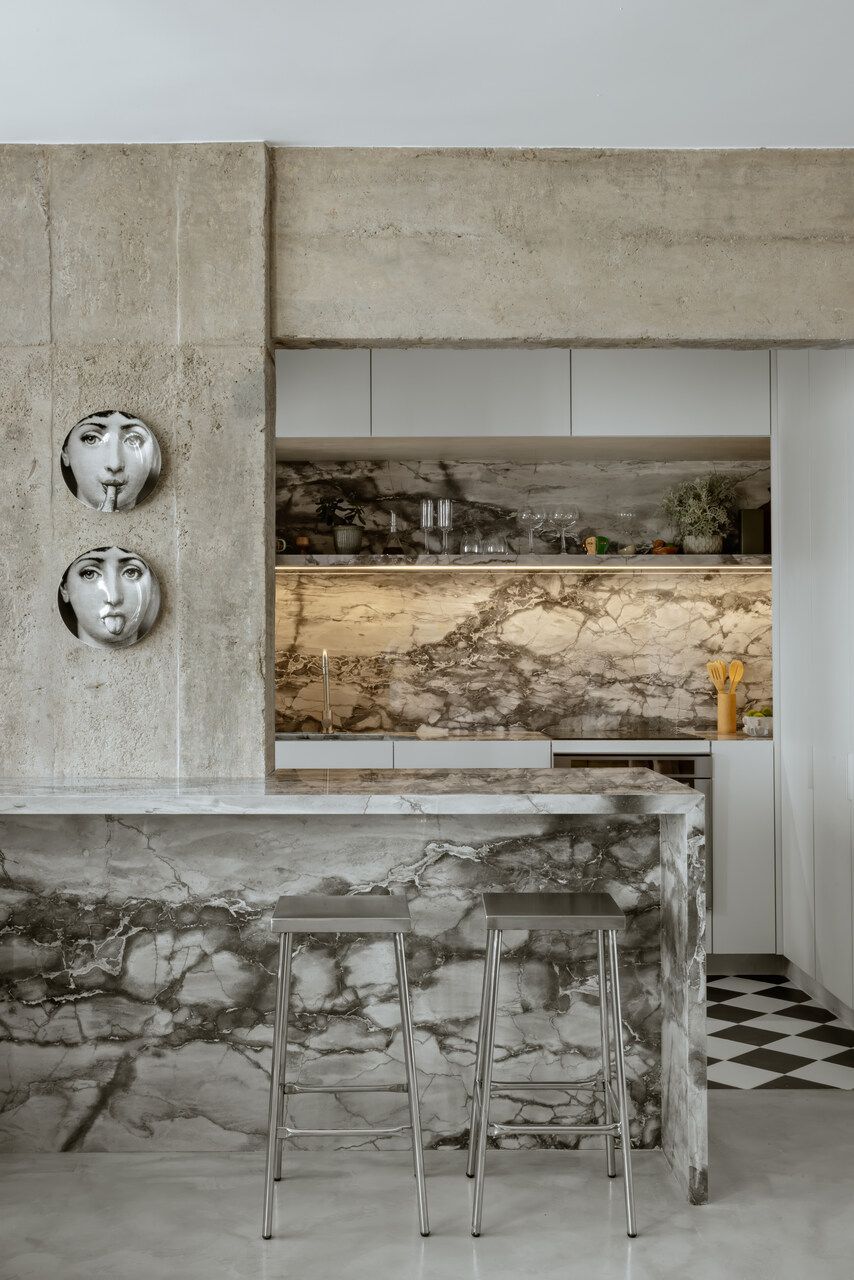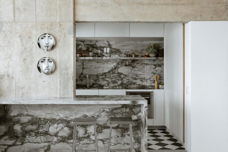 A paleta de materiais equilibra neutralidade e textura. O piso de microcimento, os quartzitos da cozinha e dos banhos e o concreto aparente criam uma base contínua e serena, enquanto o freijó aquece o ambiente com sua presença pontual e funcional. Na cozinha, o preto e branco assume um caráter quase gráfico, como se a bancada fosse um nicho escavado nas paredes claras. O piso xadrez, por sua vez, traz a bossa das ruas do Rio para dentro do apartamento e dialoga com os tons das pedras naturais.