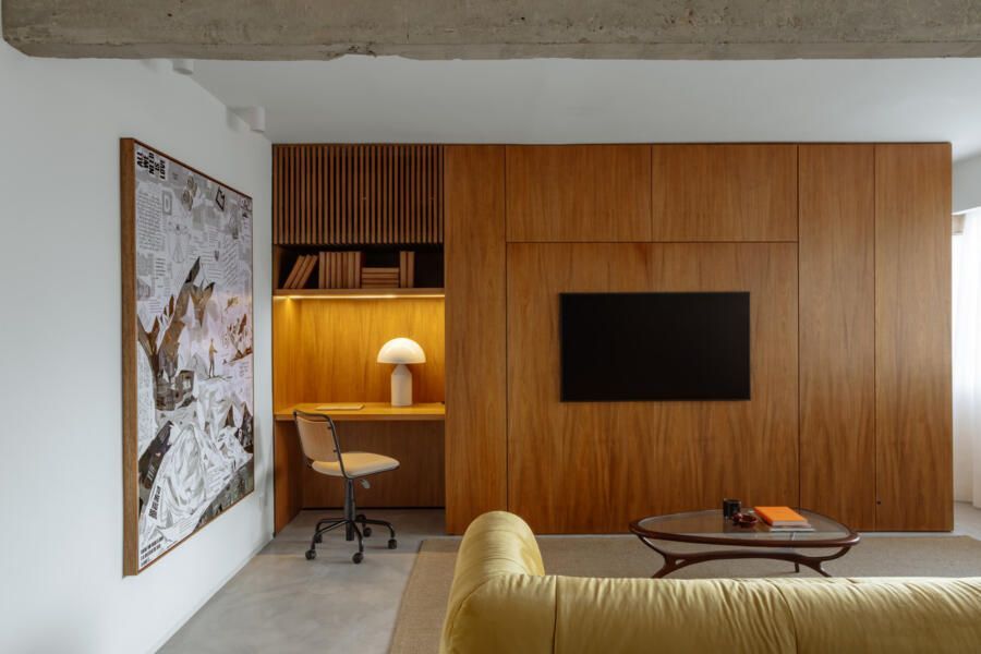 No centro do apartamento, cozinha e living se relacionam de forma aberta, enquanto um grande volume de marcenaria substitui paredes de alvenaria e cumpre dupla função: de um lado, abriga closet e escritório; do outro, organiza o painel de TV. Esse gesto garante fluidez espacial e otimiza cada centímetro do imóvel. Nos fundos, a área de serviço foi reduzida ao essencial, liberando espaço para o novo banheiro e reforçando a lógica de aproveitamento inteligente da planta.