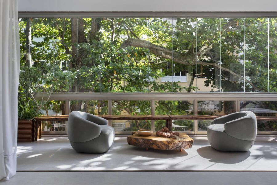 “O imóvel original tinha uma varanda, que foi integrada à nova sala e recebeu fechamento em vidro. As esquadrias da sala foram refeitas, permitindo abertura total e garantindo uma maior integração com o ambiente da varanda.”