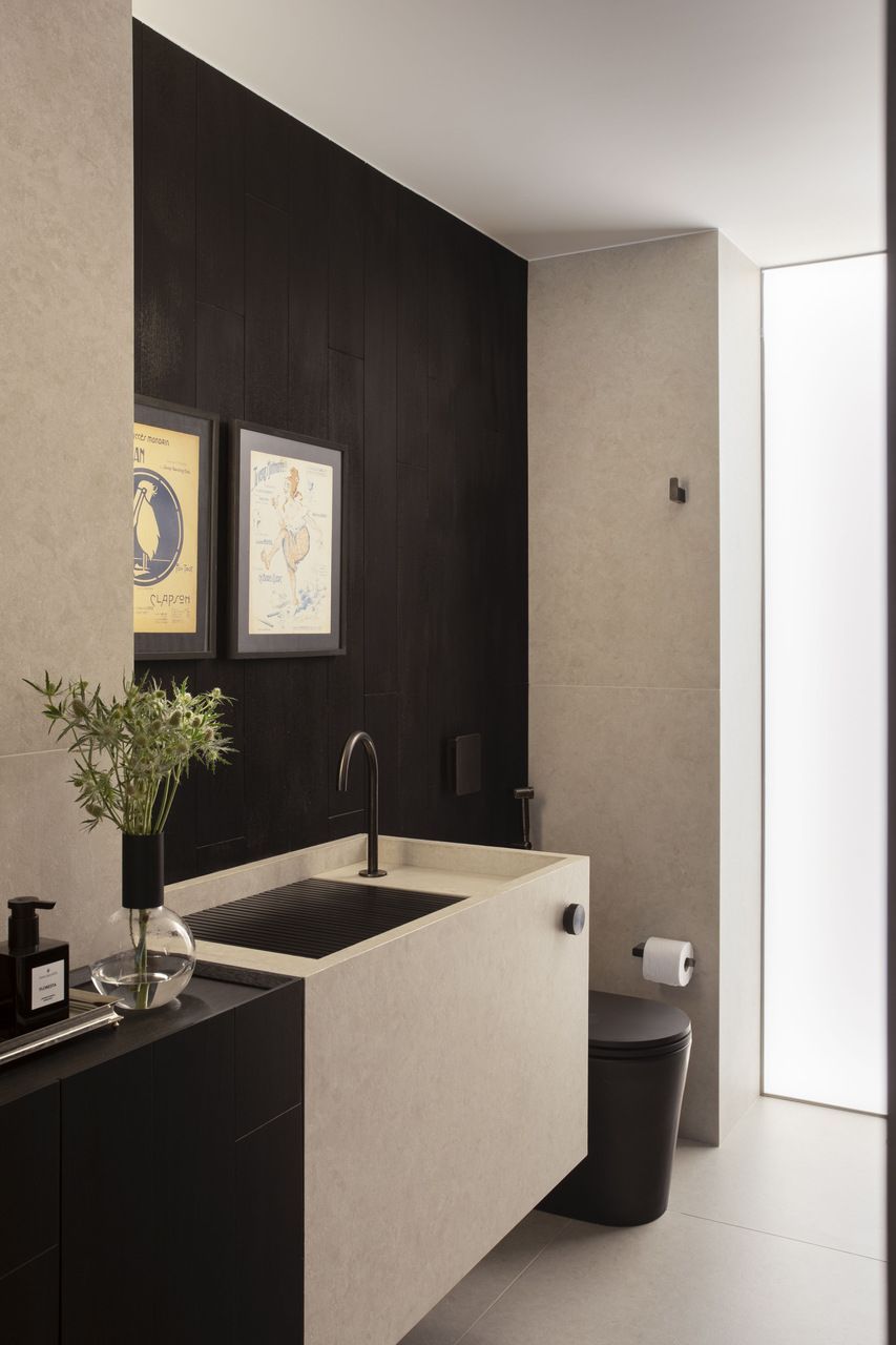 Entre os pontos de destaque, a adega do piso ao teto materializa um desejo especial do morador. Com portas de vidro e iluminação dedicada, ela participa visualmente das áreas sociais, quase como uma escultura luminosa. No lavabo, surge um contraste dramático: os painéis em madeira tratados com a técnica japonesa Shou Sugi Ban criam profundidade, enquanto a bancada em porcelanato italiano de grande formato reforça o ar contemporâneo da composição.