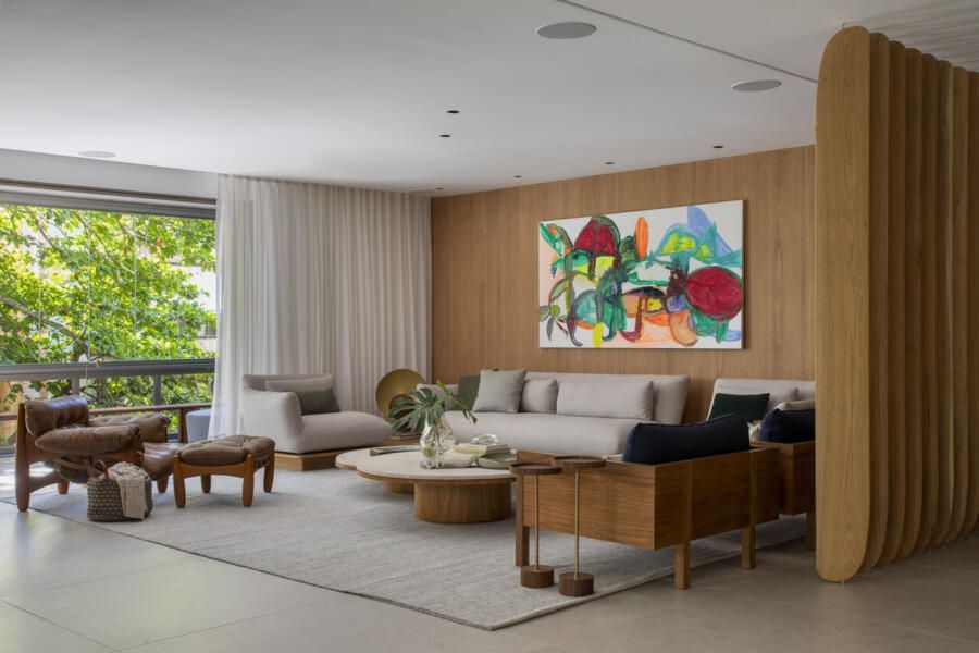 No estar, os arquitetos apostaram em uma combinação sofisticada de texturas: paredes revestidas em painéis de freijó natural e um brise articulado de desenho orgânico, criado exclusivamente para o projeto, conduzem suavemente o olhar do hall para os ambientes internos. O resultado é um conjunto fluido, que reforça a atmosfera calorosa que um apartamento contemporâneo pede.