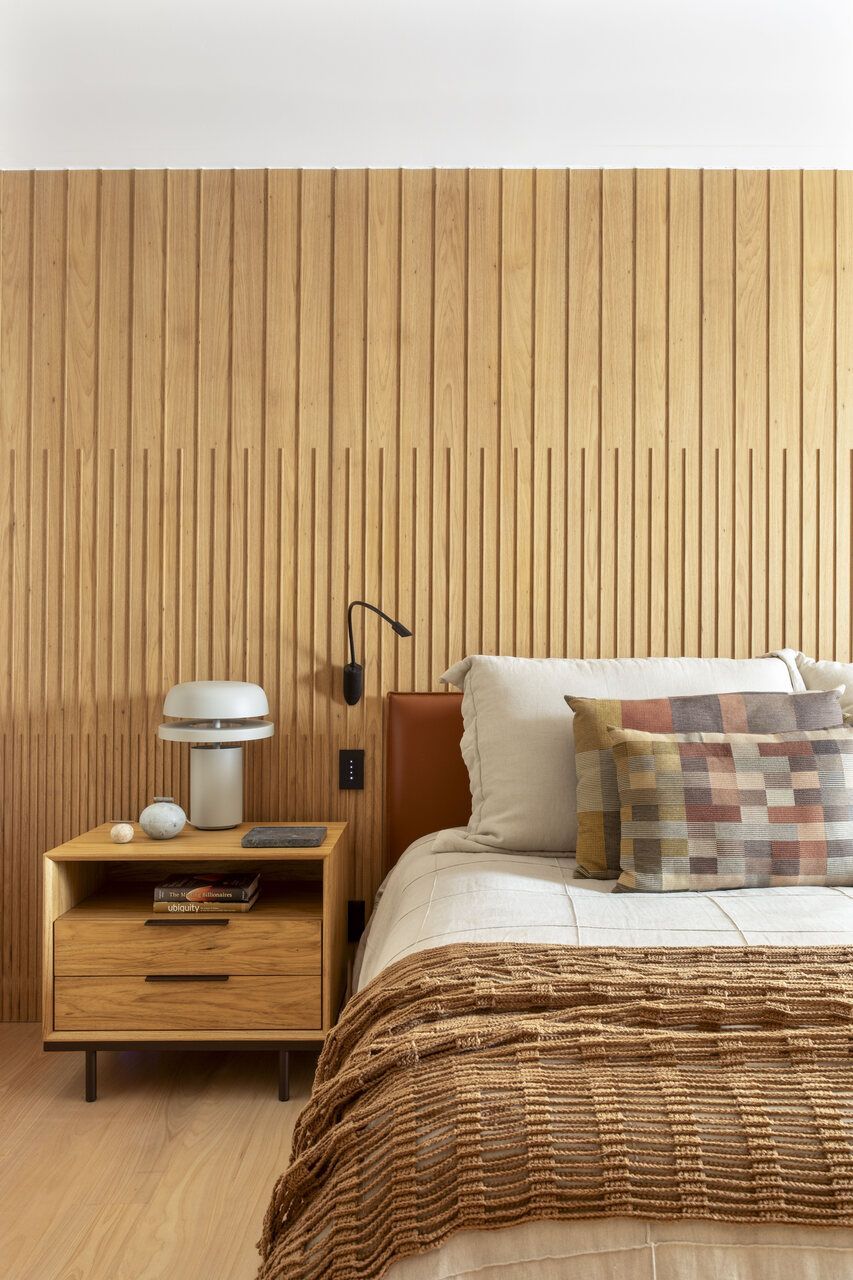 A área íntima foi desenhada com o mesmo cuidado. O piso em Tauari natural aquece os quartos, que receberam marcenarias específicas para atender às necessidades dos adolescentes e do bebê recém-chegado. Na suíte principal, um painel de freijó com ripas geométricas e uma estante que integra escrivaninha e apoio de TV equilibram sobriedade e conforto. Ali, peças de design brasileiro contemporâneo convivem com obras de arte da coleção do casal, dando personalidade a um lar que celebra o bom desenho e o viver bem.