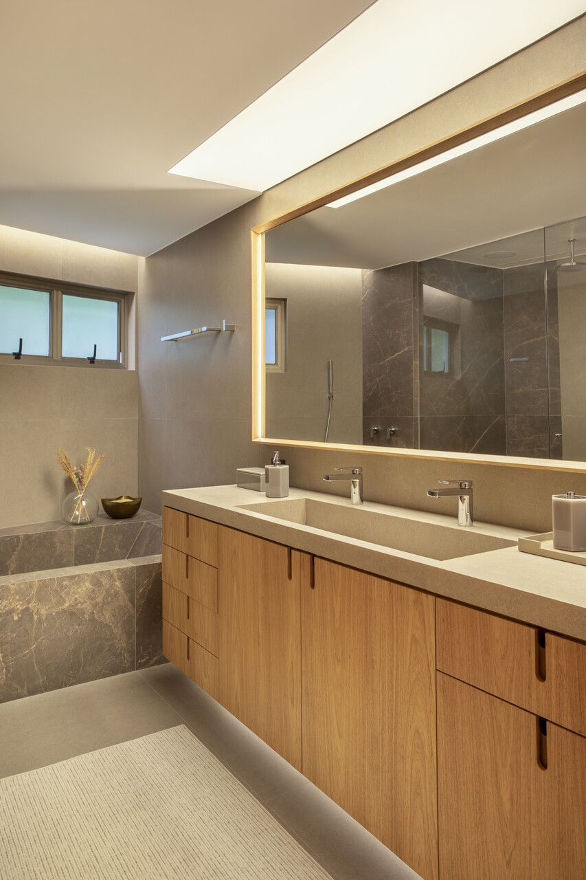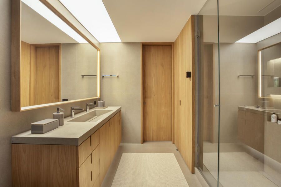 Entre os pontos de destaque, a adega do piso ao teto materializa um desejo especial do morador. Com portas de vidro e iluminação dedicada, ela participa visualmente das áreas sociais, quase como uma escultura luminosa. No lavabo, surge um contraste dramático: os painéis em madeira tratados com a técnica japonesa Shou Sugi Ban criam profundidade, enquanto a bancada em porcelanato italiano de grande formato reforça o ar contemporâneo da composição.