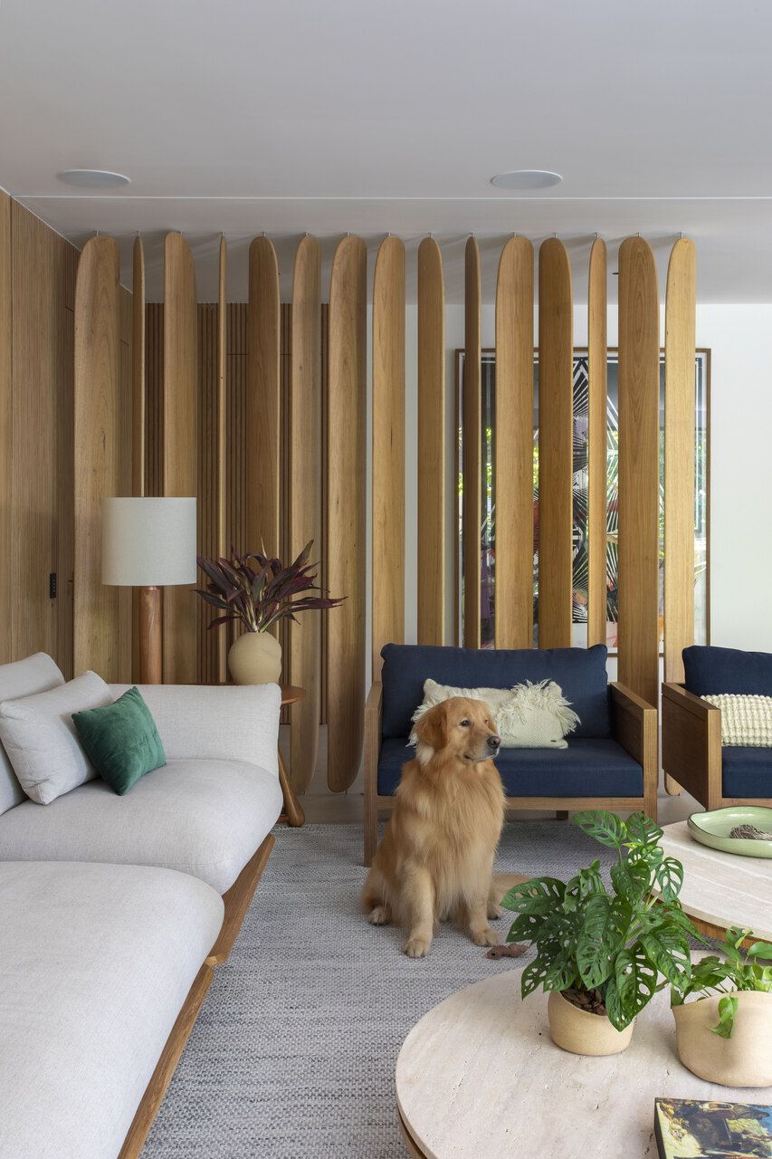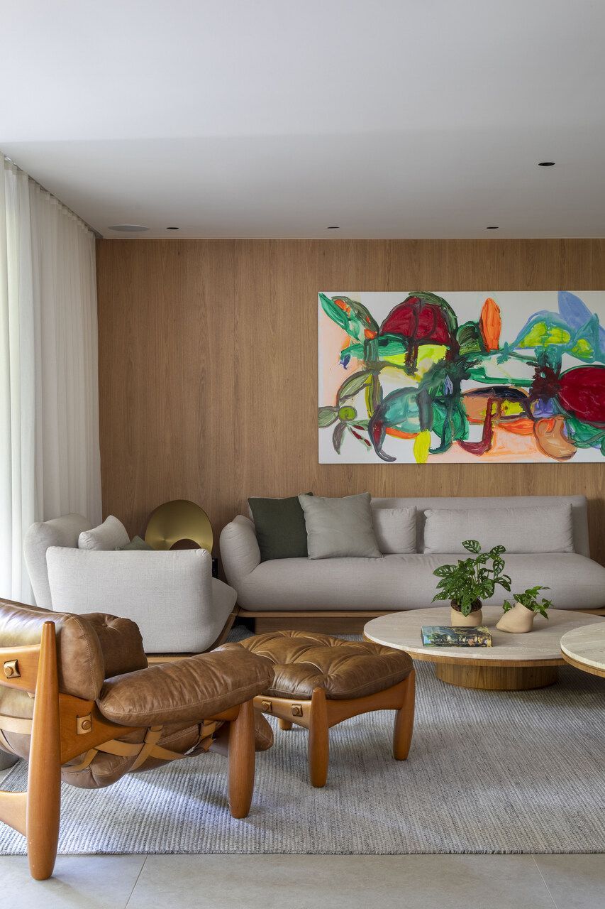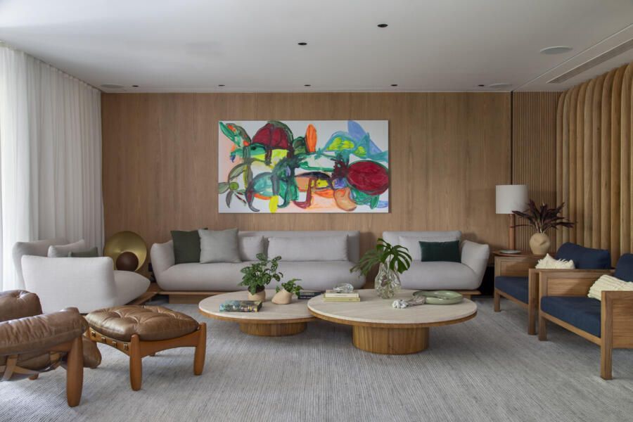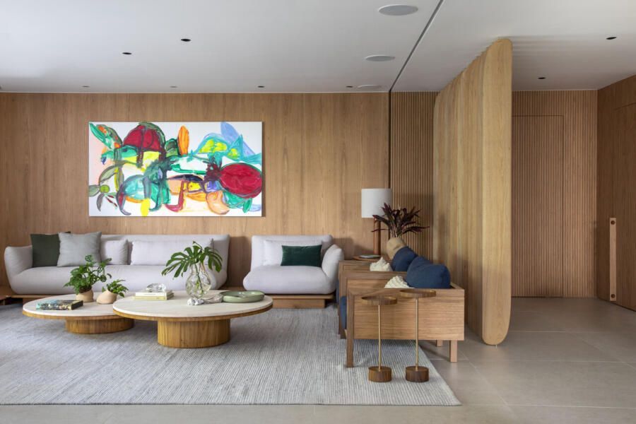 No estar, os arquitetos apostaram em uma combinação sofisticada de texturas: paredes revestidas em painéis de freijó natural e um brise articulado de desenho orgânico, criado exclusivamente para o projeto, conduzem suavemente o olhar do hall para os ambientes internos. O resultado é um conjunto fluido, que reforça a atmosfera calorosa que um apartamento contemporâneo pede.