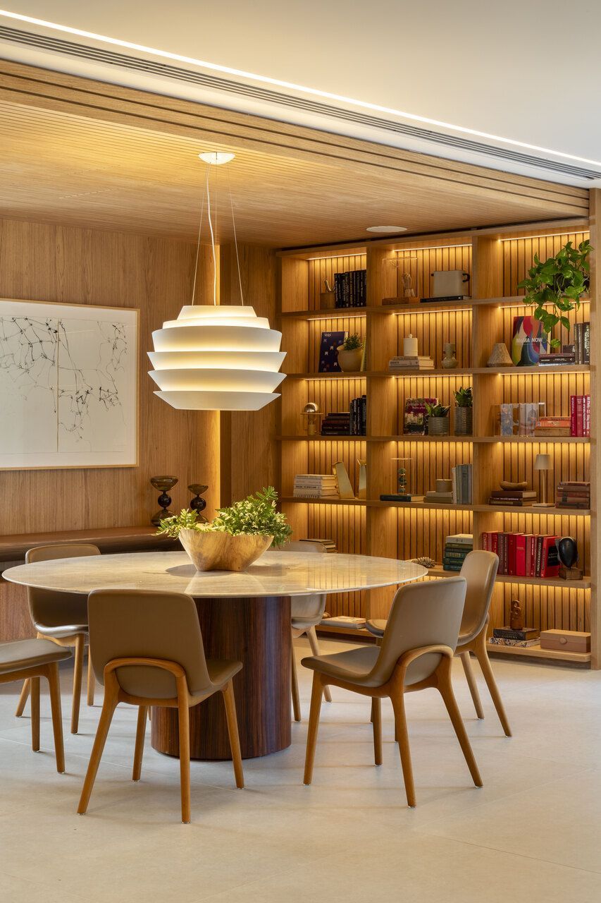 A sala de jantar, por sua vez, foi pensada para abraçar a convivência. Um conjunto de estantes sob medida e o teto ripado formam um volume contínuo que eleva a sensação de acolhimento, criando uma moldura visual perfeita para peças de design brasileiro e para a coleção de arte da família. A madeira aparece novamente como fio condutor, garantindo unidade e identidade ao projeto.