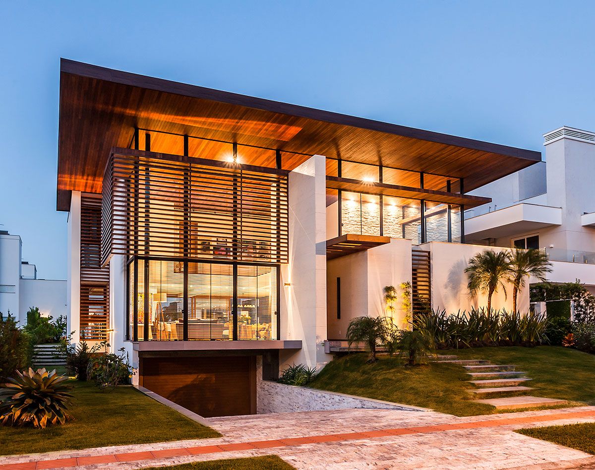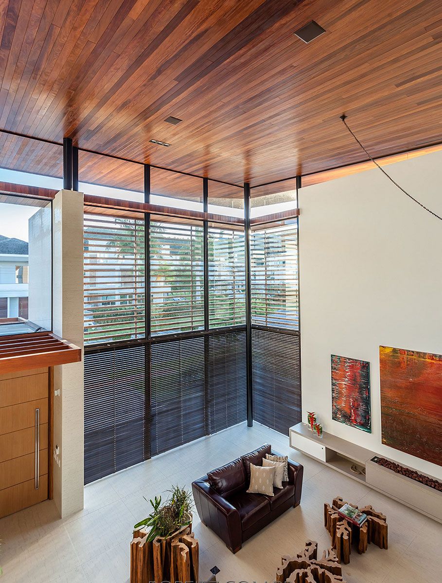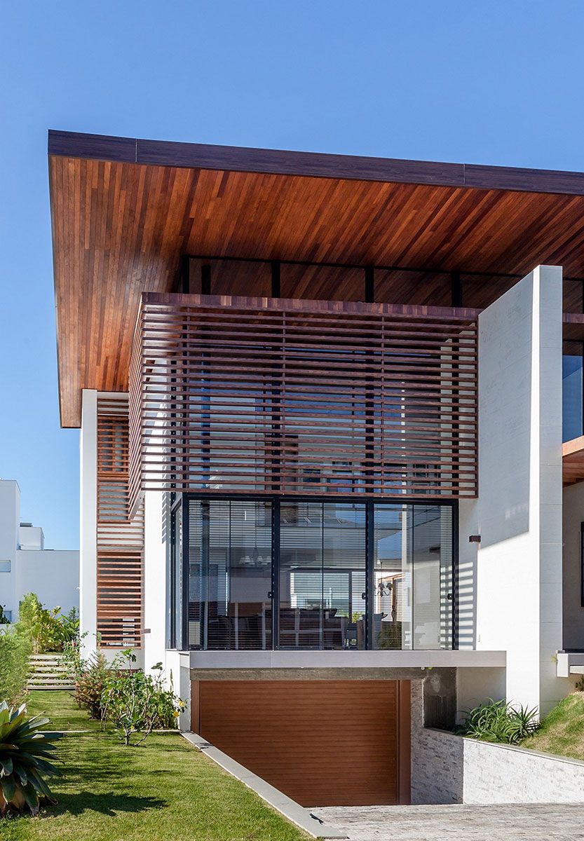 As amplas superfícies de vidro foram protegidas pelo quebra sol de alumínio na cor de madeira, que valoriza o entorno e permite a visualização de toda e região externa. A ventilação cruzada e o sistema de aquecimento solar também facilitam o abastecimento de água quente tanto na piscina quanto nos pontos de distribuição na casa.