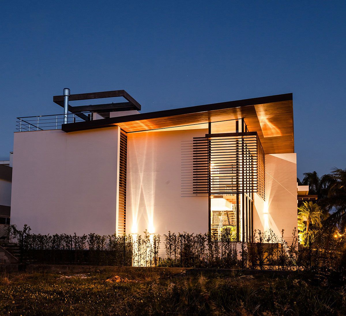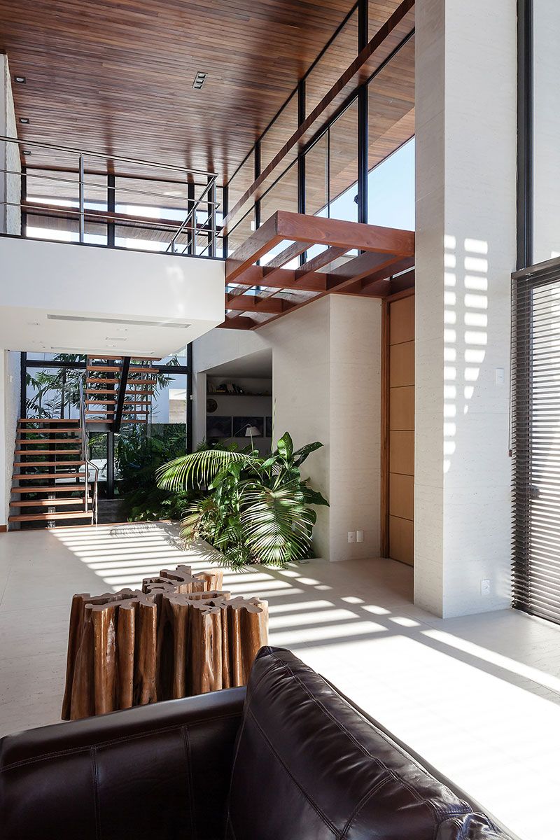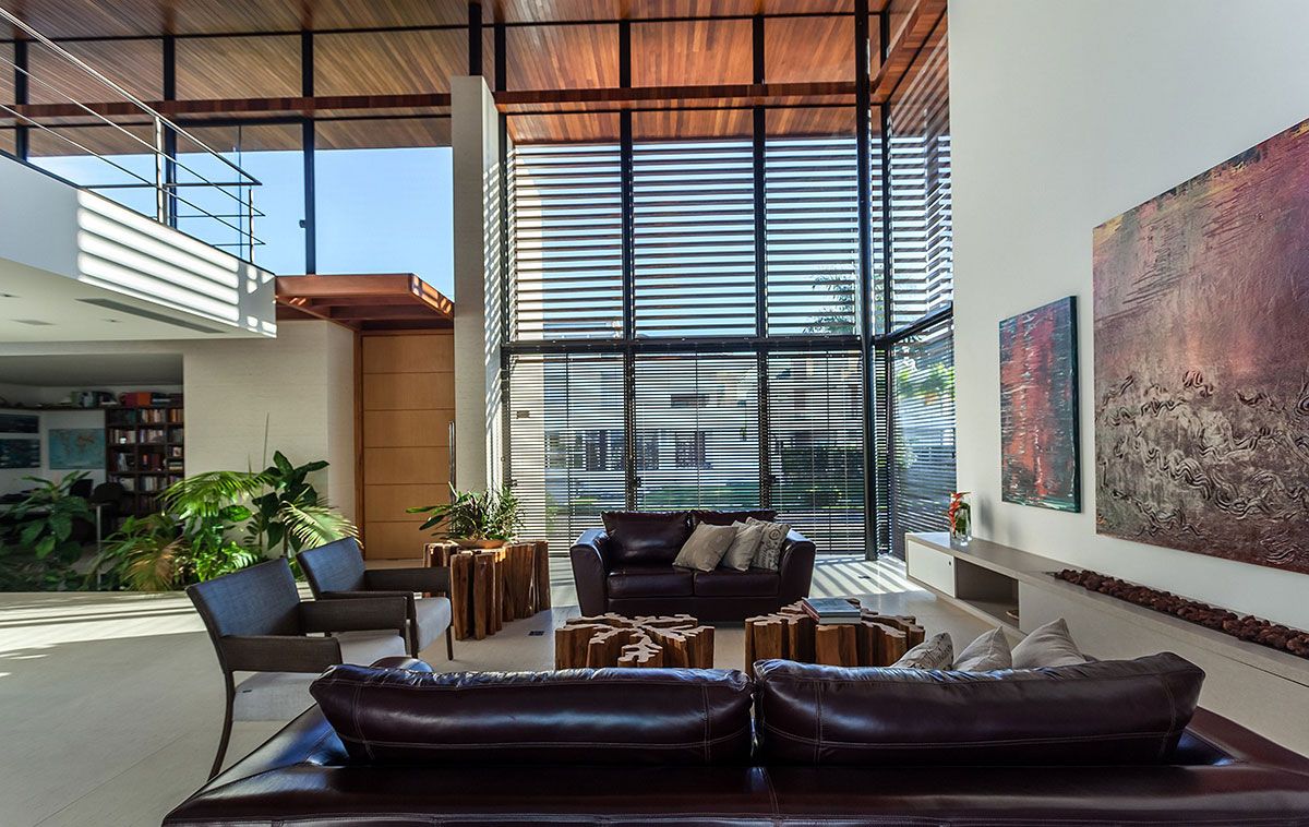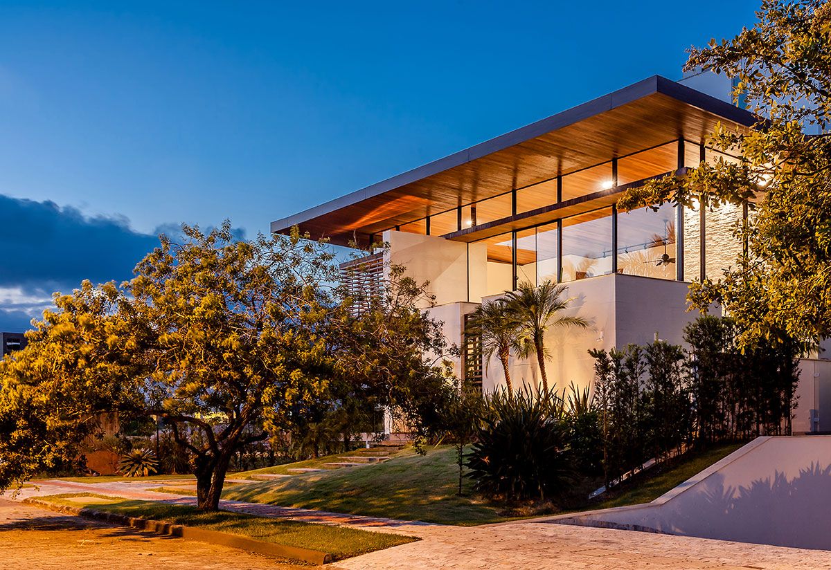 As amplas superfícies de vidro foram protegidas pelo quebra sol de alumínio na cor de madeira, que valoriza o entorno e permite a visualização de toda e região externa. A ventilação cruzada e o sistema de aquecimento solar também facilitam o abastecimento de água quente tanto na piscina quanto nos pontos de distribuição na casa.