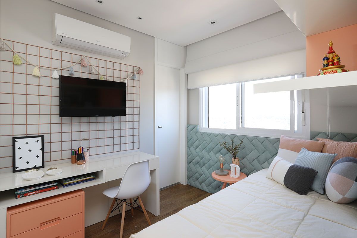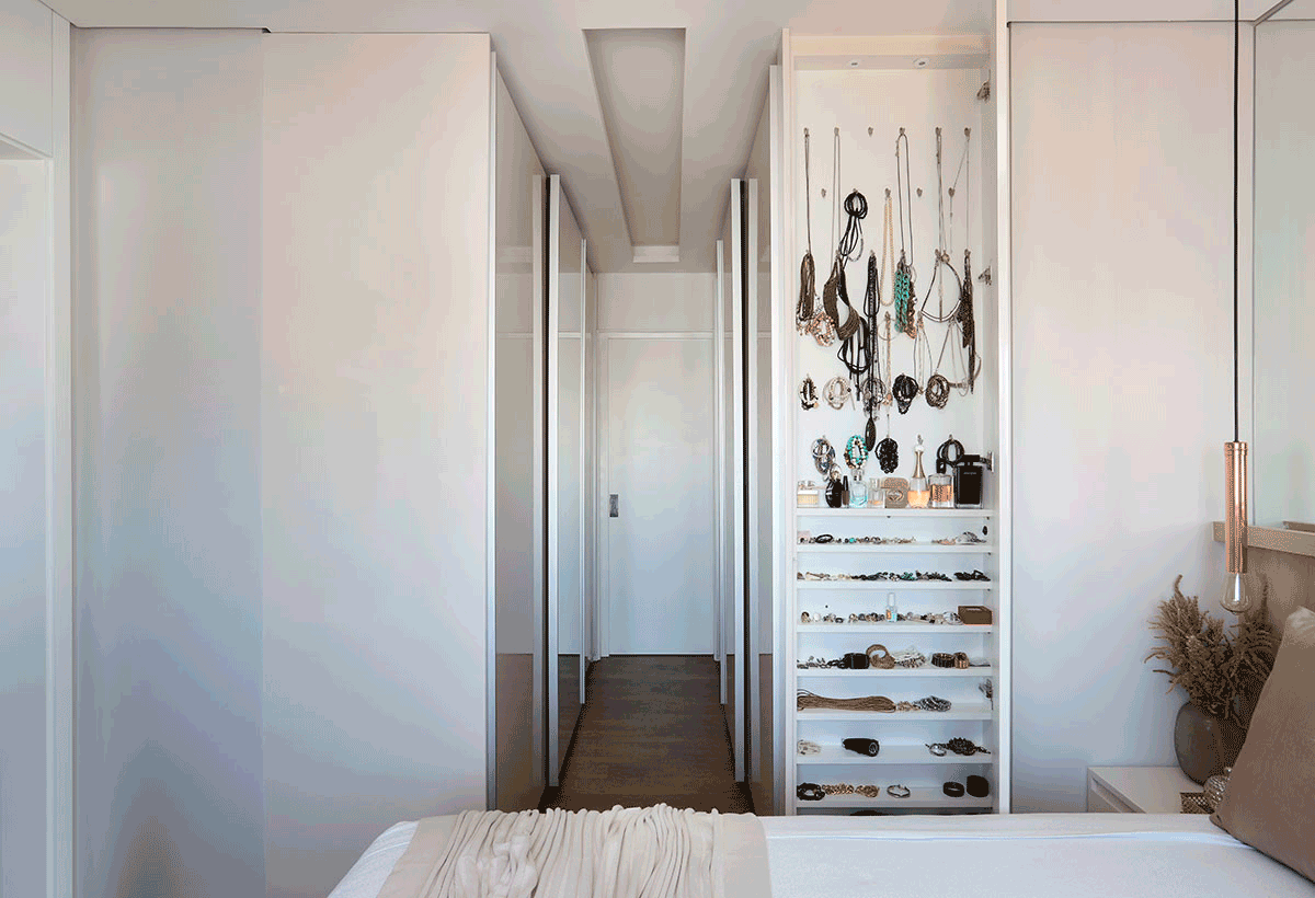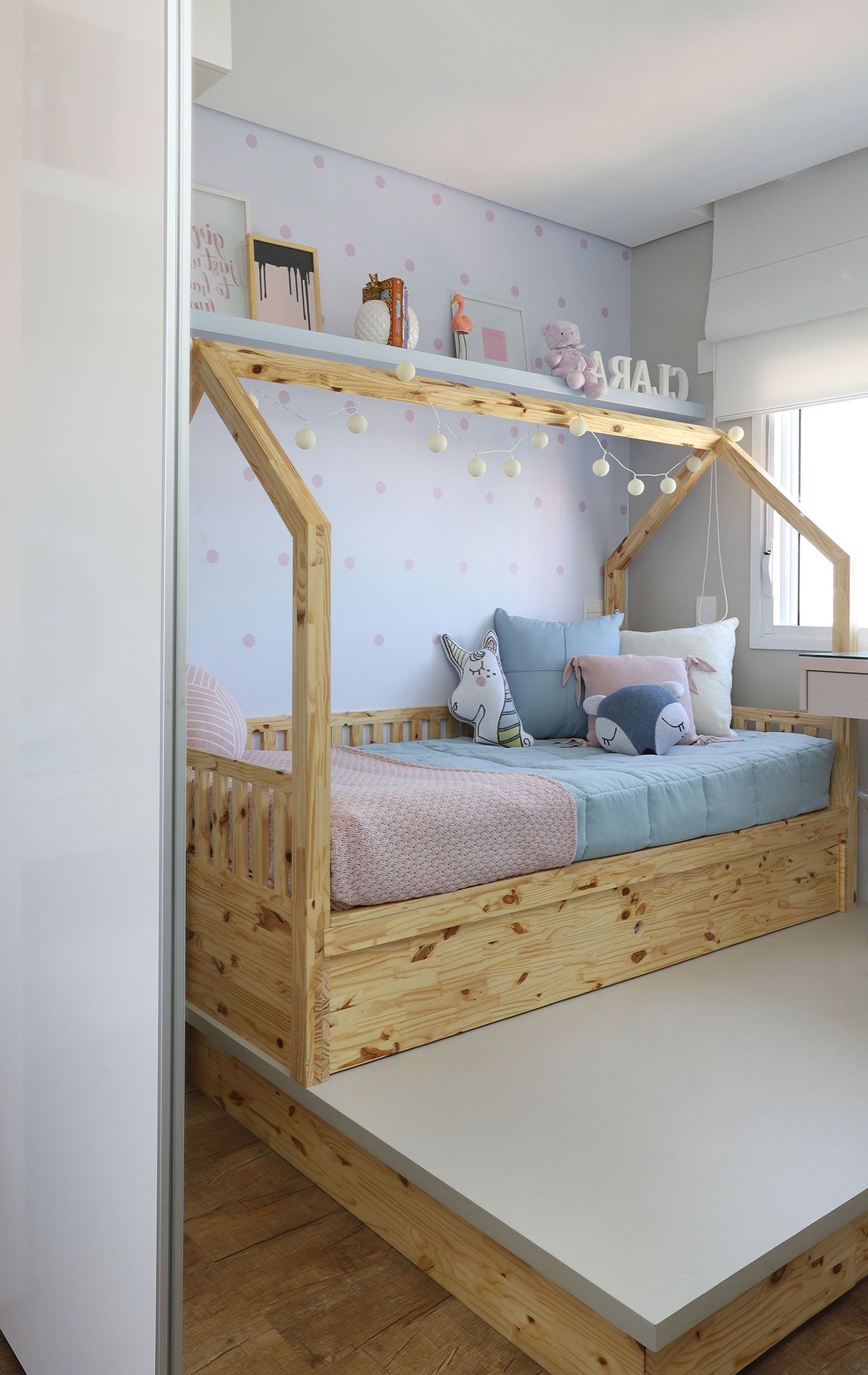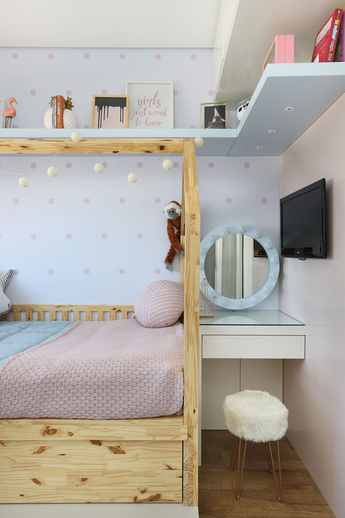 No quarto das filhas, o destaque fica para o móvel para bijoux na lateral armário e no quarto da caçula, um tablado em madeira com gavetinhas e uma casinha em madeira pinus com bicama.