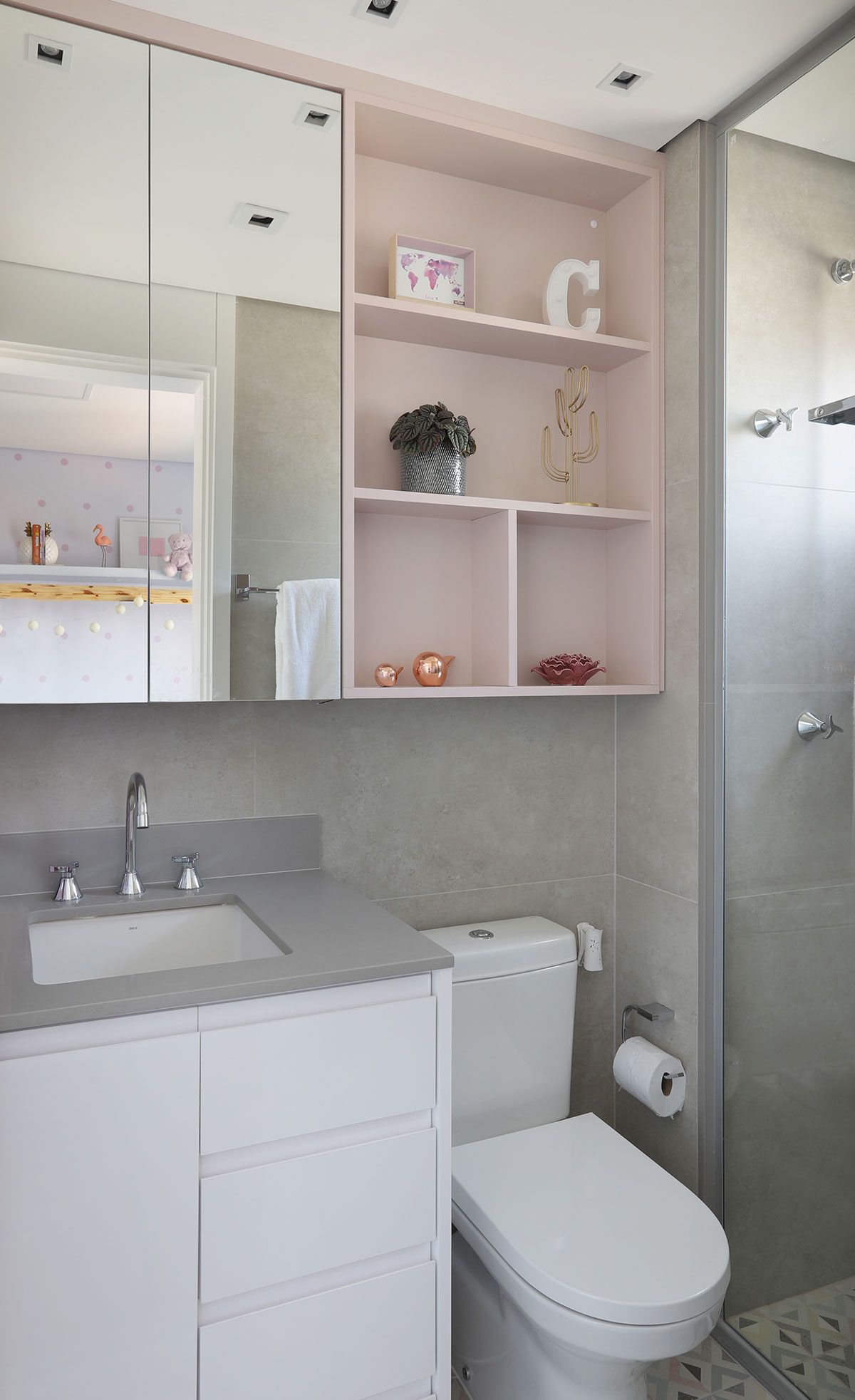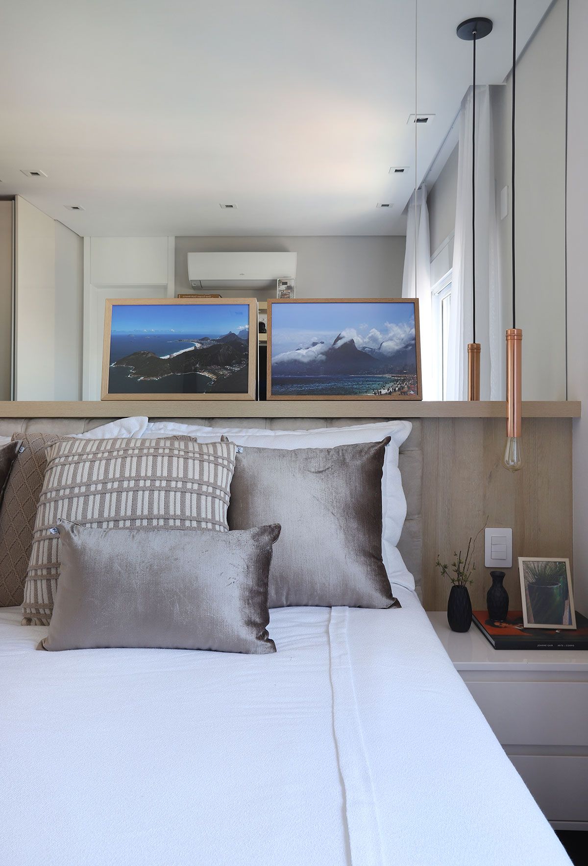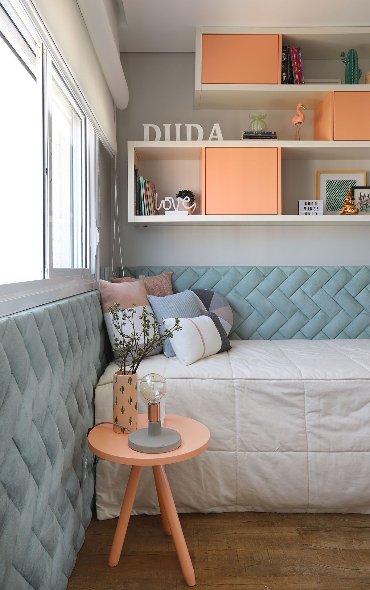 No quarto das filhas, o destaque fica para o móvel para bijoux na lateral armário e no quarto da caçula, um tablado em madeira com gavetinhas e uma casinha em madeira pinus com bicama.