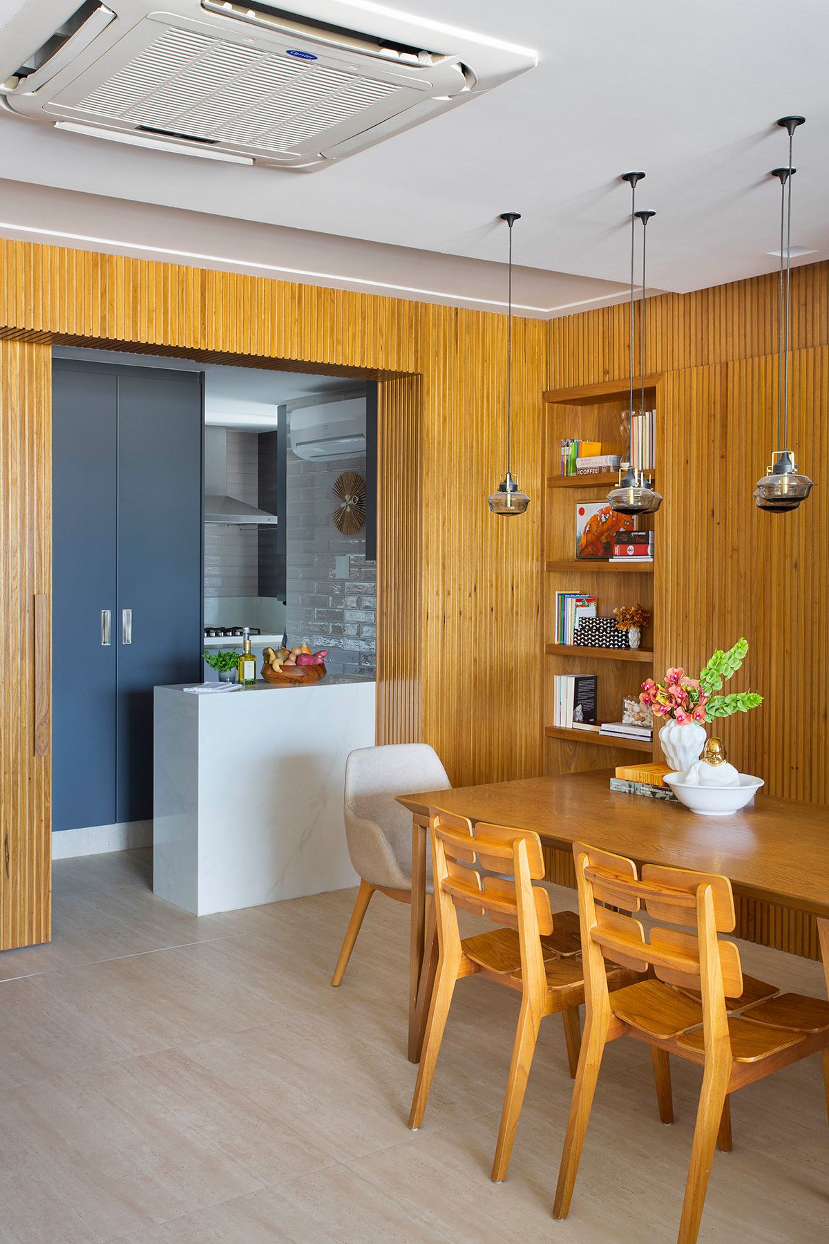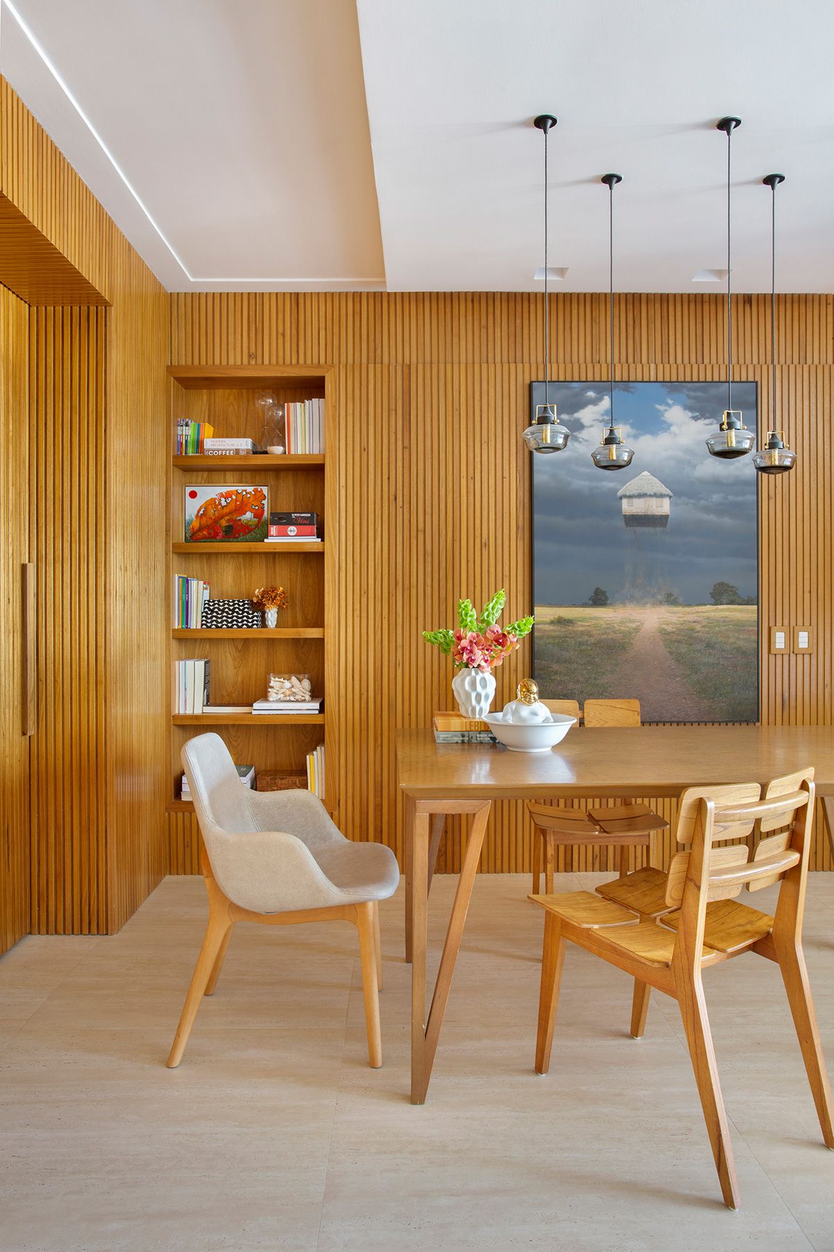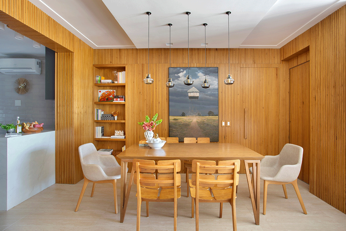 Para integrar a sala de estar com a varanda, a arquiteta propôs o nivelamento entre os ambientes, retirando a porta que os dividia e tornando o espaço mais convidativo. No caso da junção da sala e da cozinha, a solução foi projetar 3 painéis ripados de correr, para poder isolar os ambientes às vezes, e também camuflar a porta do banheiro e do acesso para a área íntima. Outro ponto interessante é que o casal aprecia e investe em obras de arte, e o apê conta com peças de Beatriz Milhazes, Carlito Carvalhosa, Fábio Miguez, Hércules Barsotti e Jorge Mayer, entre outros.