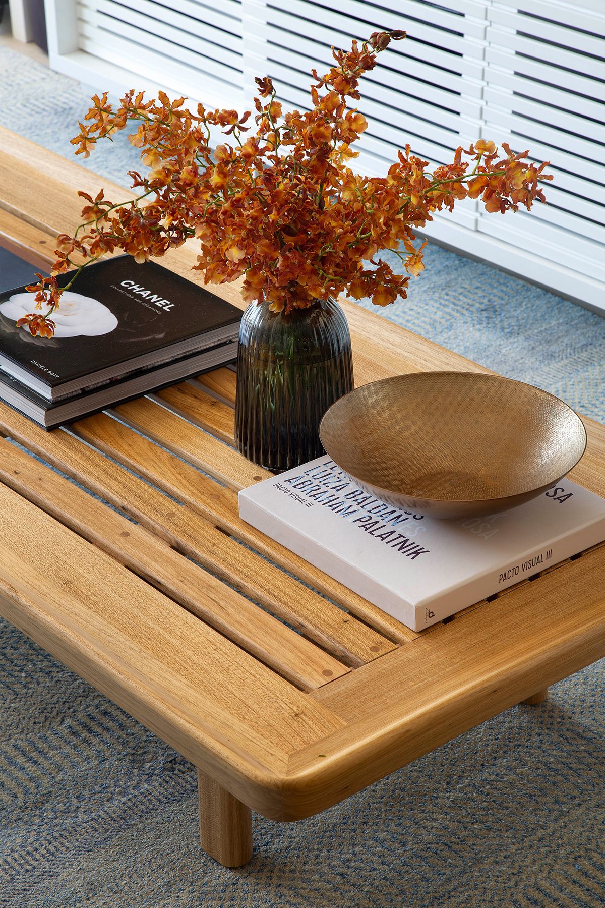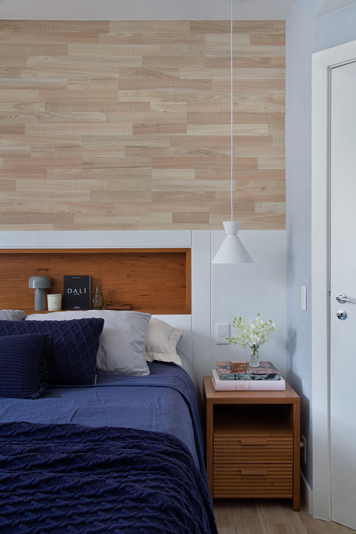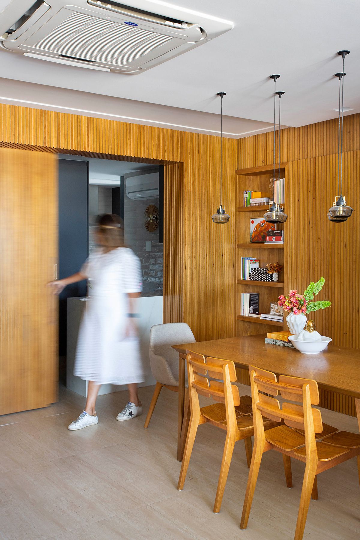 Para integrar a sala de estar com a varanda, a arquiteta propôs o nivelamento entre os ambientes, retirando a porta que os dividia e tornando o espaço mais convidativo. No caso da junção da sala e da cozinha, a solução foi projetar 3 painéis ripados de correr, para poder isolar os ambientes às vezes, e também camuflar a porta do banheiro e do acesso para a área íntima. Outro ponto interessante é que o casal aprecia e investe em obras de arte, e o apê conta com peças de Beatriz Milhazes, Carlito Carvalhosa, Fábio Miguez, Hércules Barsotti e Jorge Mayer, entre outros.