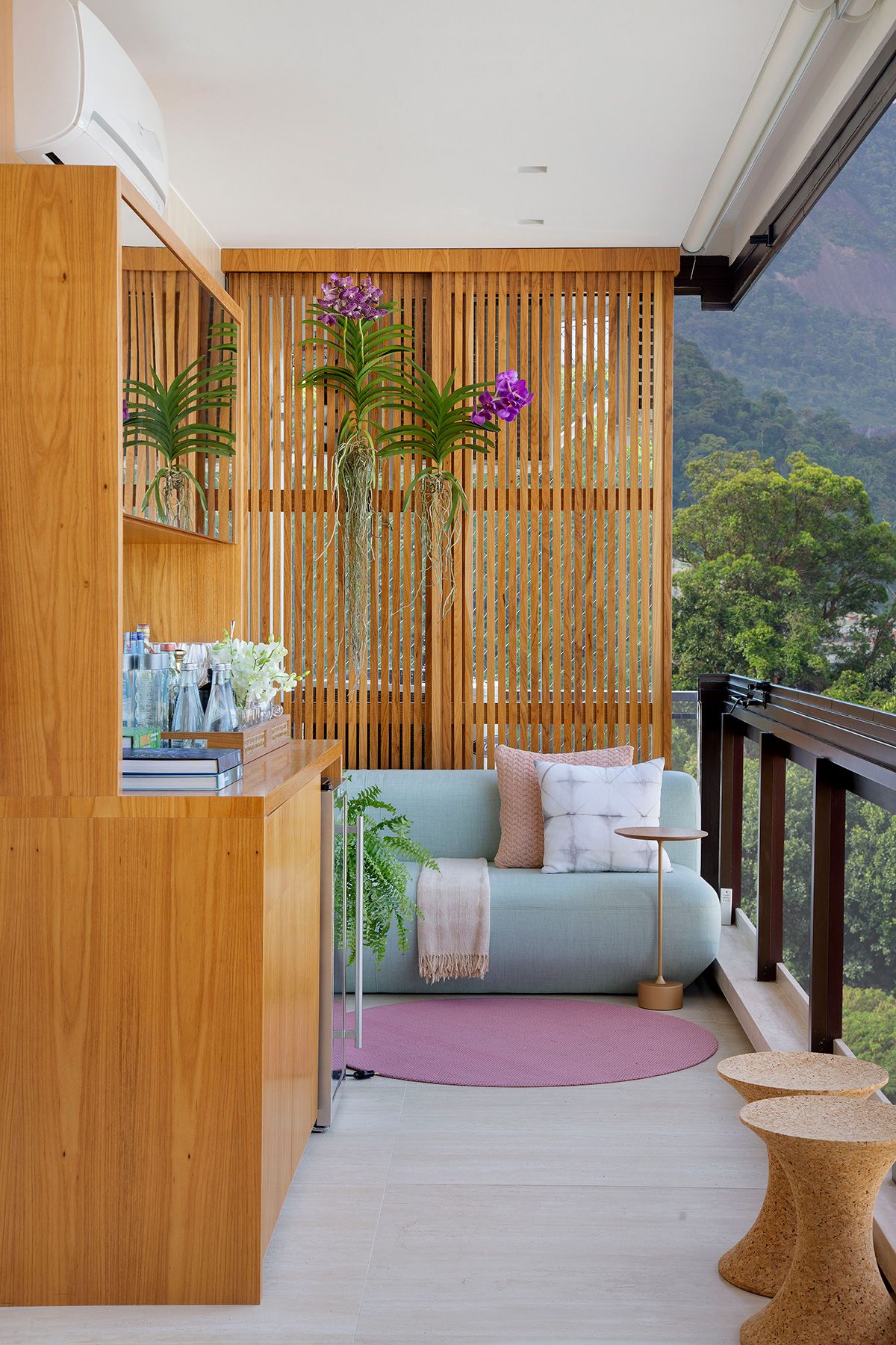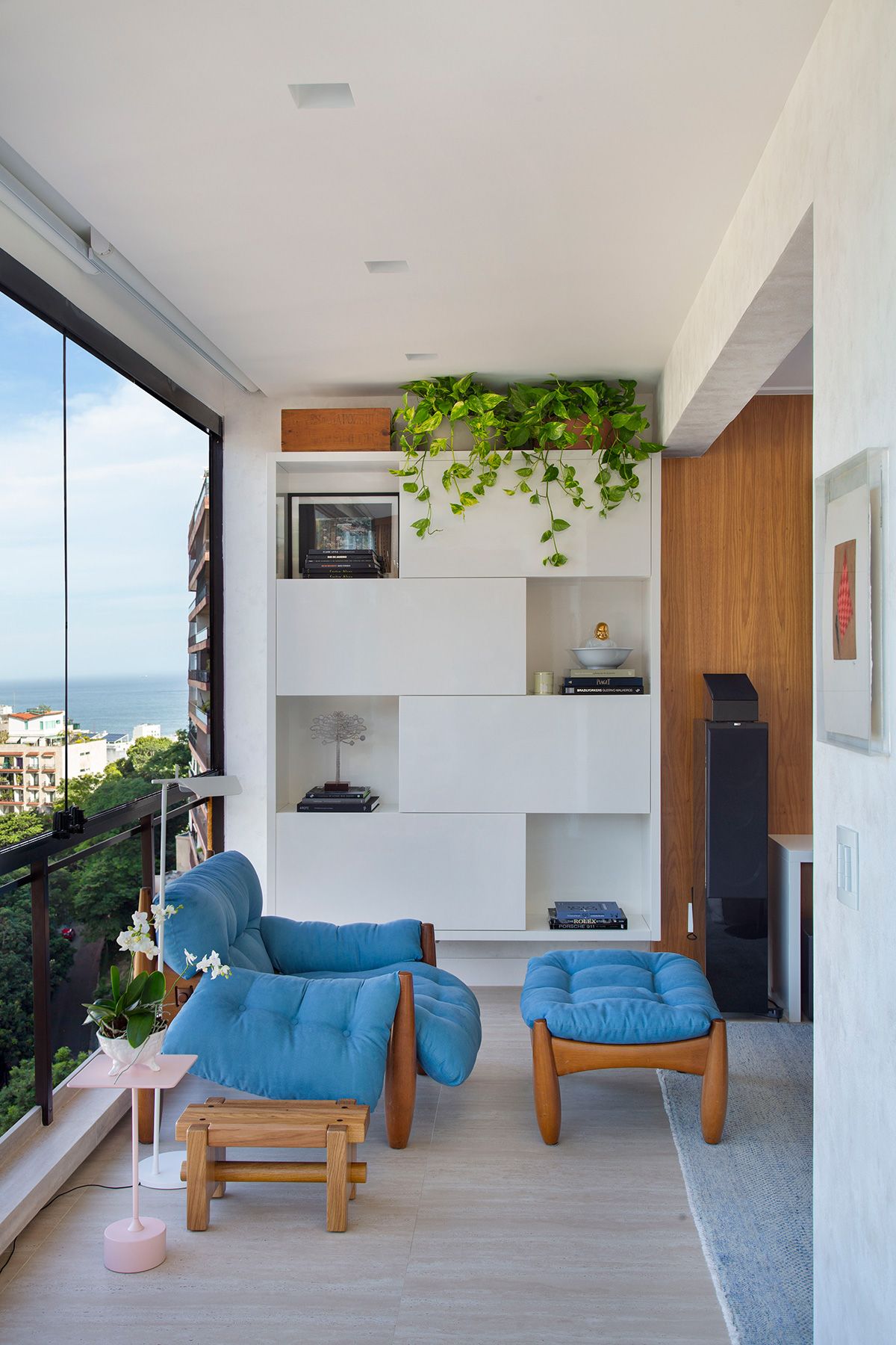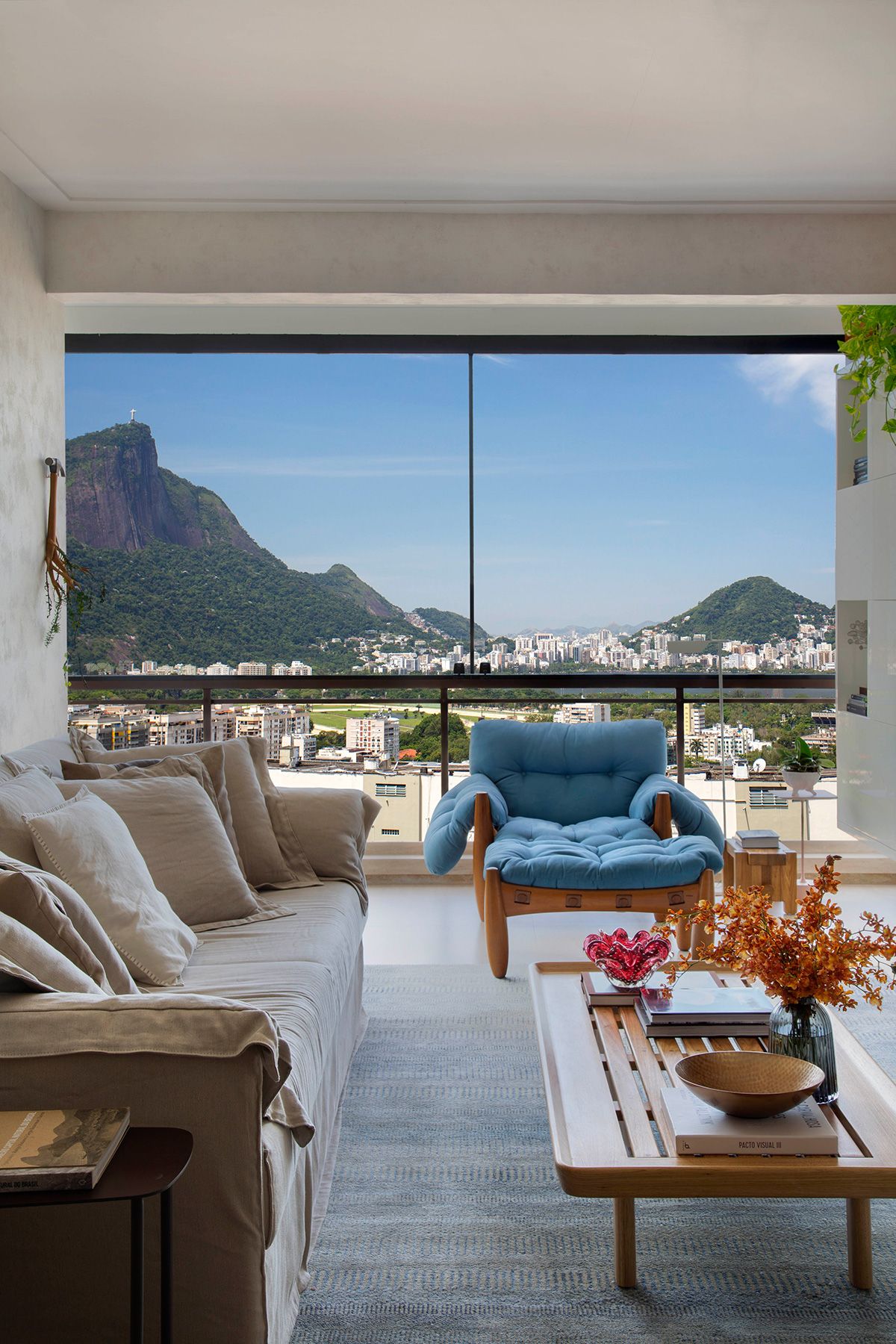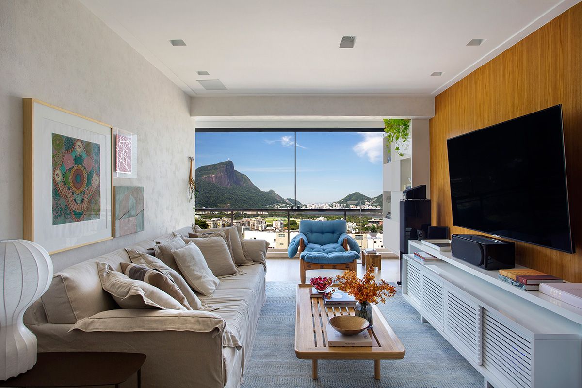 A integração da sala de estar com a varanda foi um dos principais desejos dos moradores, que usam o espaço para receber amigos e apreciar um bom vinho, admirando a vista carioca.