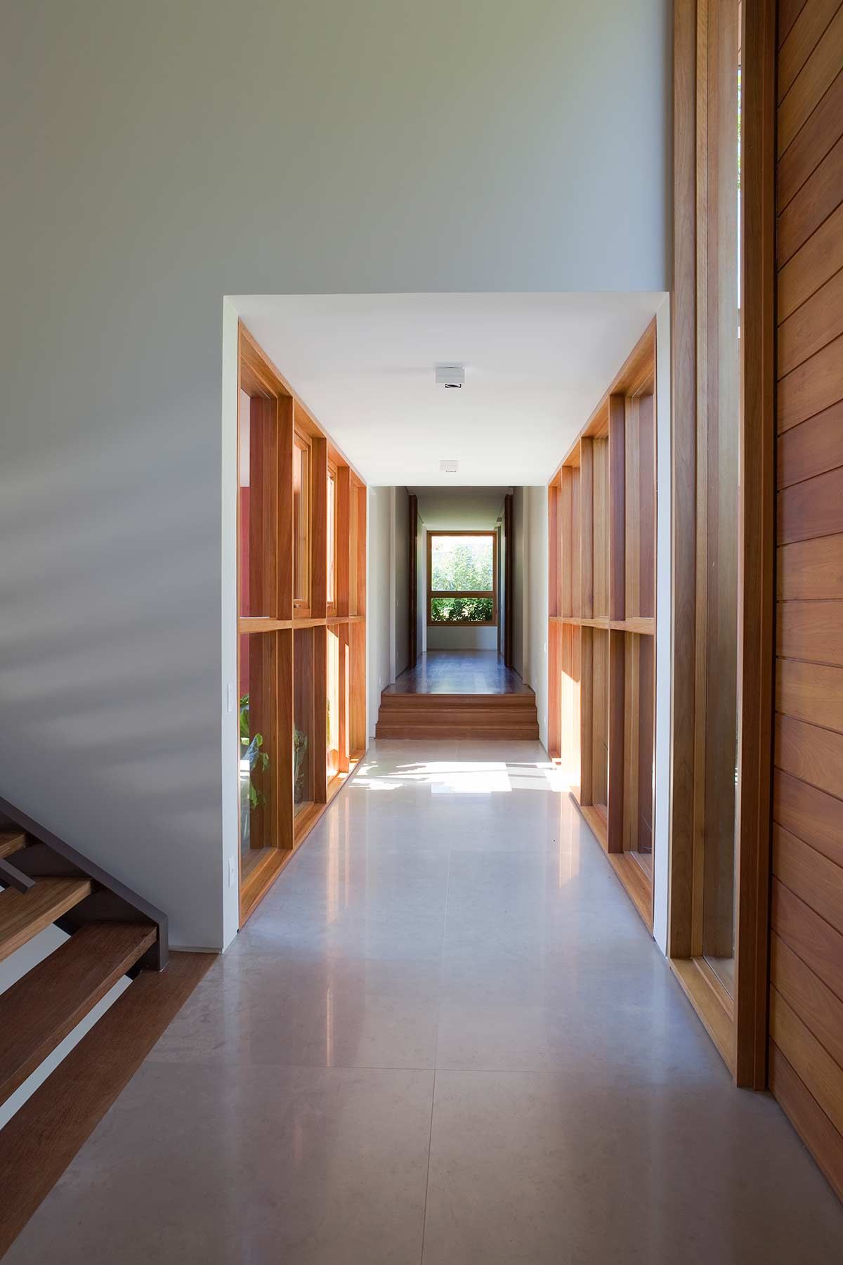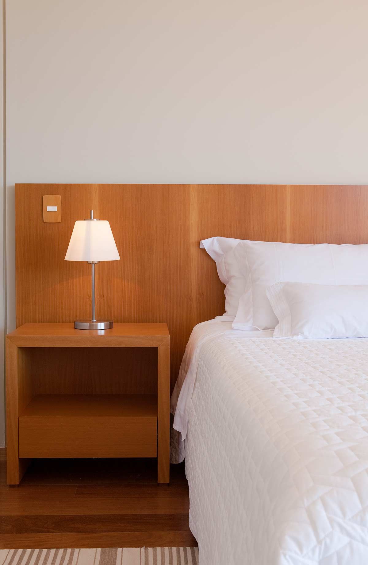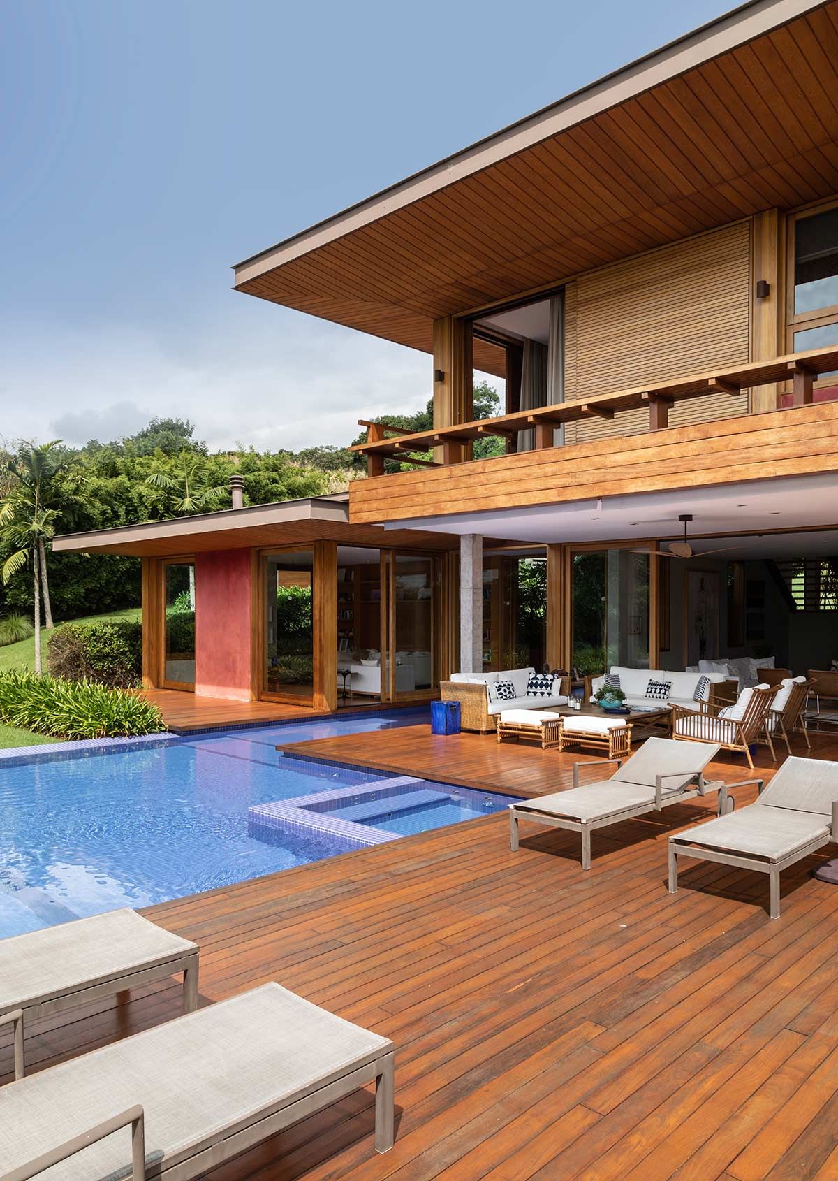 A piscina se integra à casa através de uma continuação como um espelho d’agua, criando relações visuais e sensitivas com as partes interna e externa. Para aproveitar com os amigos e familiares, um forno de pizza e uma churrasqueira completam a varanda. Nos ambientes íntimos, um pequeno escritório aparece no primeiro andar, e no superior, o maior dormitório é o do casal, com espaço exclusivo para closet. Os acabamentos que abraçam a morada são o concreto aparente e a madeira, essa que contrasta com o primeiro e é predominante no décor.