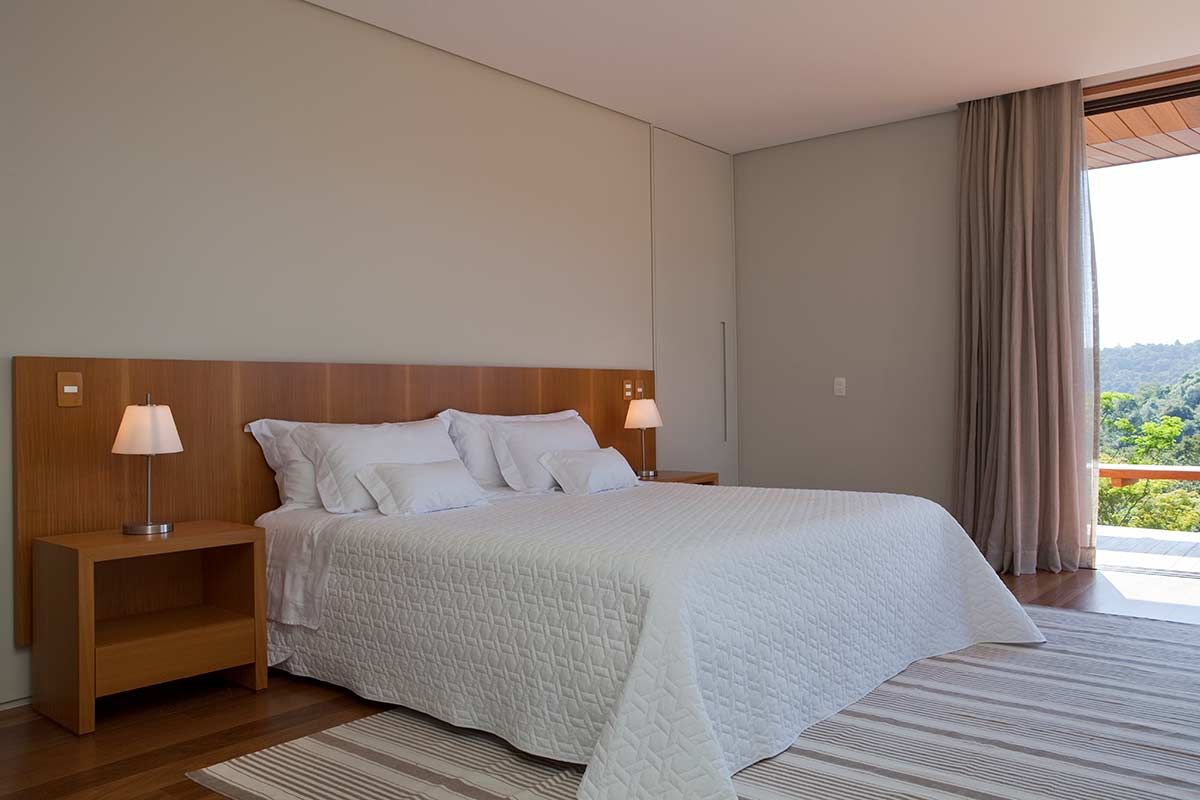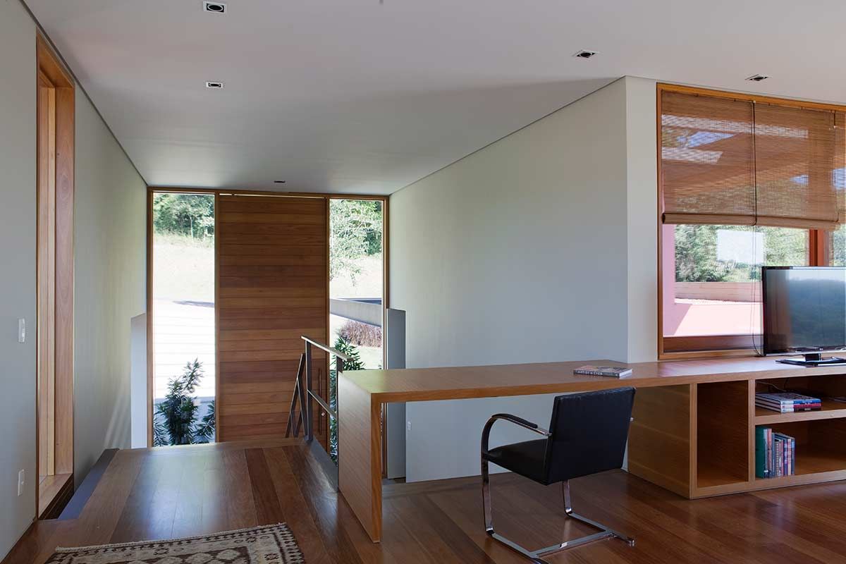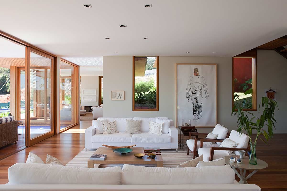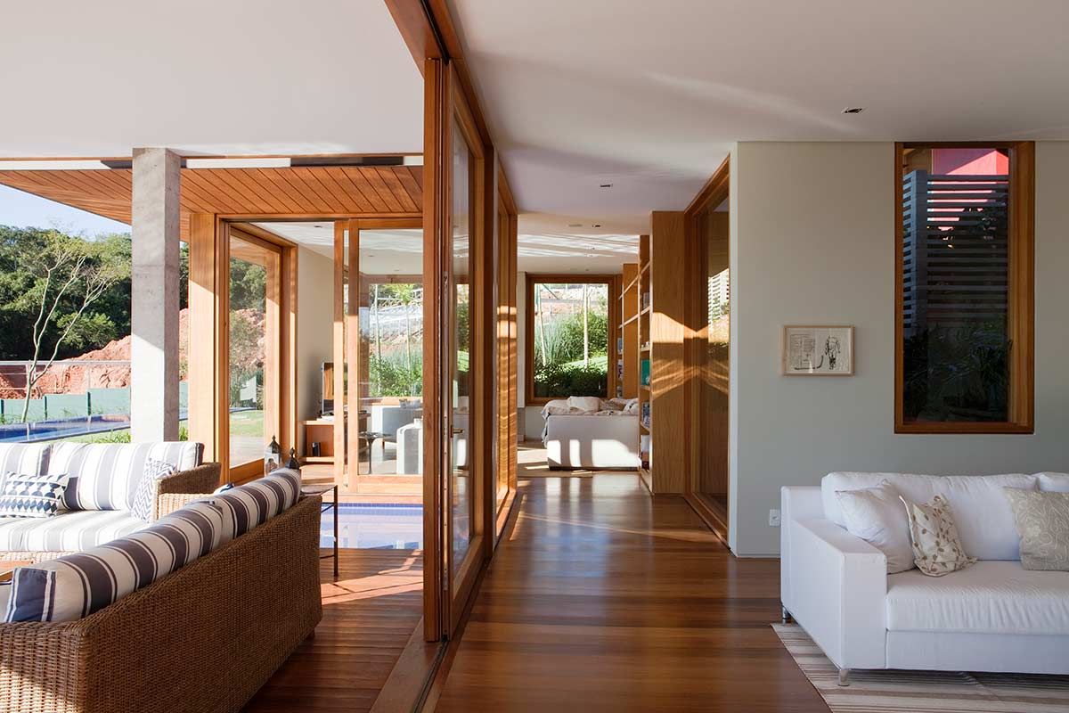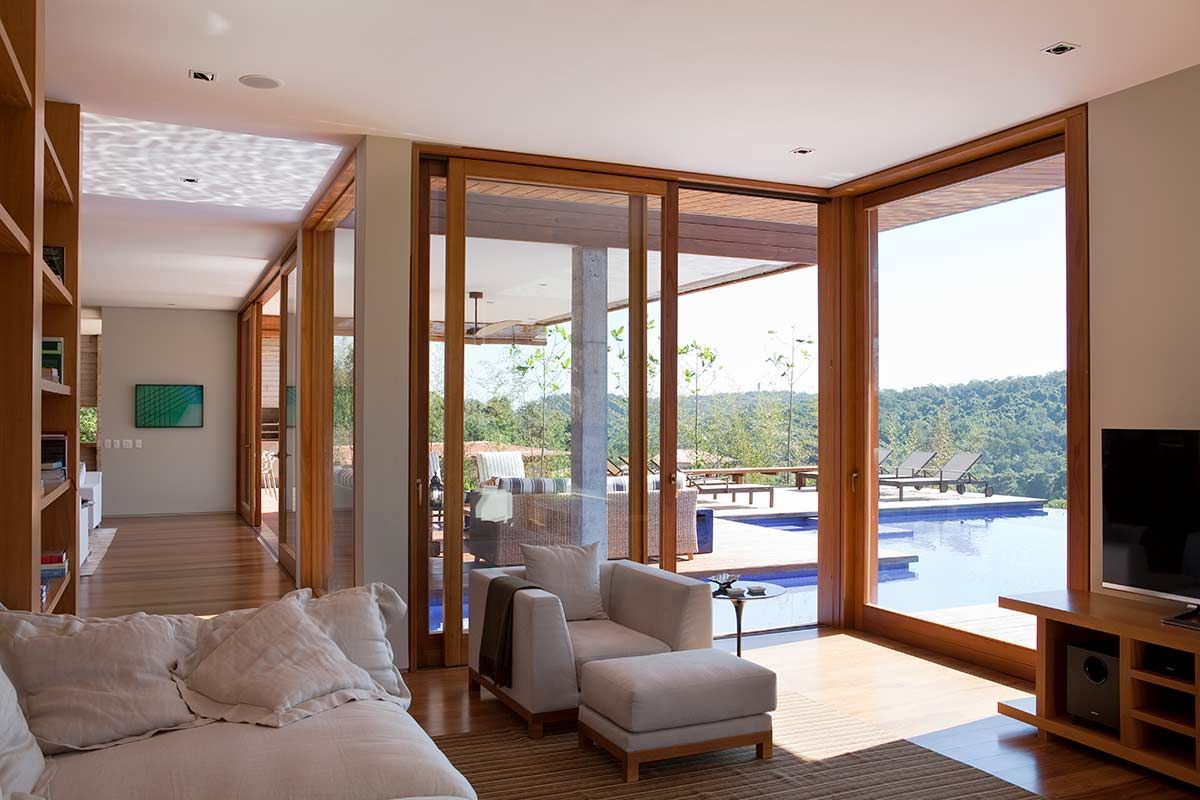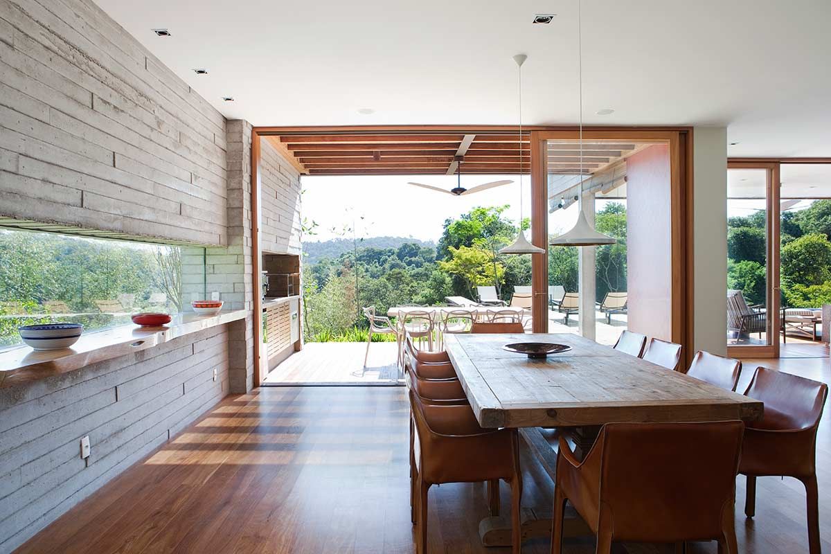 O desafio foi criar ambientes integrados aproveitando ao máximo a vista para a mata preservada que fica ao fundo, mesmo com o terreno em declive.