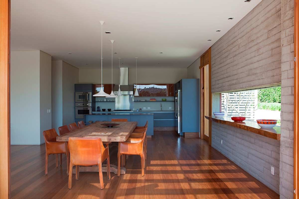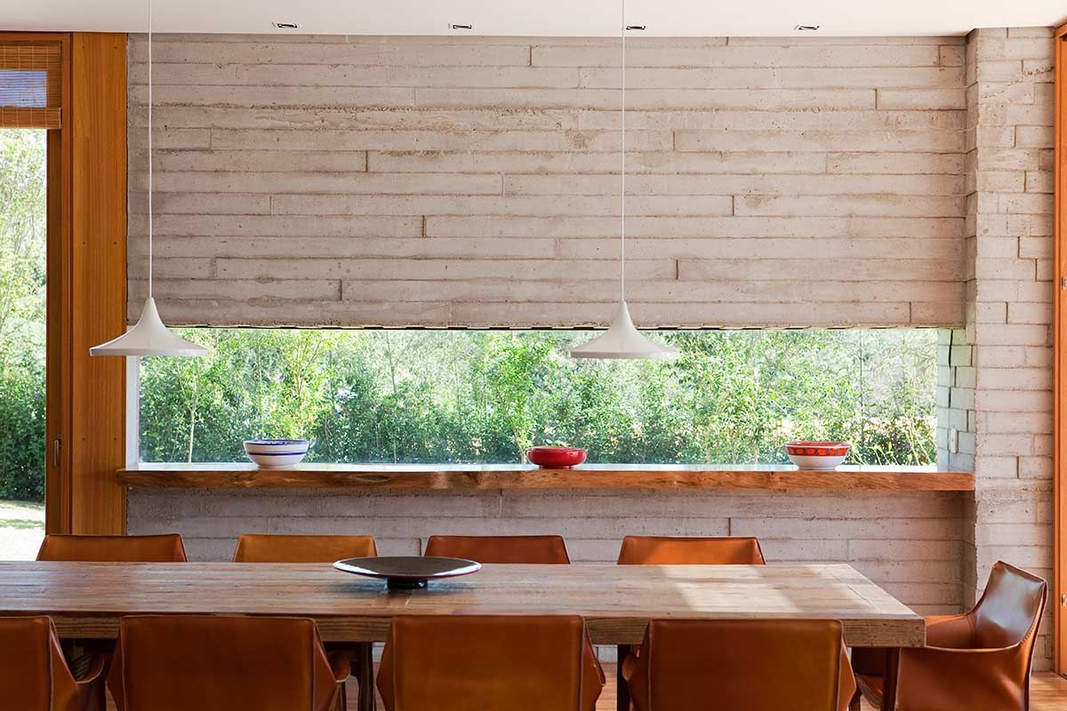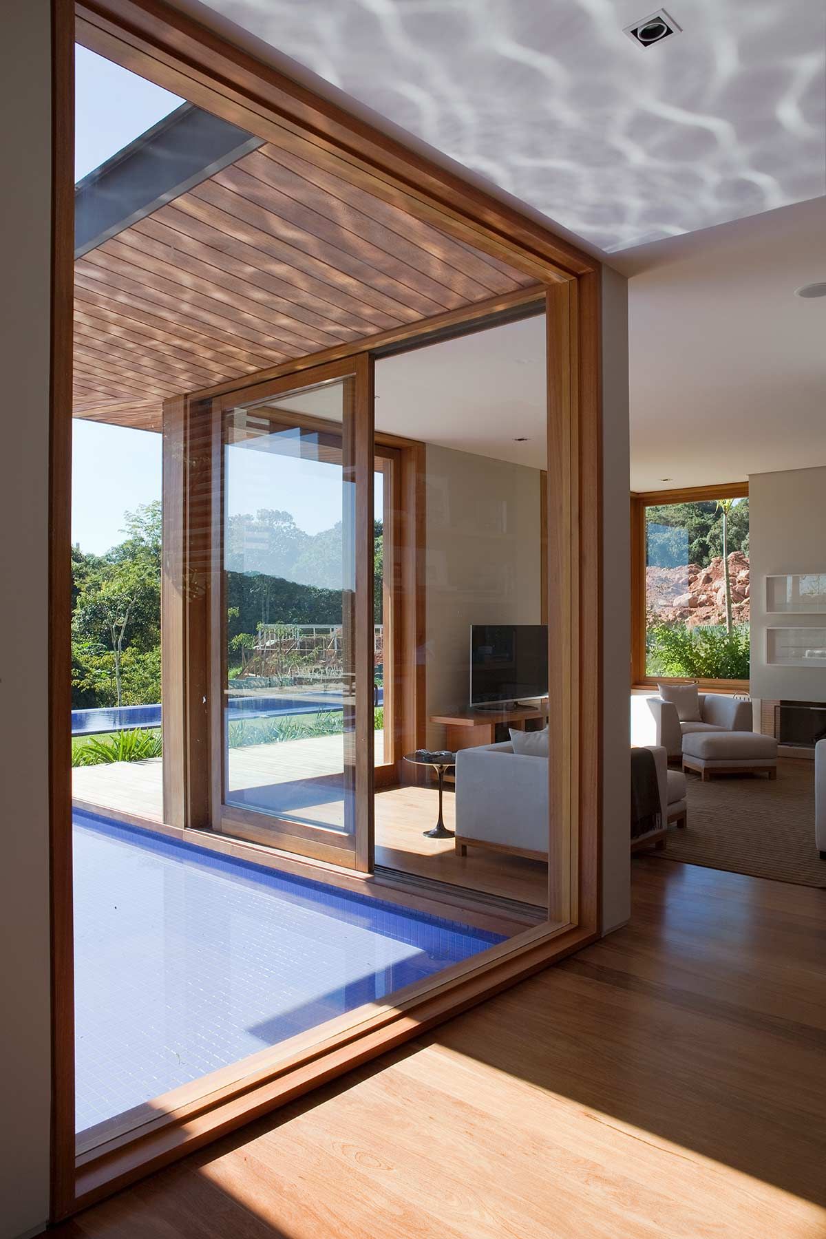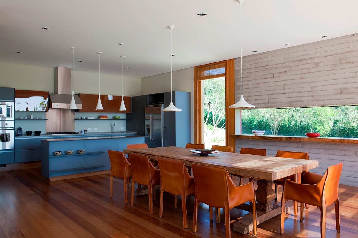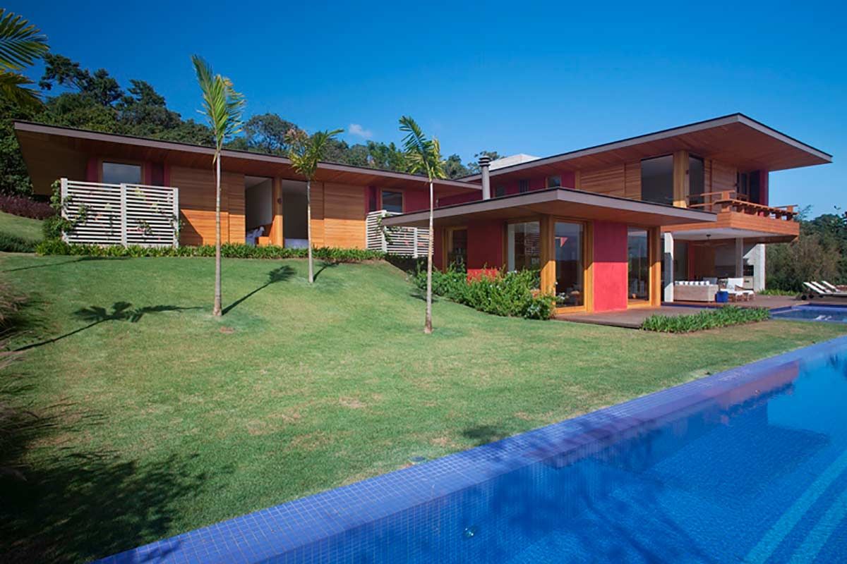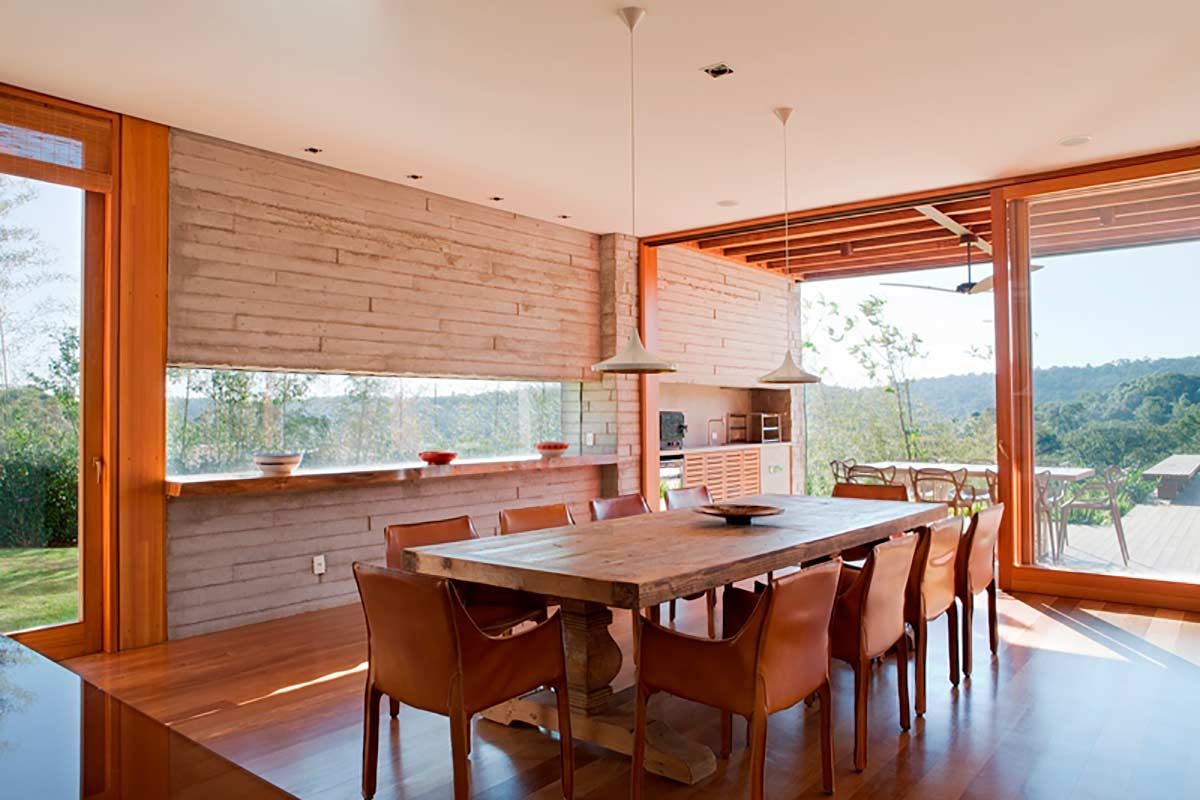 O desafio foi criar ambientes integrados aproveitando ao máximo a vista para a mata preservada que fica ao fundo, mesmo com o terreno em declive.