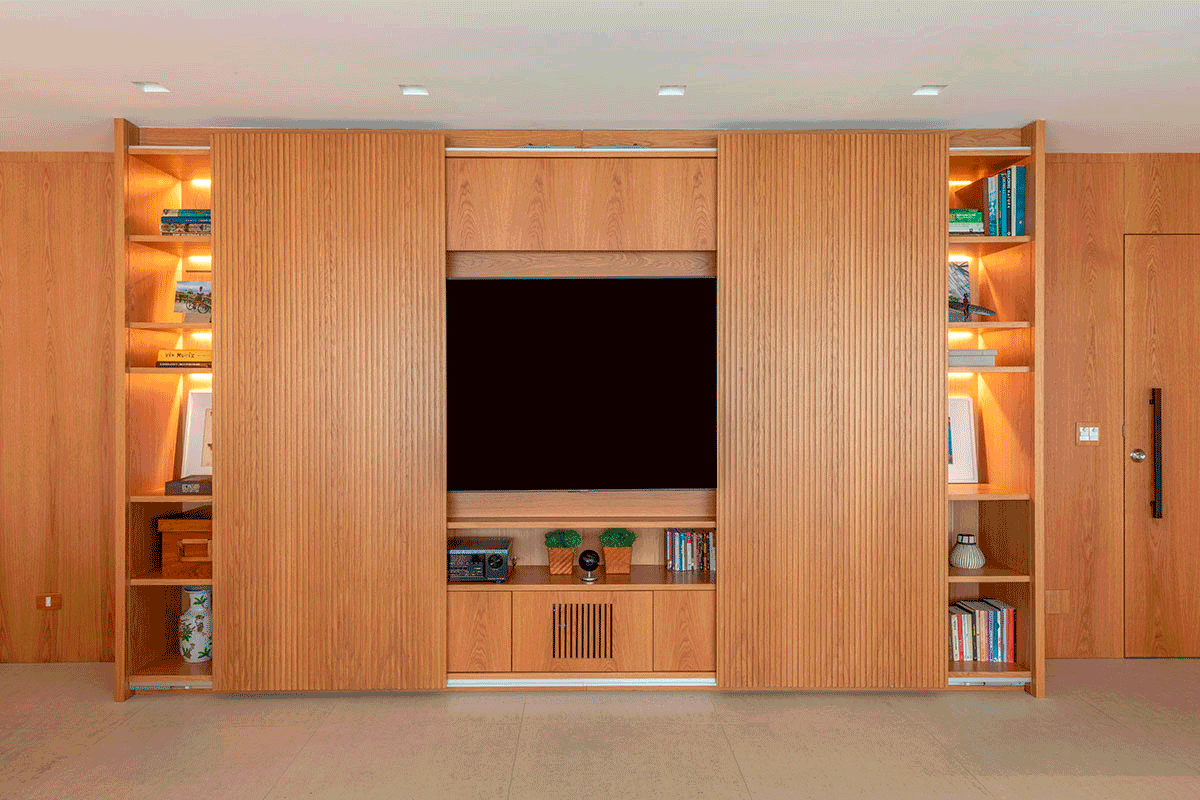 As arquitetas resolveram projetar uma grande estante em marcenaria, toda em carvalho americano, onde estariam os objetos principais da família, herdados e trazidos de viagens. Para atender ao desejo do filho, a cliente concordou em colocar uma grande TV no centro do móvel, desde que a mesma não comprometesse o layout da sala e nem chamasse muita atenção. Desta maneira, dois painéis de correr ripados escondem a TV quando não está sendo usada.