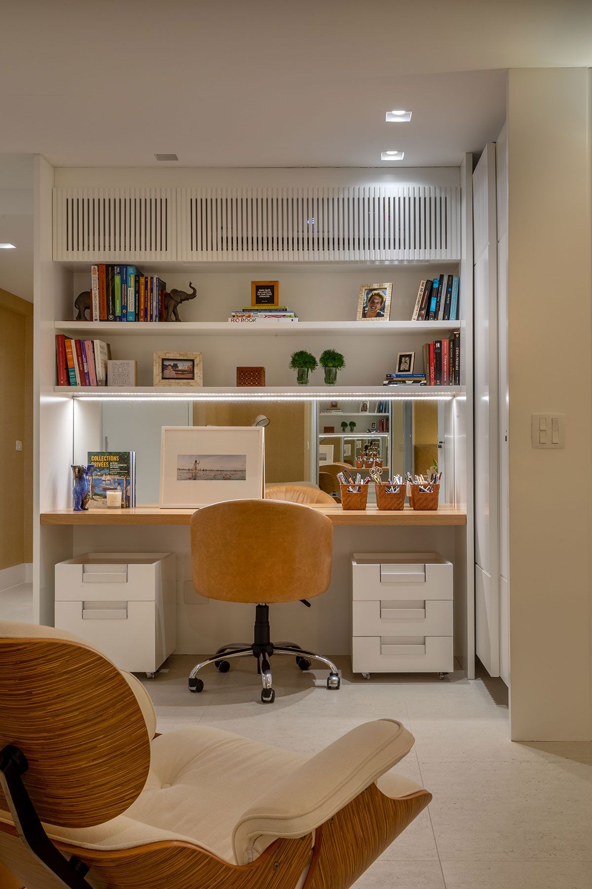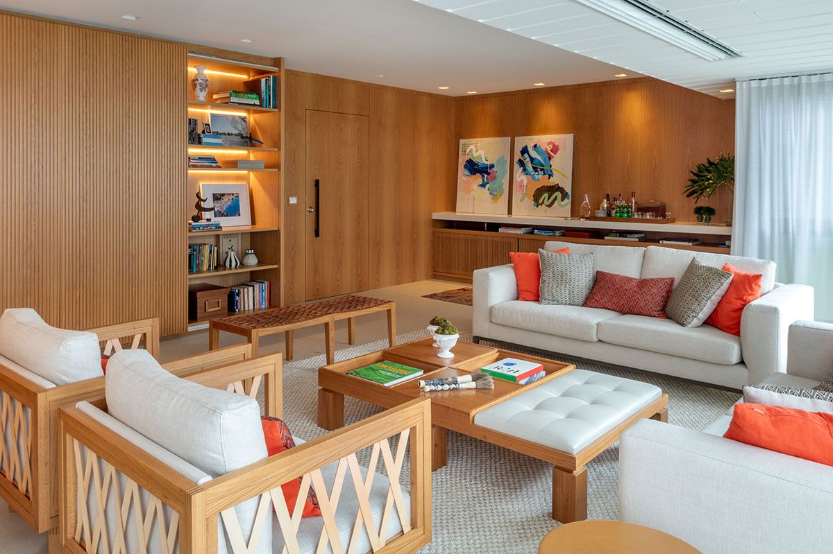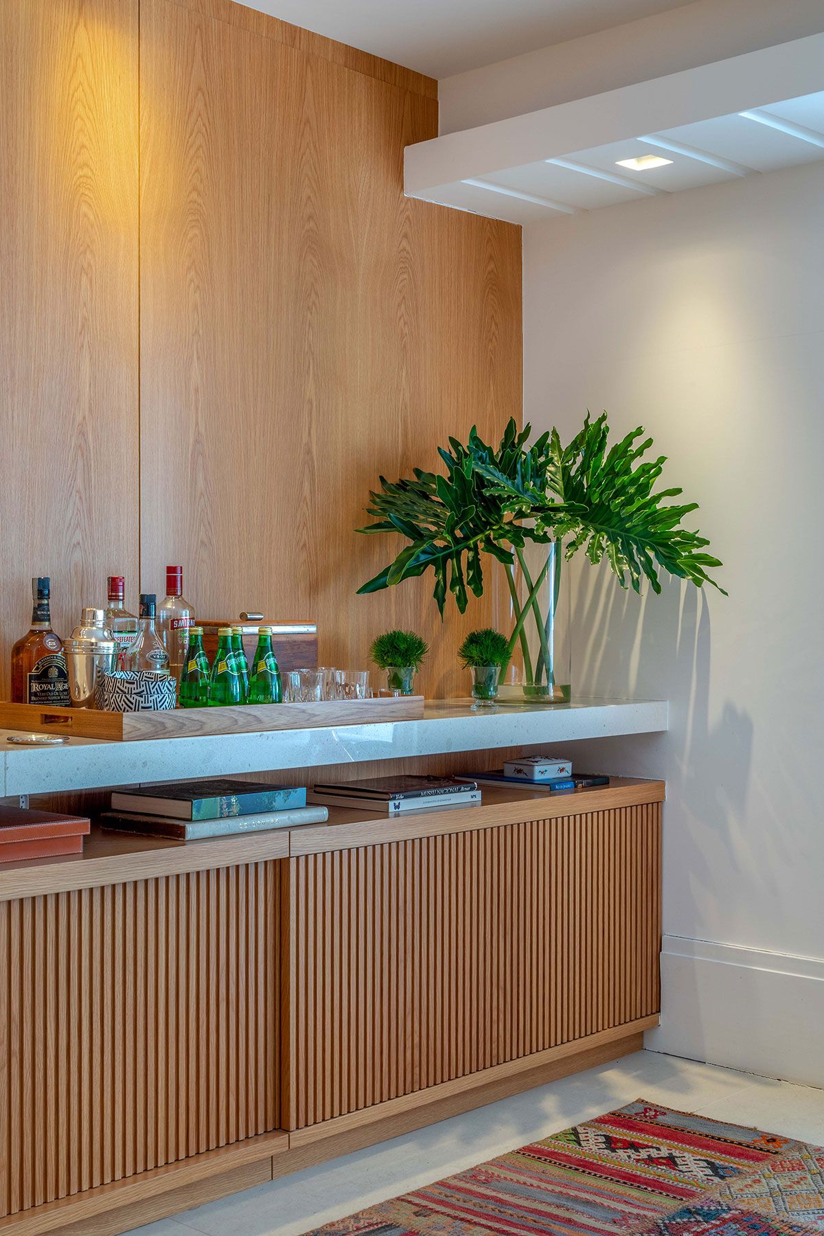 As arquitetas resolveram projetar uma grande estante em marcenaria, toda em carvalho americano, onde estariam os objetos principais da família, herdados e trazidos de viagens. Para atender ao desejo do filho, a cliente concordou em colocar uma grande TV no centro do móvel, desde que a mesma não comprometesse o layout da sala e nem chamasse muita atenção. Desta maneira, dois painéis de correr ripados escondem a TV quando não está sendo usada.