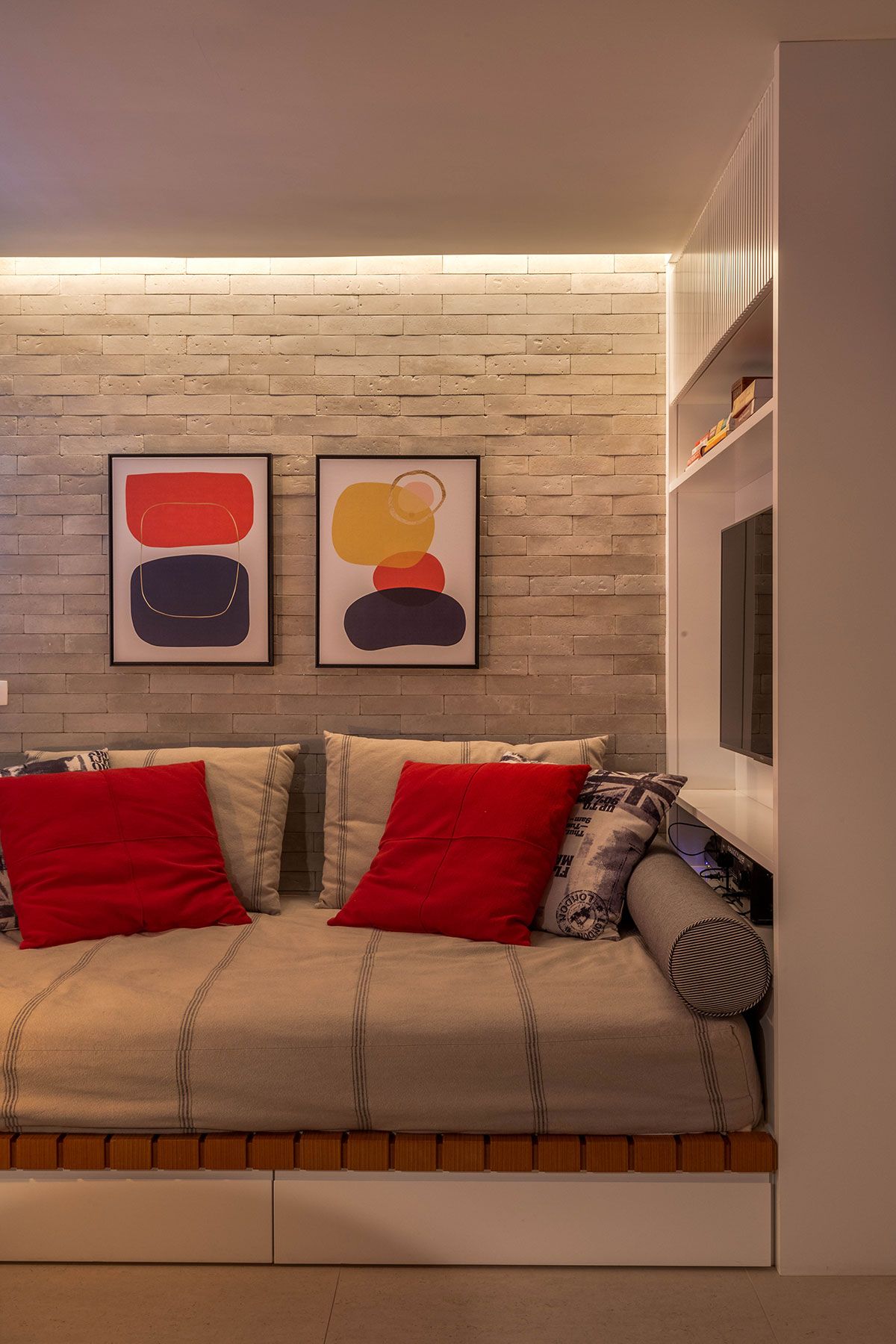 Incorporar a varanda à sala, criando um único espaço, foi uma das principais alterações que o escritório fez na planta. A parte íntima do apartamento também foi transformada, a suíte principal foi aumentada, pegando um pouco do espaço de um dos quartos. Os outros dois quartos originais foram unidos e transformados na suíte do filho. As arquitetas tornaram um apartamento de 4 quartos em 2 suítes amplas e funcionais.