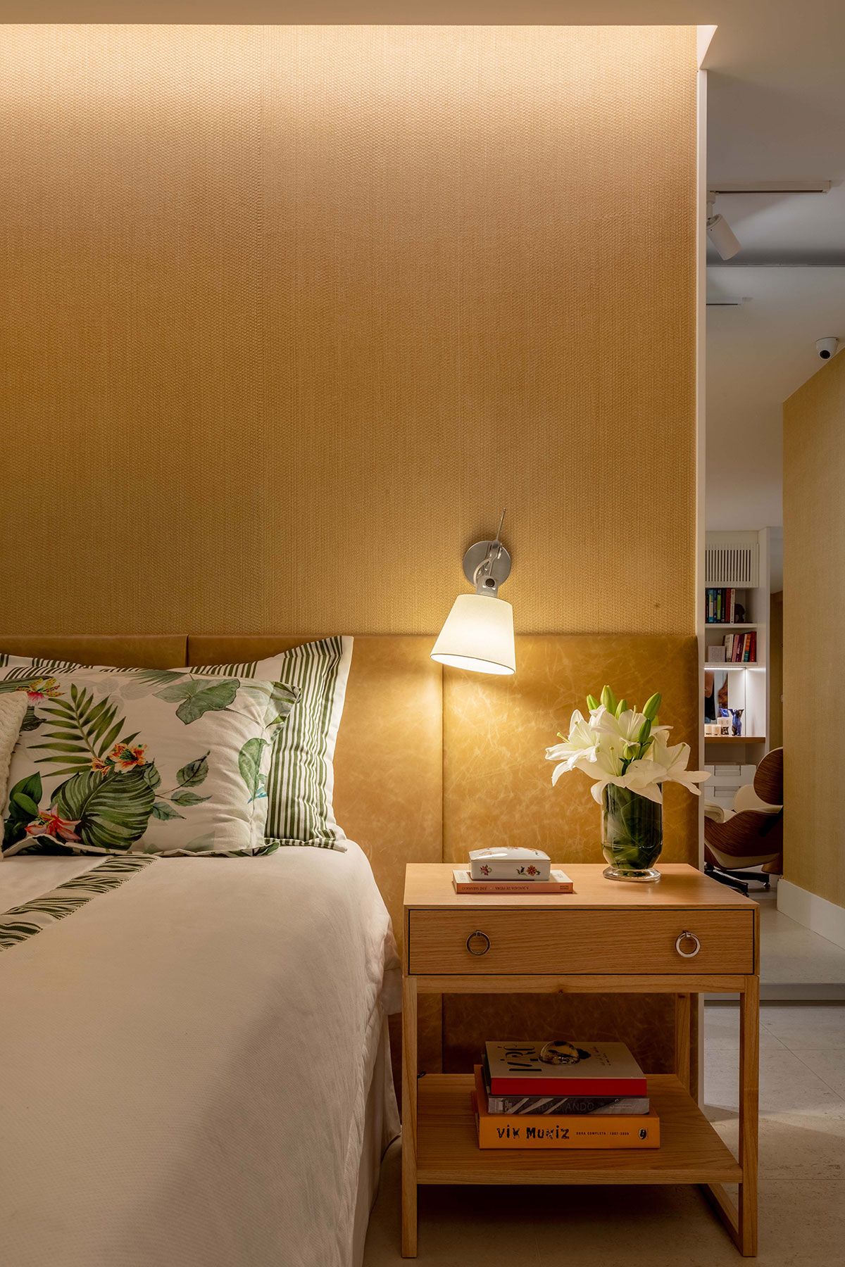 O mesmo piso foi utilizado em todo o apartamento, e, por ser muito claro, criamos o contraste com painéis de madeira na sala, revestindo algumas paredes. O mobiliário tem uma base de cores sóbrias, deixando as cores pontuais para objetos, quadros e acessórios.