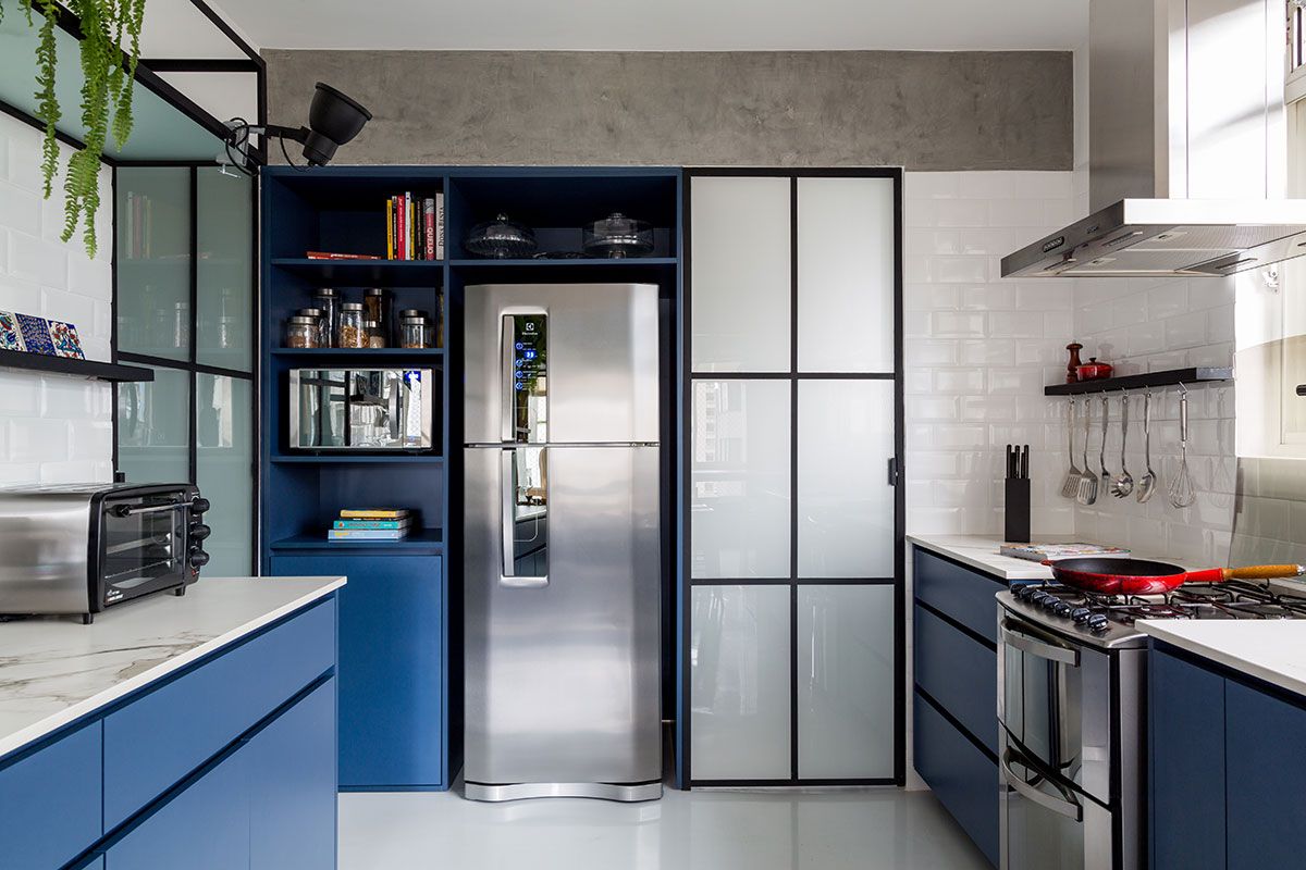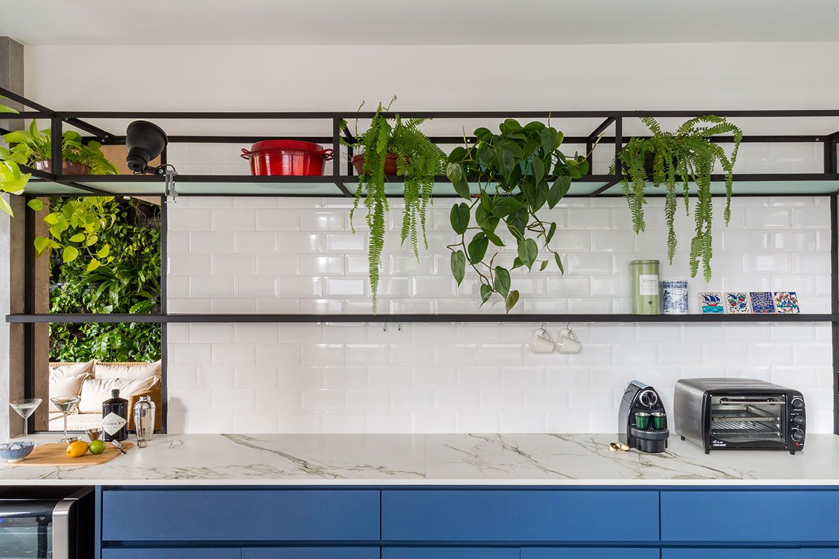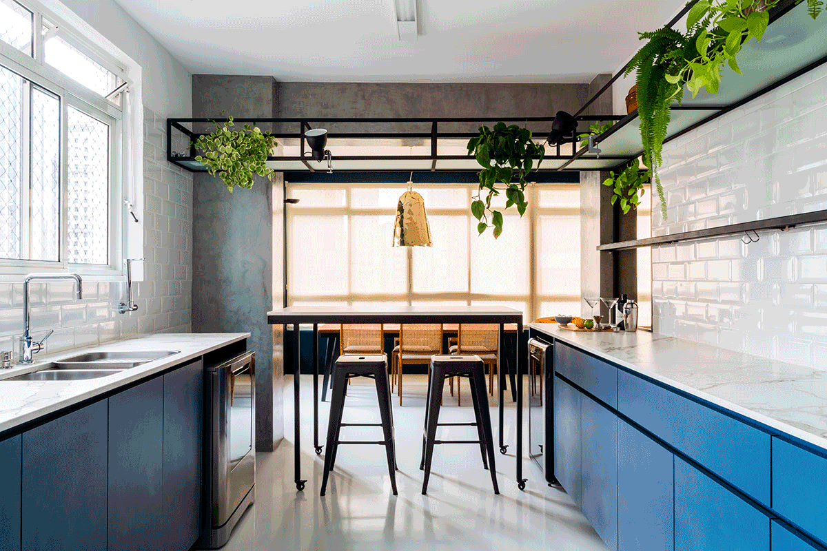 O maior desafio para o escritório foi a parte de serralheria, muitas peças foram desenhadas pelo profissionais, como a prateleira suspensa que permeia toda a cozinha, as portas com vidro leitoso, as prateleirinhas para temperos, barrinha de utensílios e o caixilho que delimita a abertura entre a cozinha e sala sobre a bancada.