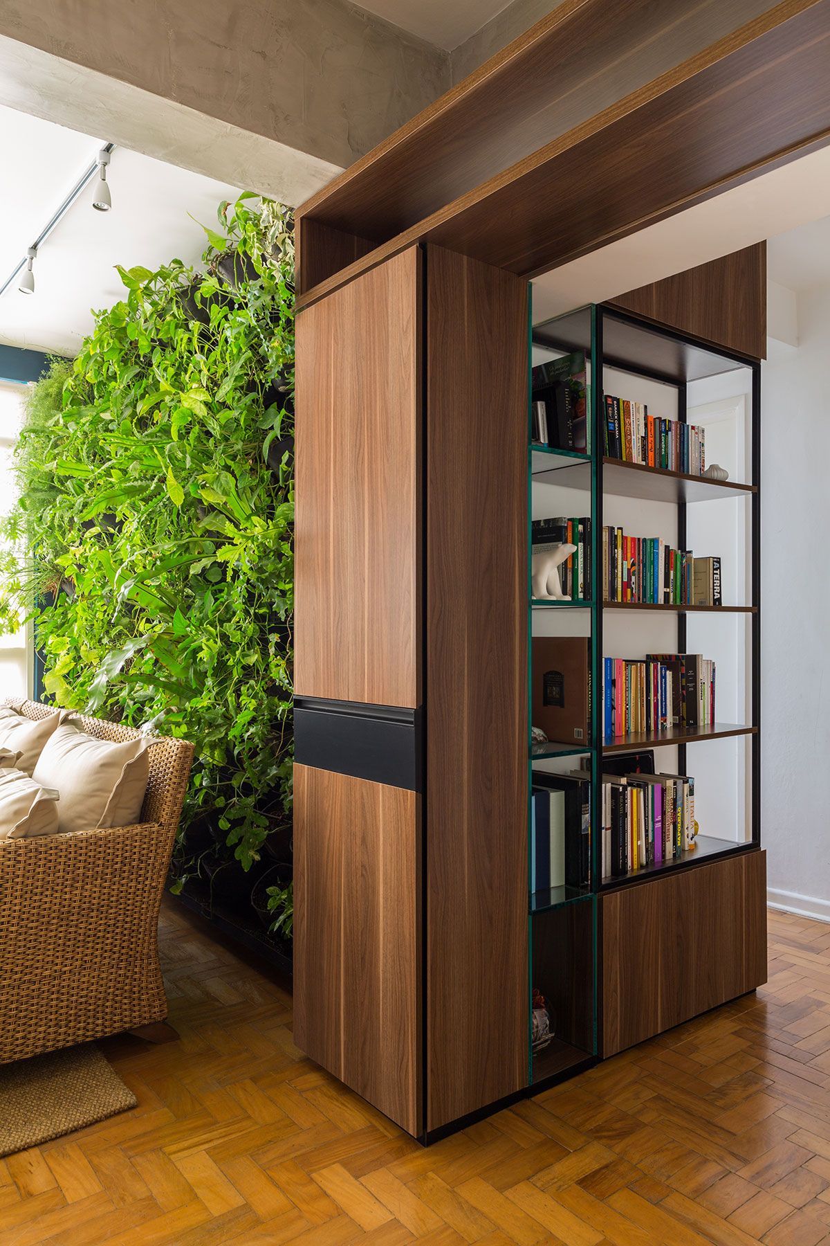 Todo o espaço foi projetado para incluir elementos e volumes lineares, que permeiem todo o espaço de forma ampla e alongada. Isso, no ponto de vista do escritório, cria uma perspectiva muito interessante no ambiente, amplia e limpa a visão de quem está usando o espaço.