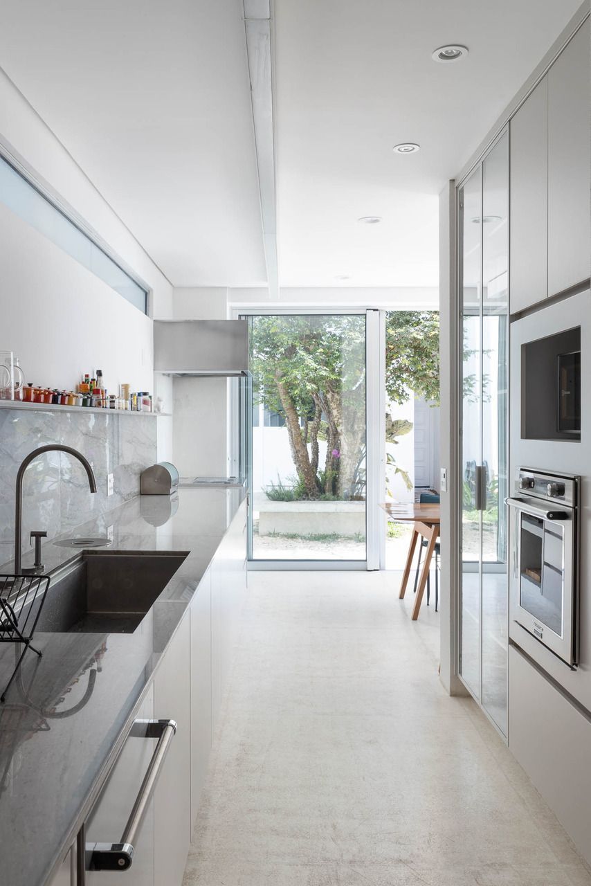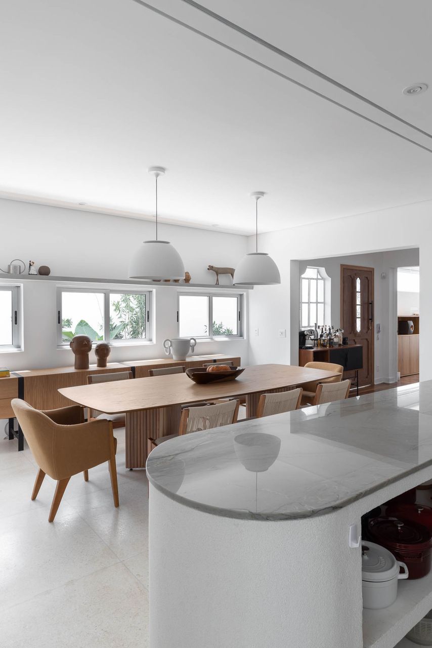 A cozinha foi pensada como coração da casa. Prática e bem equipada, conecta-se à mesa de jantar por meio de um balcão multifuncional que serve tanto de apoio às refeições quanto de estação para o preparo de drinks nos encontros com amigos. A churrasqueira, estrategicamente posicionada, conta com uma despensa adjacente que facilita o armazenamento e reforça a vocação da casa para receber.