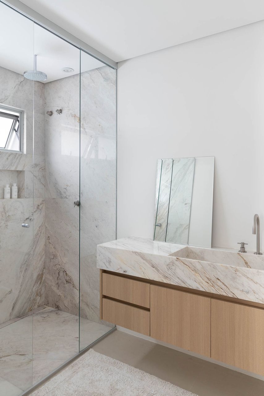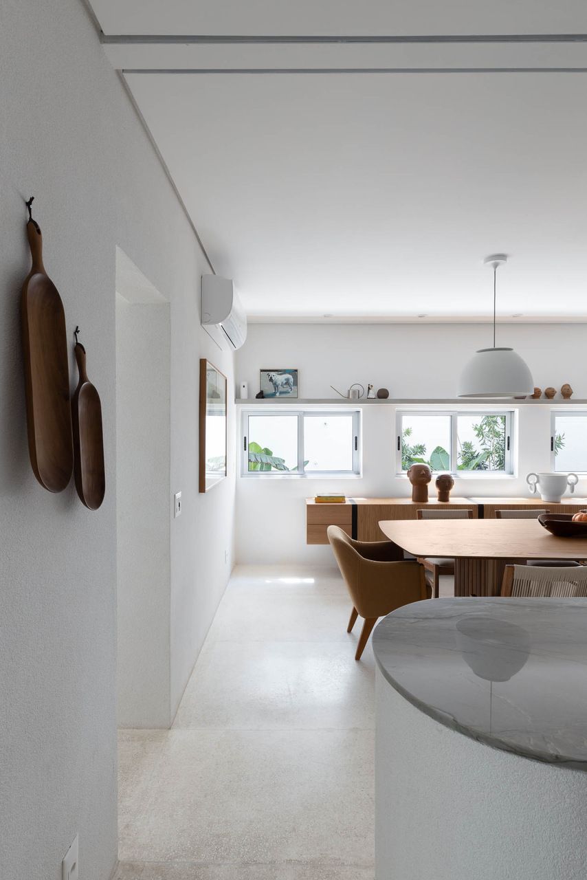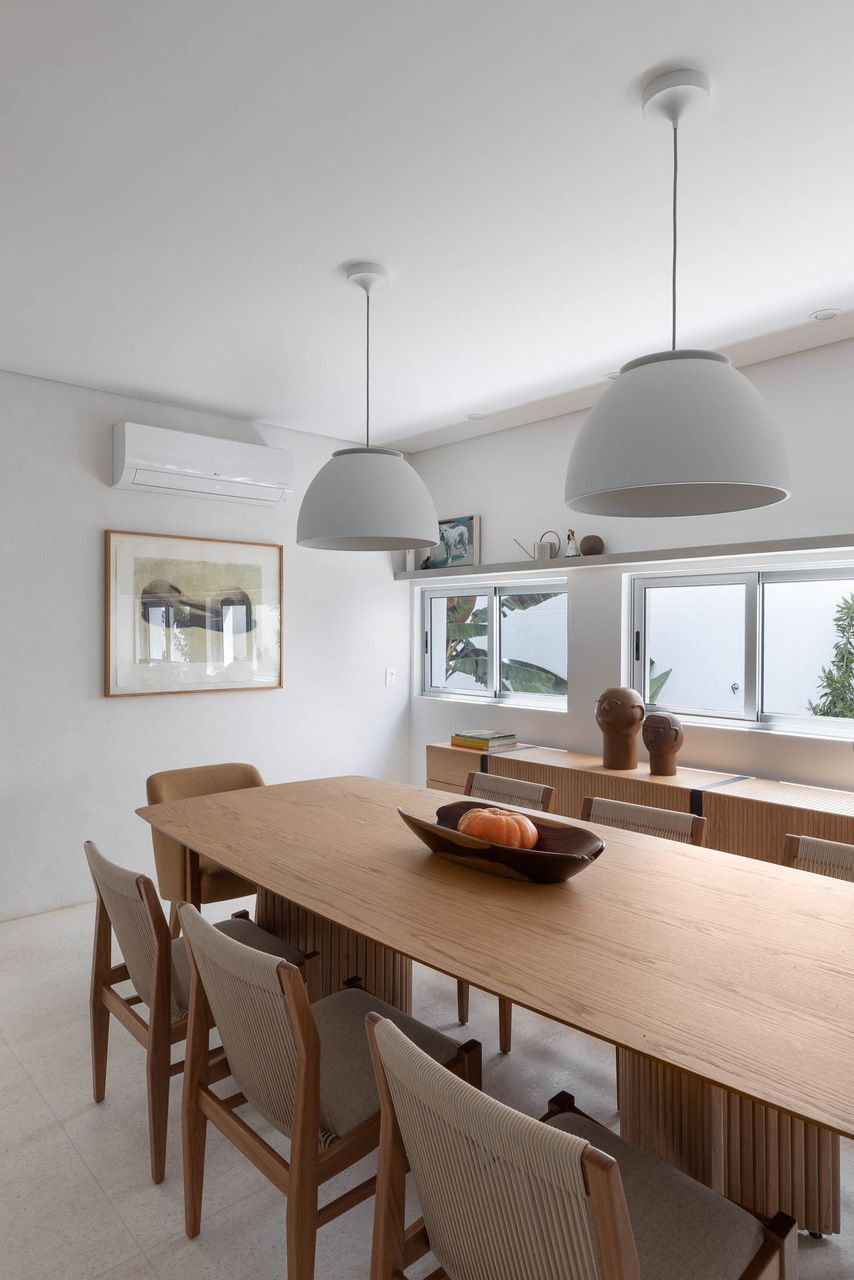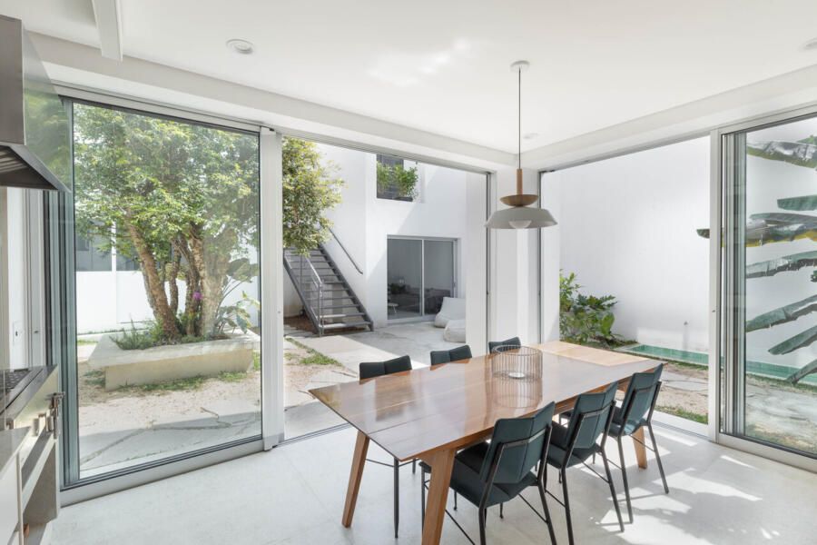 Voltada para a rua, a fachada mantém descrição elegante. Uma parede de tijolos espaçados permite a passagem de luz natural e cria um delicado jogo de sombras, garantindo privacidade sem bloquear a ventilação cruzada. O resultado é uma casa que transforma limitações em potência e traduz, em cada detalhe, o compromisso do escritório com soluções personalizadas, funcionais e livres de excessos, em uma arquitetura pensada para melhorar, de fato, a qualidade de vida de quem a habita.