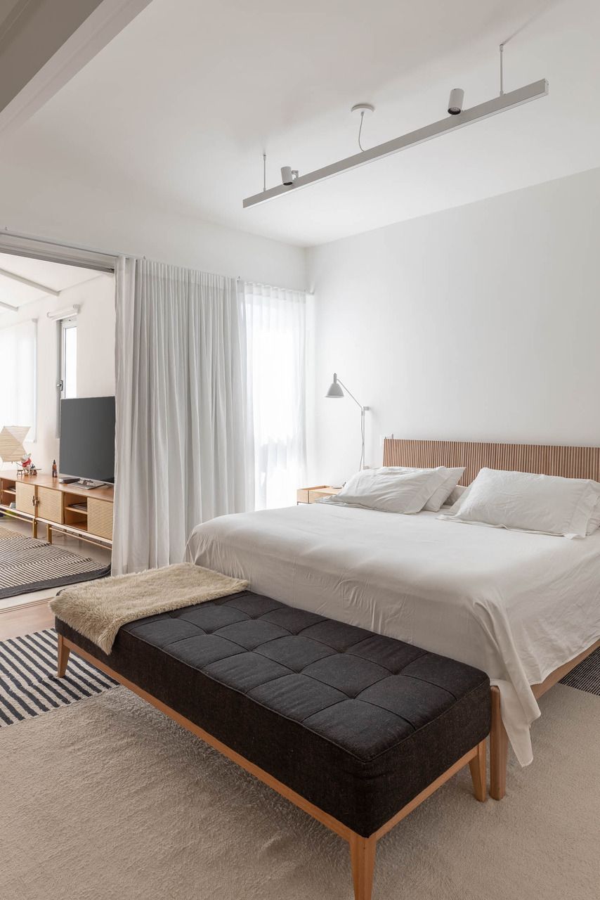 No pavimento superior, a antiga configuração do pet shop deu lugar a uma área generosa e funcional. A suíte principal foi ampliada com a incorporação de dois cômodos e a anexação de 40m² de uma antiga varanda, agora transformada em sala íntima e escritório. Um dos ambientes tornou-se closet, outro dormitório, compondo um andar que combina conforto, privacidade e versatilidade para acompanhar as próximas fases da vida do casal.