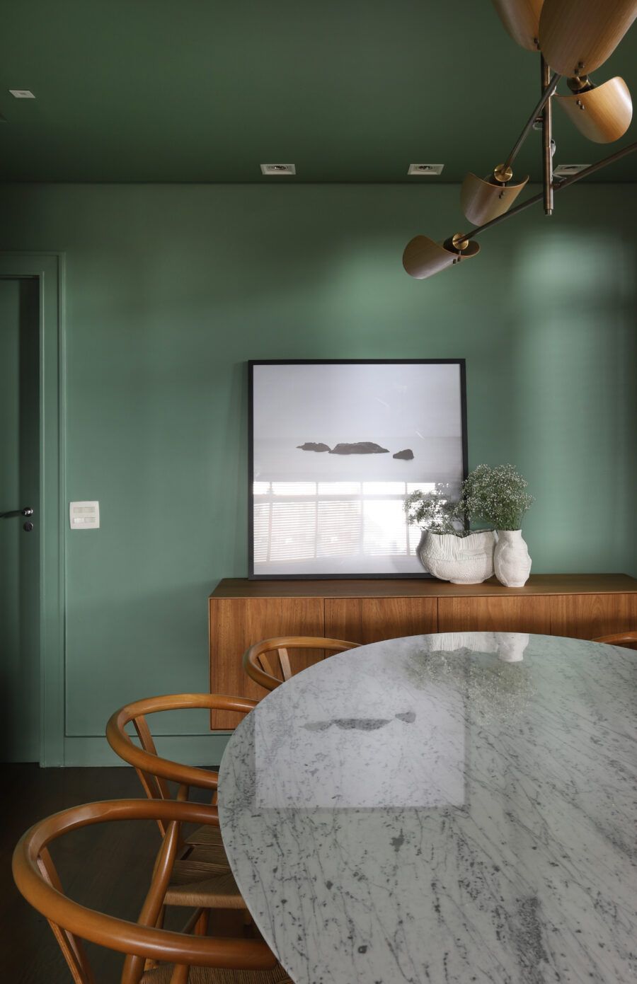 “Como não podíamos derrubar paredes ou fazer alterações na infraestrutura, optamos por usar a cor como instrumento de mudança: a sala de jantar virou um cubo verde, com paredes e teto pintados na cor Jardim Botânico da Tintas Coral. O lavabo ganhou outra cara com o papel de parede da Branco. E os quartos das crianças ficaram super alegres com o uso de papeis de parede e teto colorido.”