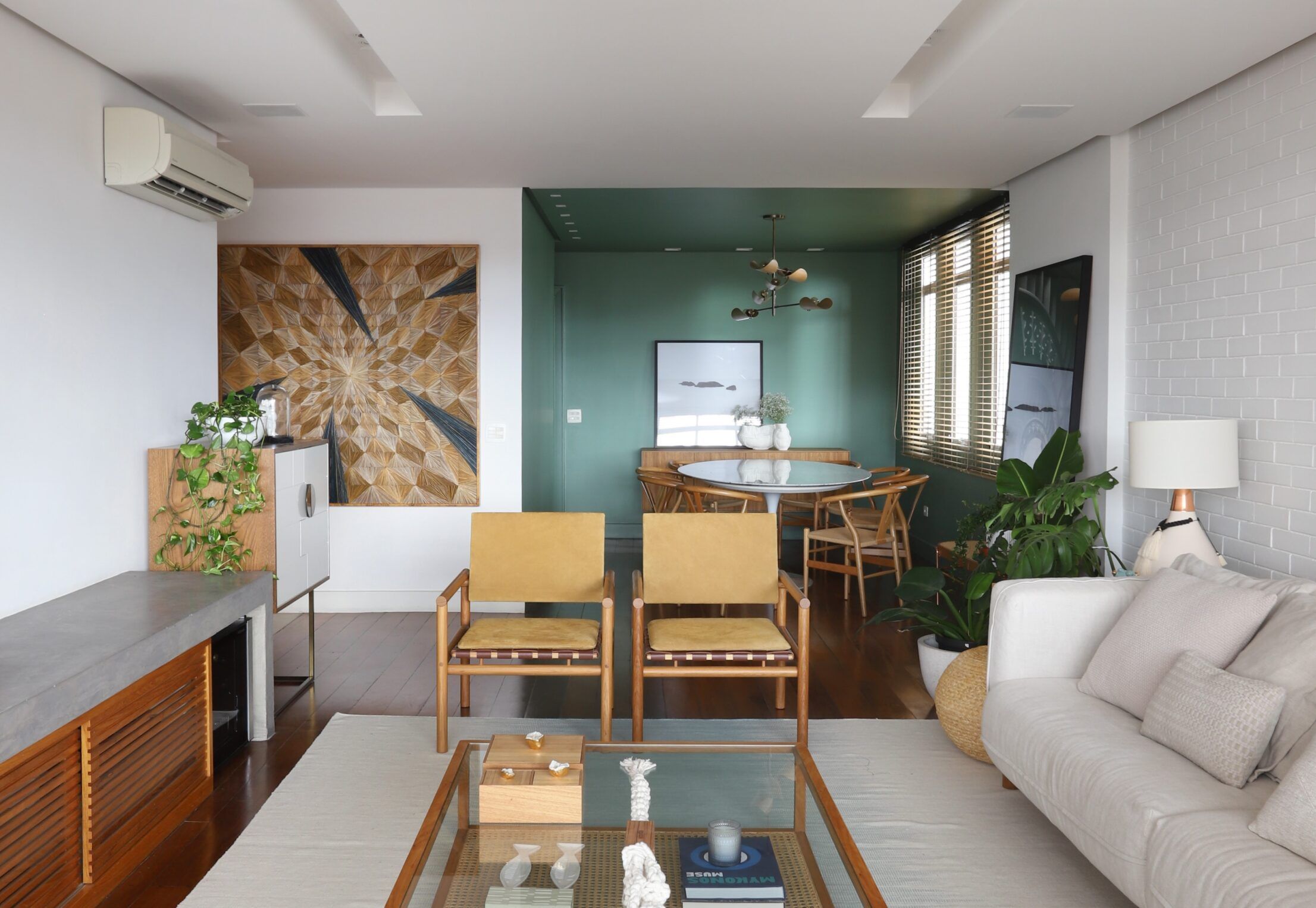 “Em apartamento alugado, vale a pena investir em cor, papel de parede, tapete e em um mobiliário atemporal e confortável. Não tenha medo de usar cor. O chamado “color block”, usado na sala nesse apartamento, tem grande impacto visual, com baixo custo. Pintar o teto deixa o ambiente mais interessante e é falso que achata o pé direito.”