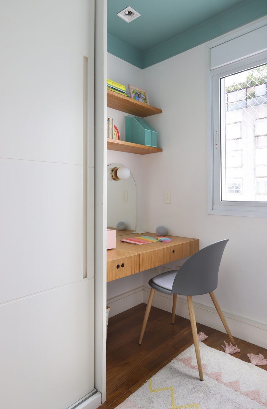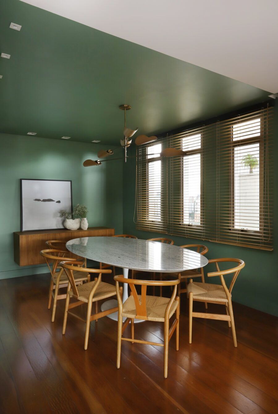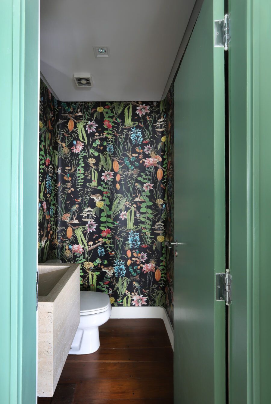 “Como não podíamos derrubar paredes ou fazer alterações na infraestrutura, optamos por usar a cor como instrumento de mudança: a sala de jantar virou um cubo verde, com paredes e teto pintados na cor Jardim Botânico da Tintas Coral. O lavabo ganhou outra cara com o papel de parede da Branco. E os quartos das crianças ficaram super alegres com o uso de papeis de parede e teto colorido.”