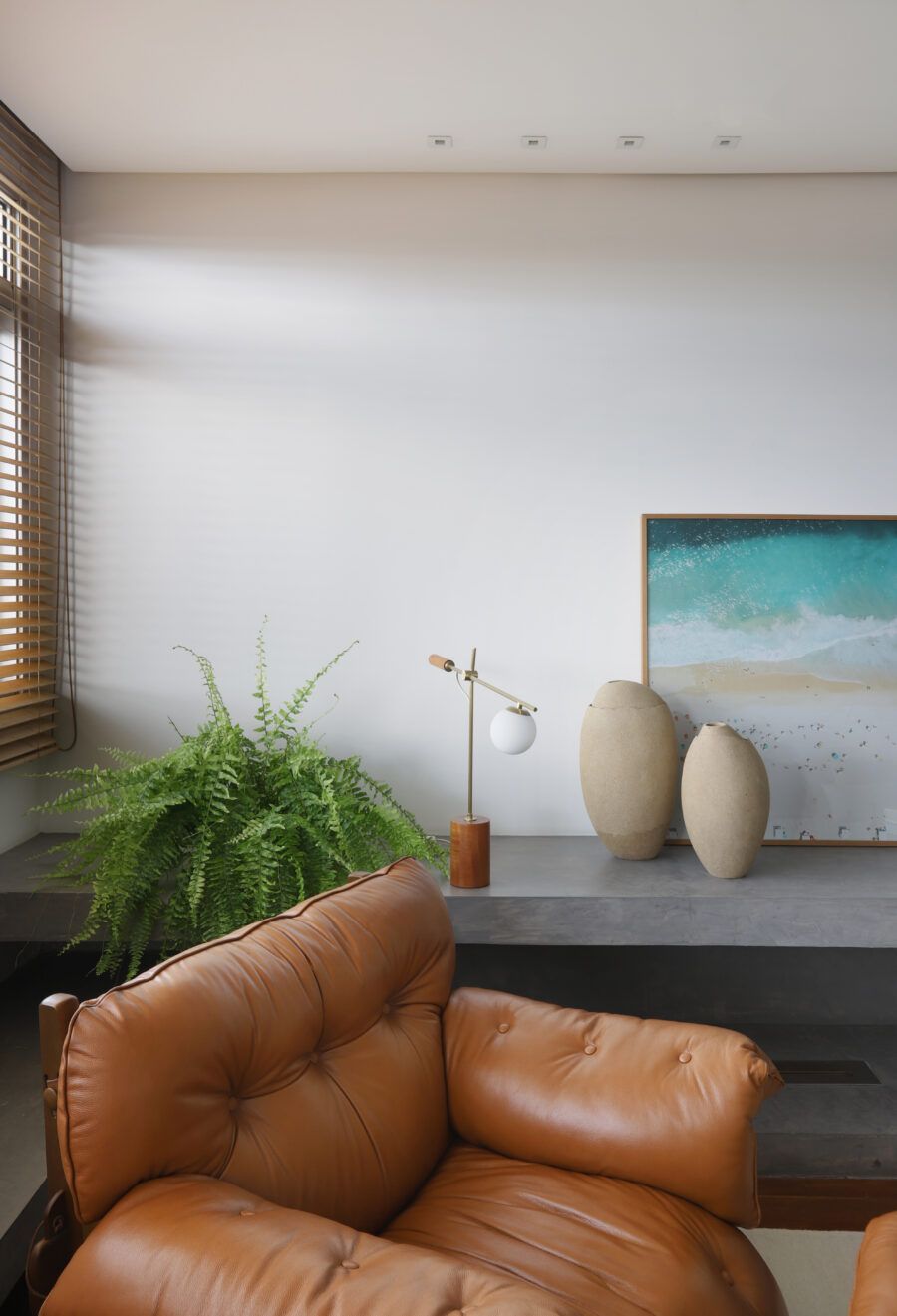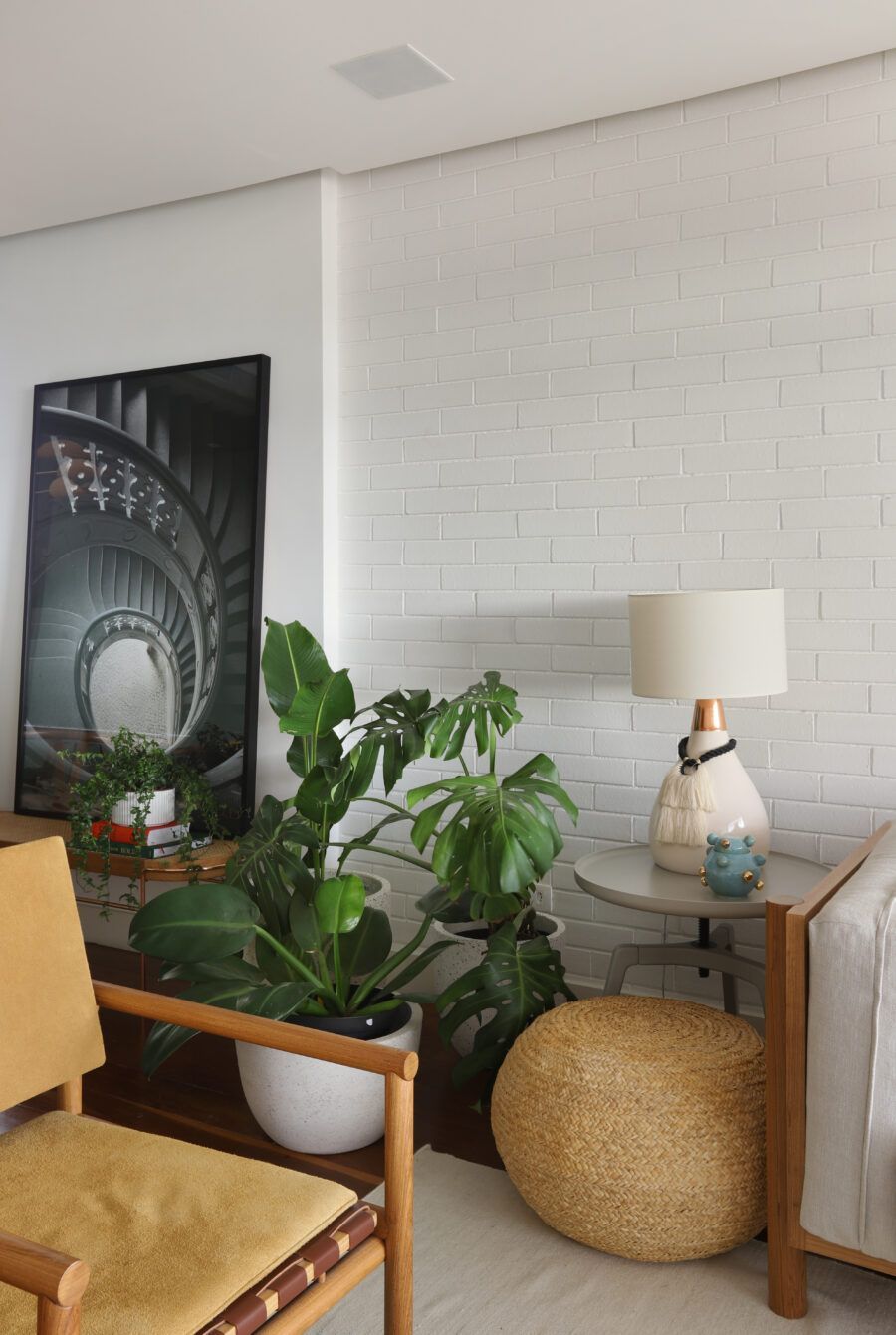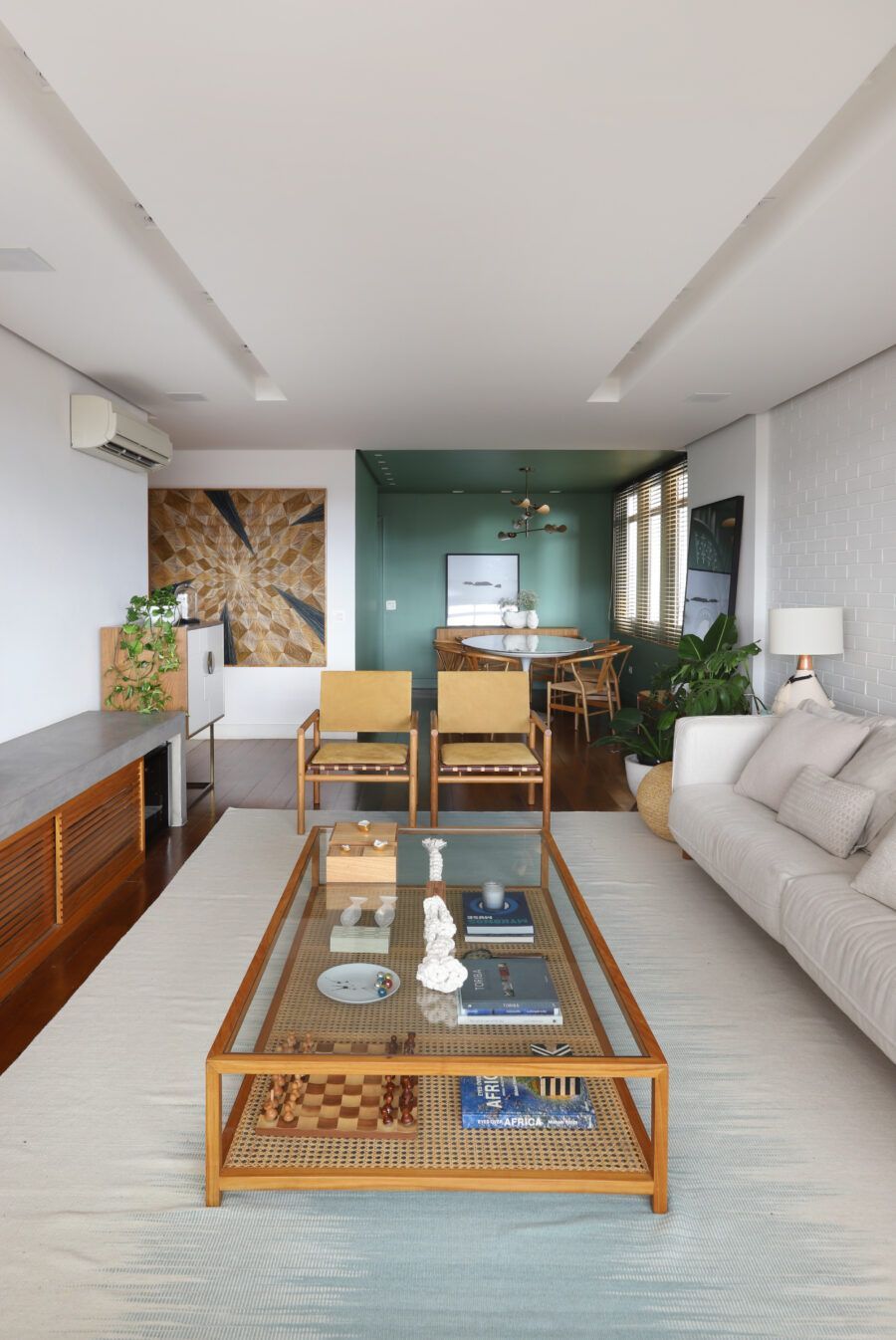 “Em apartamento alugado, vale a pena investir em cor, papel de parede, tapete e em um mobiliário atemporal e confortável. Não tenha medo de usar cor. O chamado “color block”, usado na sala nesse apartamento, tem grande impacto visual, com baixo custo. Pintar o teto deixa o ambiente mais interessante e é falso que achata o pé direito.”