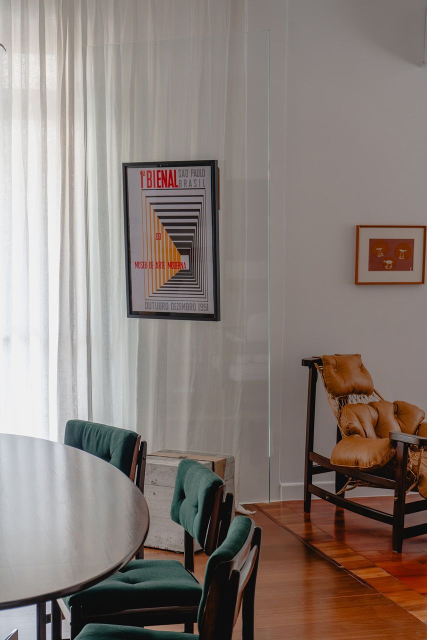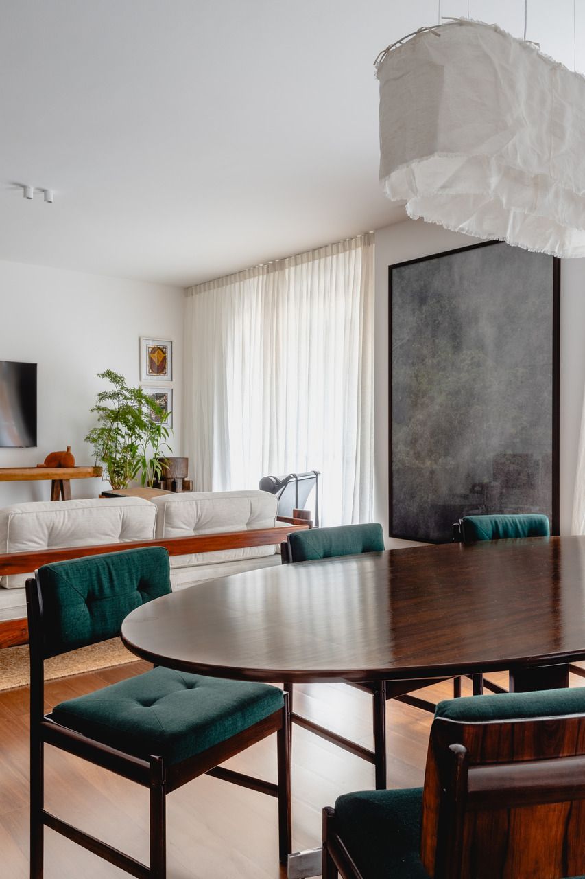 “O projeto foi construído junto com a cliente que trabalha no mercado das artes. Os móveis, em sua maioria vintage, trazem outro interesse da moradora que é o mobiliário moderno, que convive muito bem com a arte contemporânea e outros elementos de decoração atuais.”