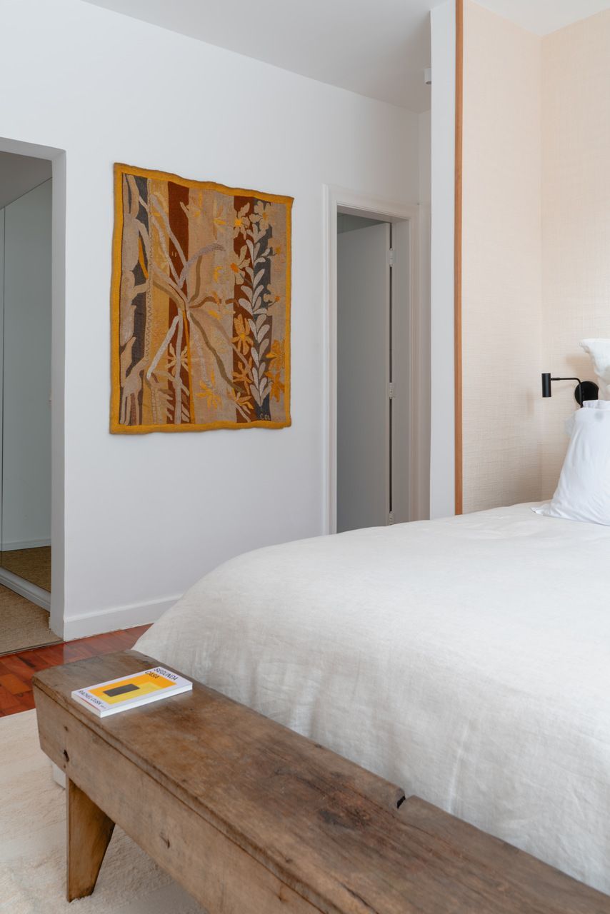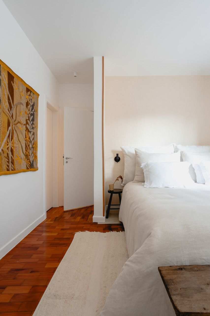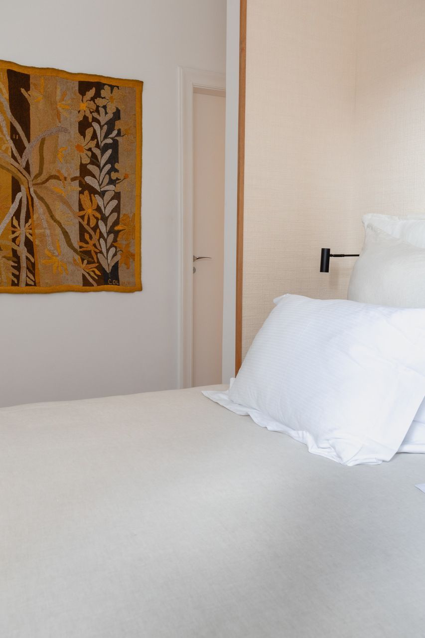 Na suíte principal, o design teve que se atentar aos preceitos do Feng Shui para garantir o fluxo energético ideal. A posição específica da cama exigiu a retirada de um armário embutido original, o que gerou a necessidade de uma recomposição minuciosa do piso e das paredes. O acabamento foi feito com um tecido natural de algodão, proporcionando uma textura tátil e suave. O resultado final, que hoje se assemelha a uma cabeceira meticulosamente planejada, nasceu na verdade de uma solução técnica para acomodar a cama na orientação correta.