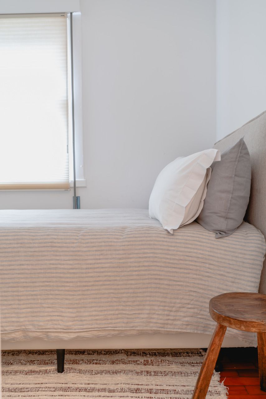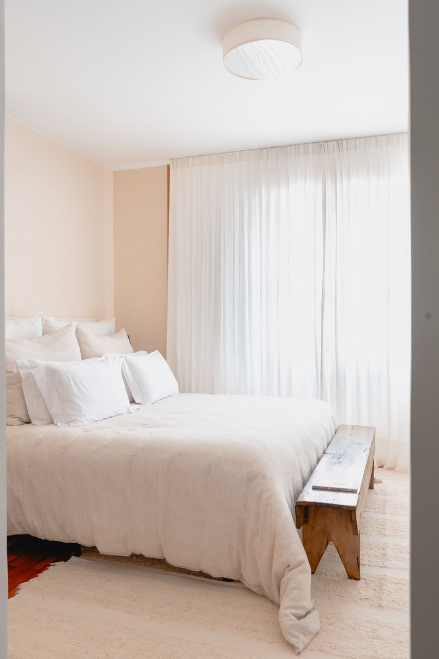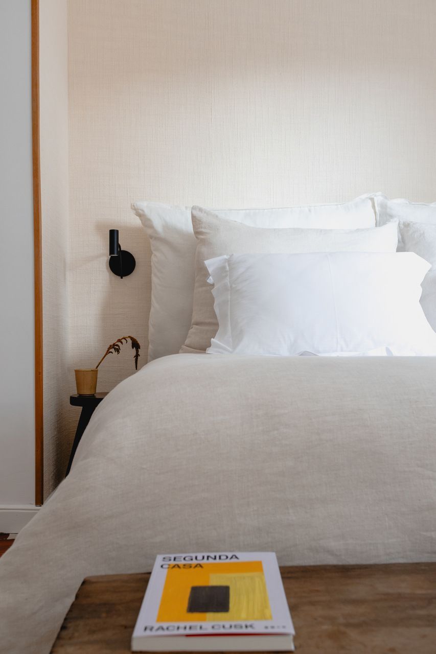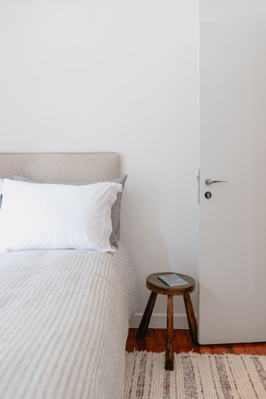 Na suíte principal, o design teve que se atentar aos preceitos do Feng Shui para garantir o fluxo energético ideal. A posição específica da cama exigiu a retirada de um armário embutido original, o que gerou a necessidade de uma recomposição minuciosa do piso e das paredes. O acabamento foi feito com um tecido natural de algodão, proporcionando uma textura tátil e suave. O resultado final, que hoje se assemelha a uma cabeceira meticulosamente planejada, nasceu na verdade de uma solução técnica para acomodar a cama na orientação correta.