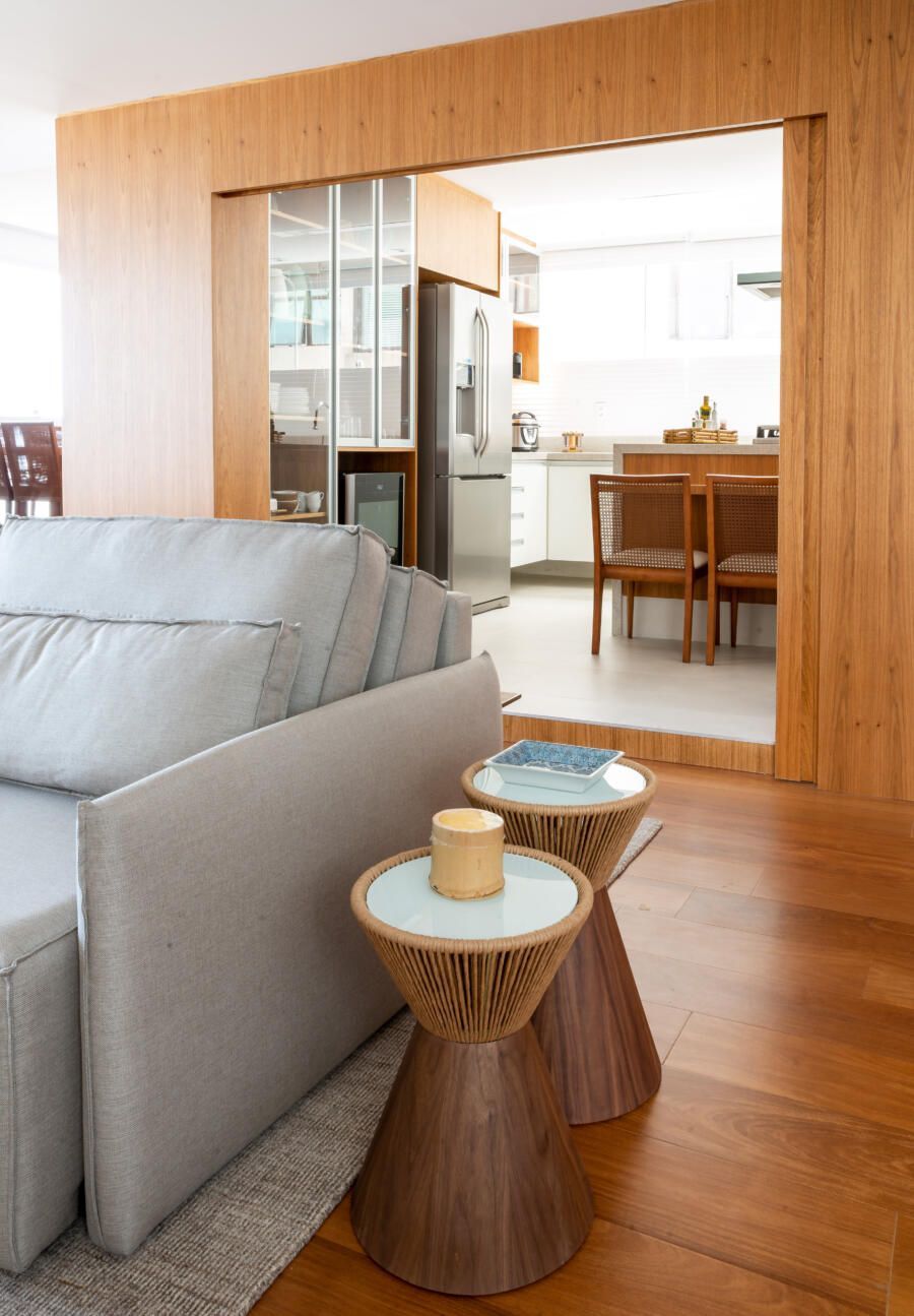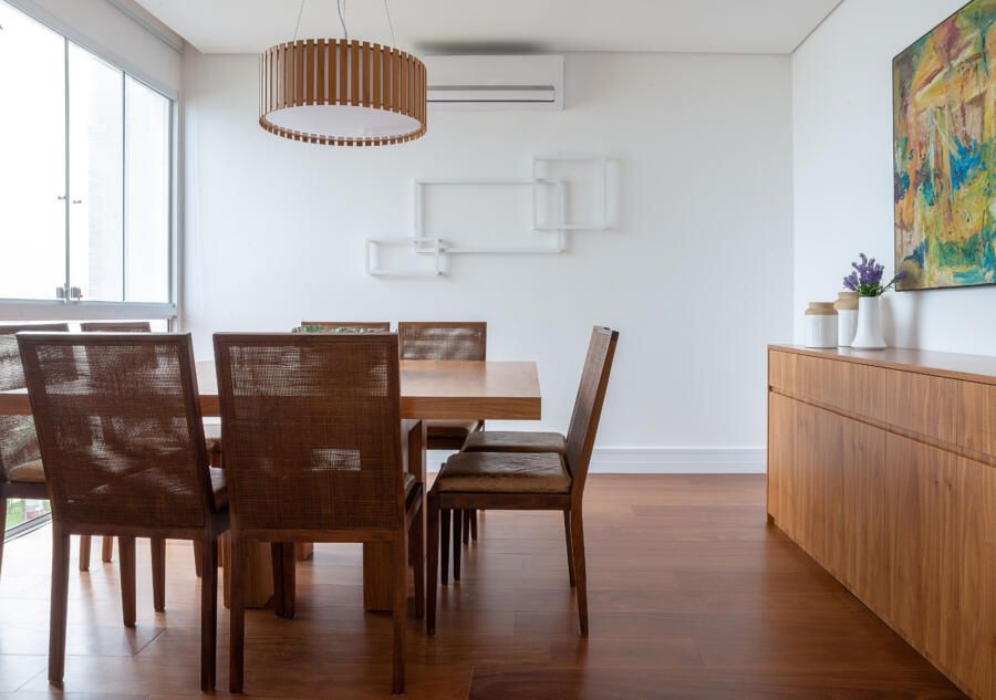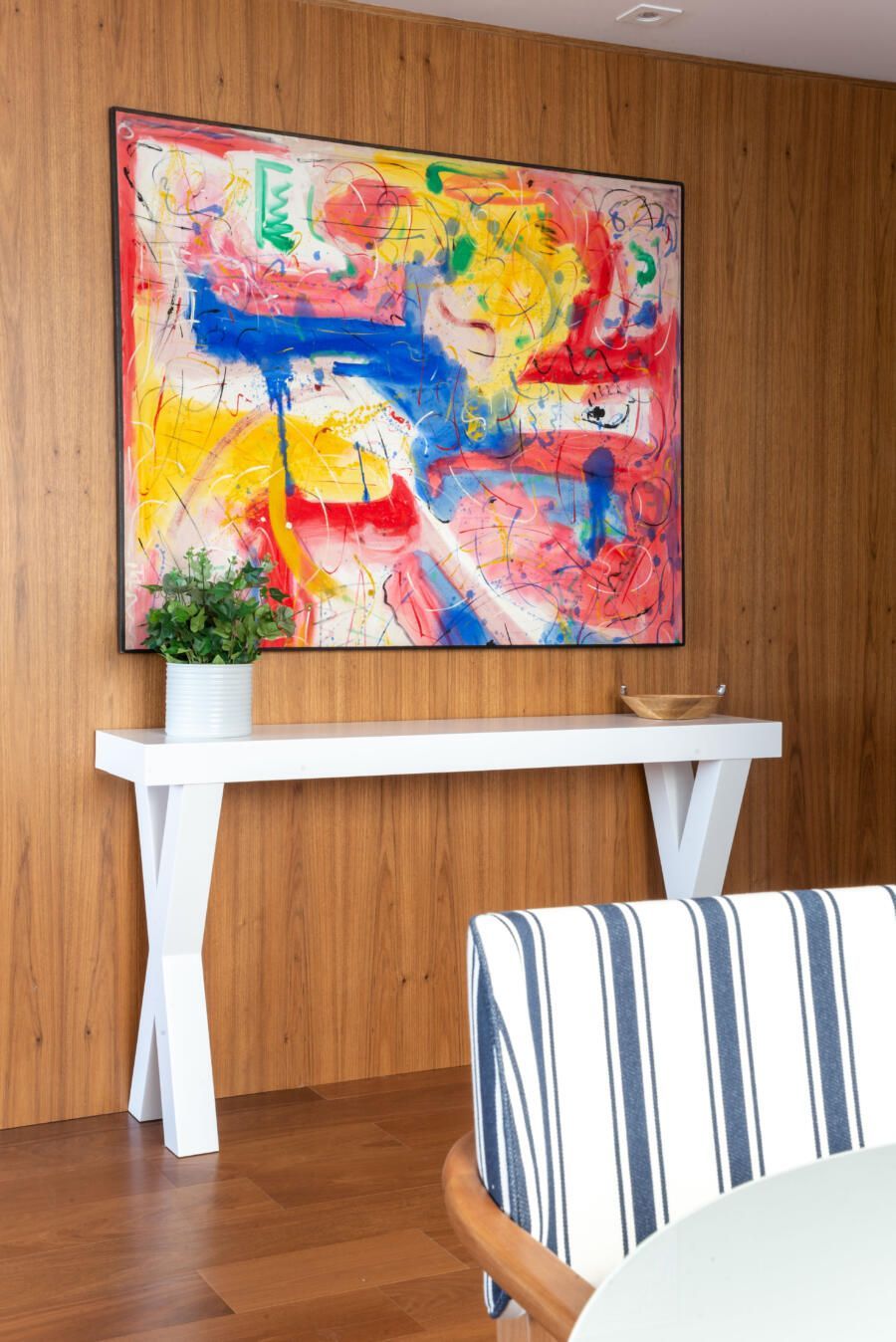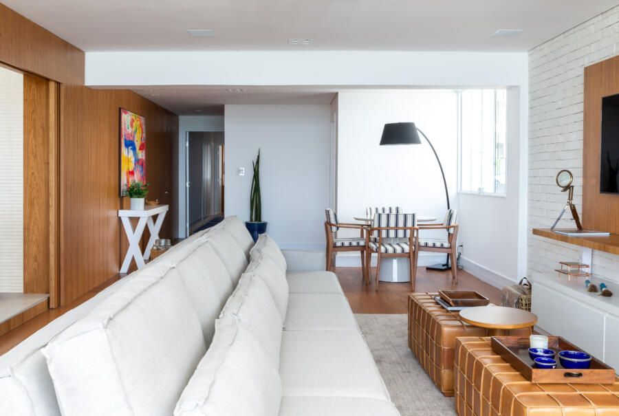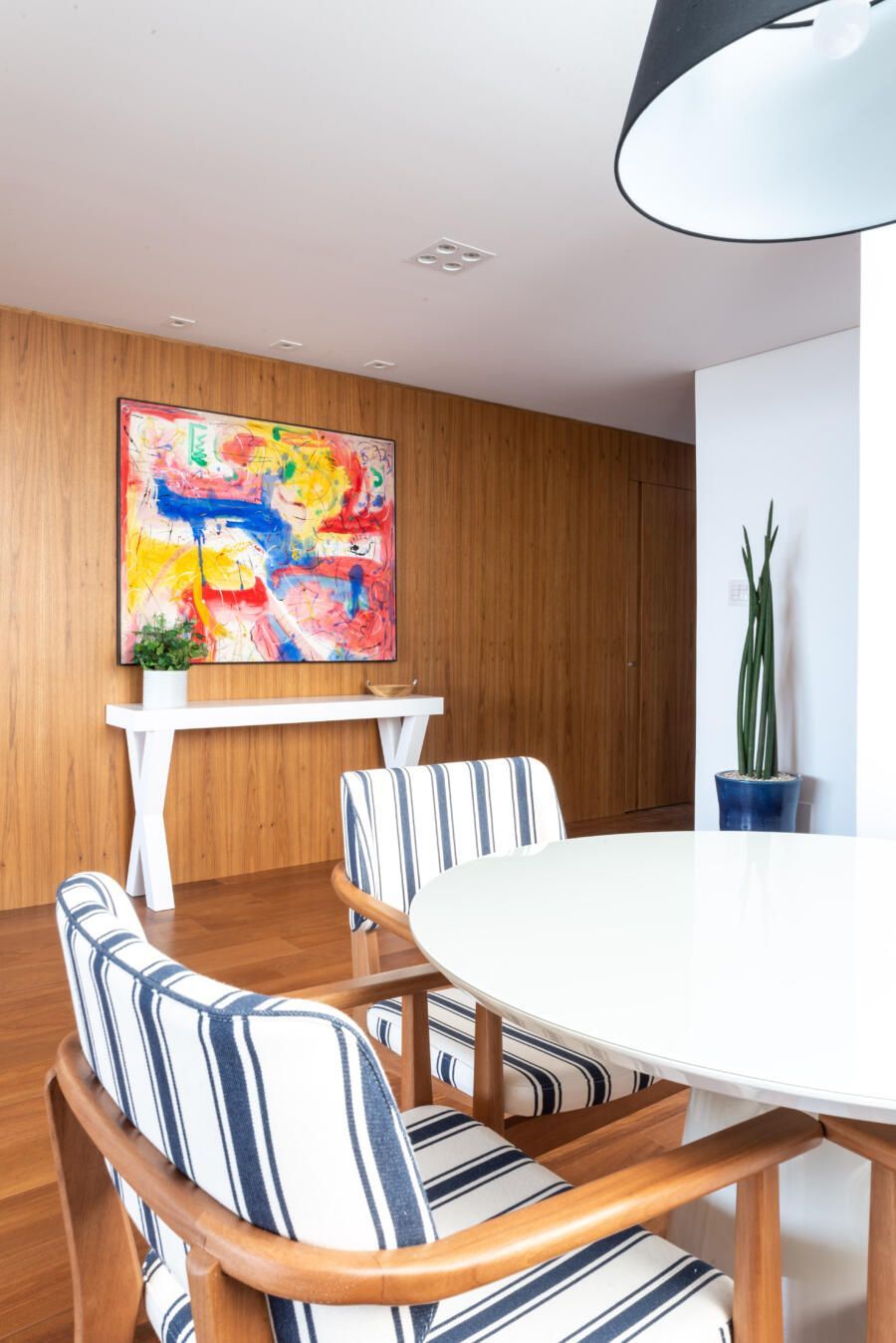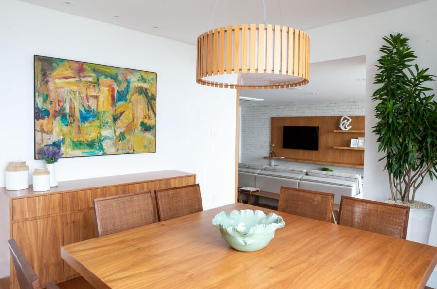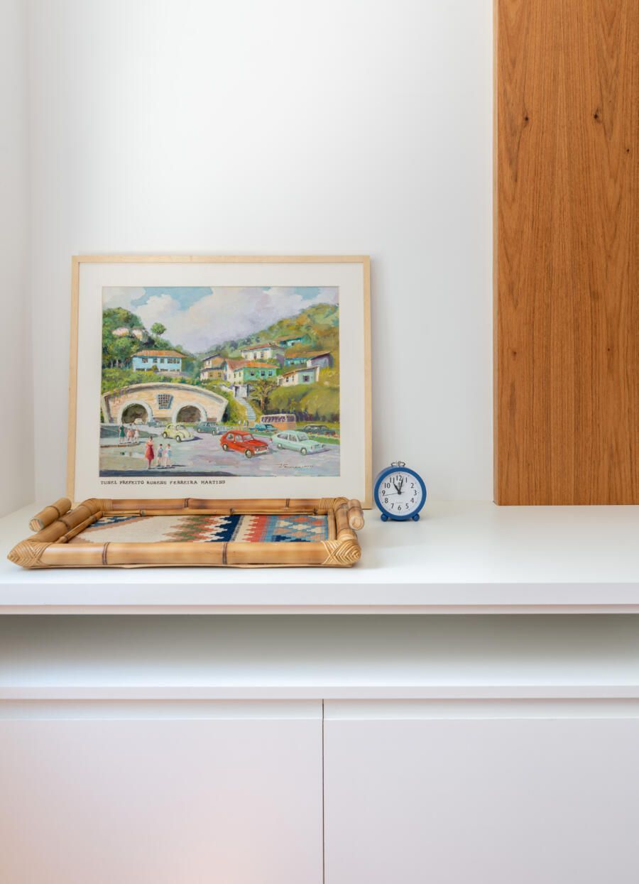“Mesmo que ambos ambientes sejam de grandes proporções, os moradores desejavam trazer a sensação de liberdade e amplitude, então realizamos a manutenção do piso em tacos de madeira na ampla sala para gerar maior conforto. Além disso, fizemos a personalização de vários detalhes de decoração, como as recordações de viagem em destaque na sala, no hall íntimo e os quartos dos filhos com peças decorativas personalizadas que fizeram muita diferença no acabamento.”