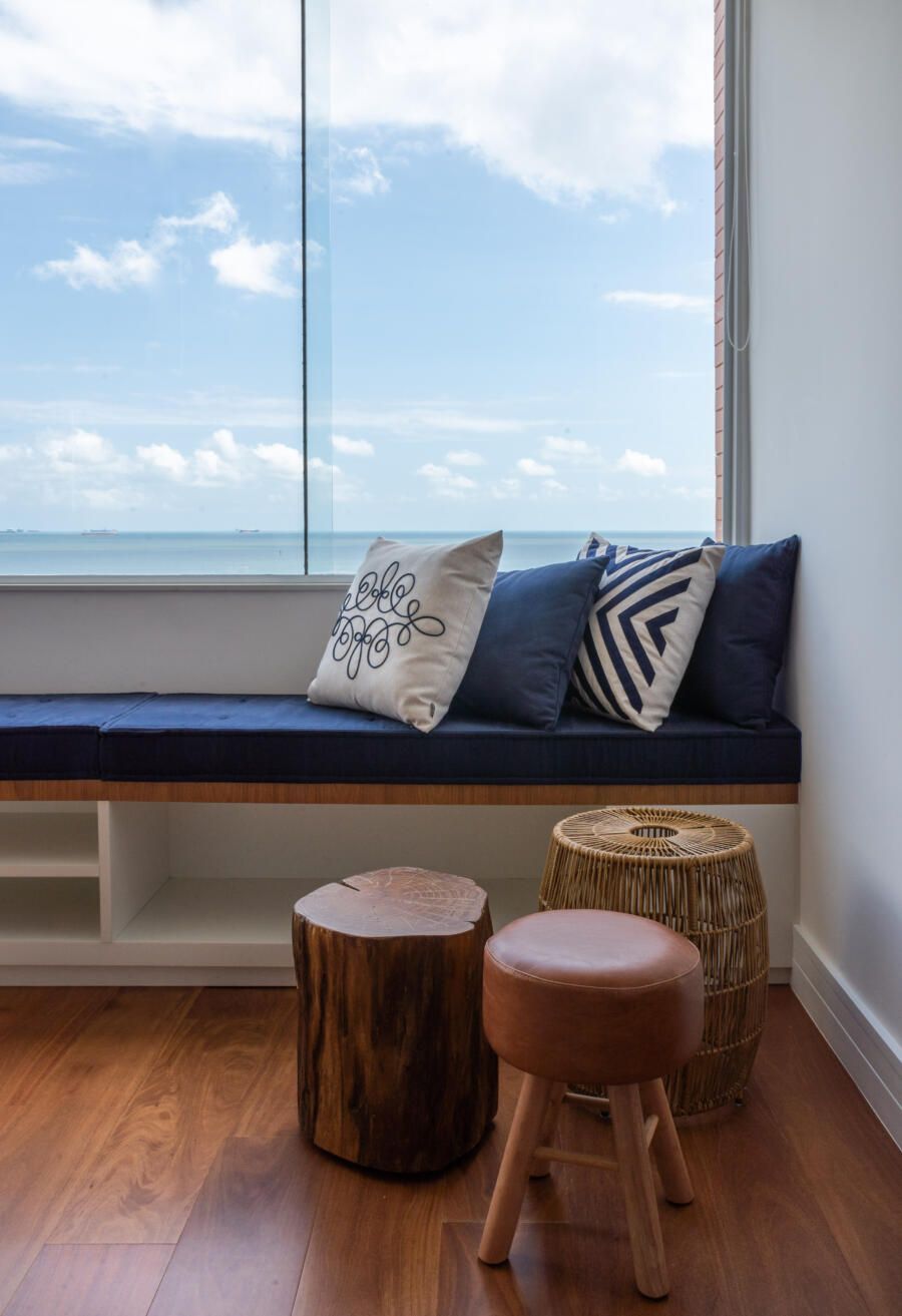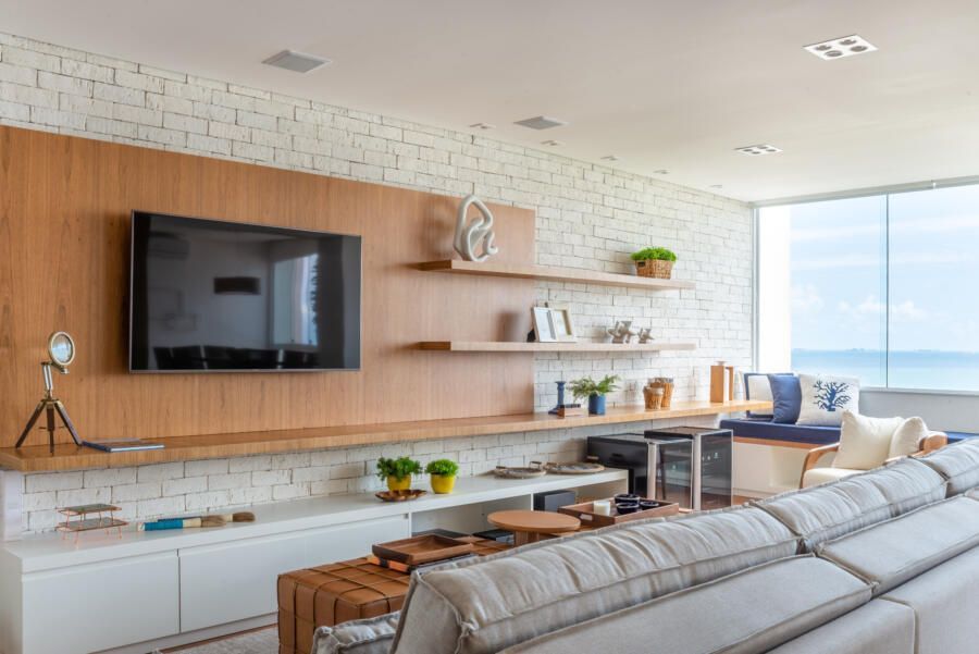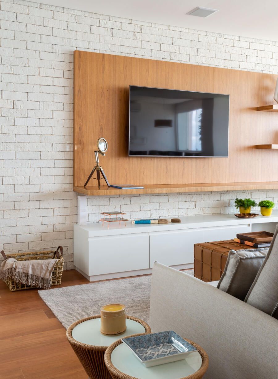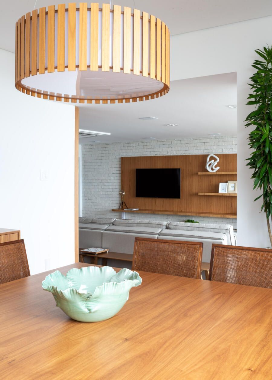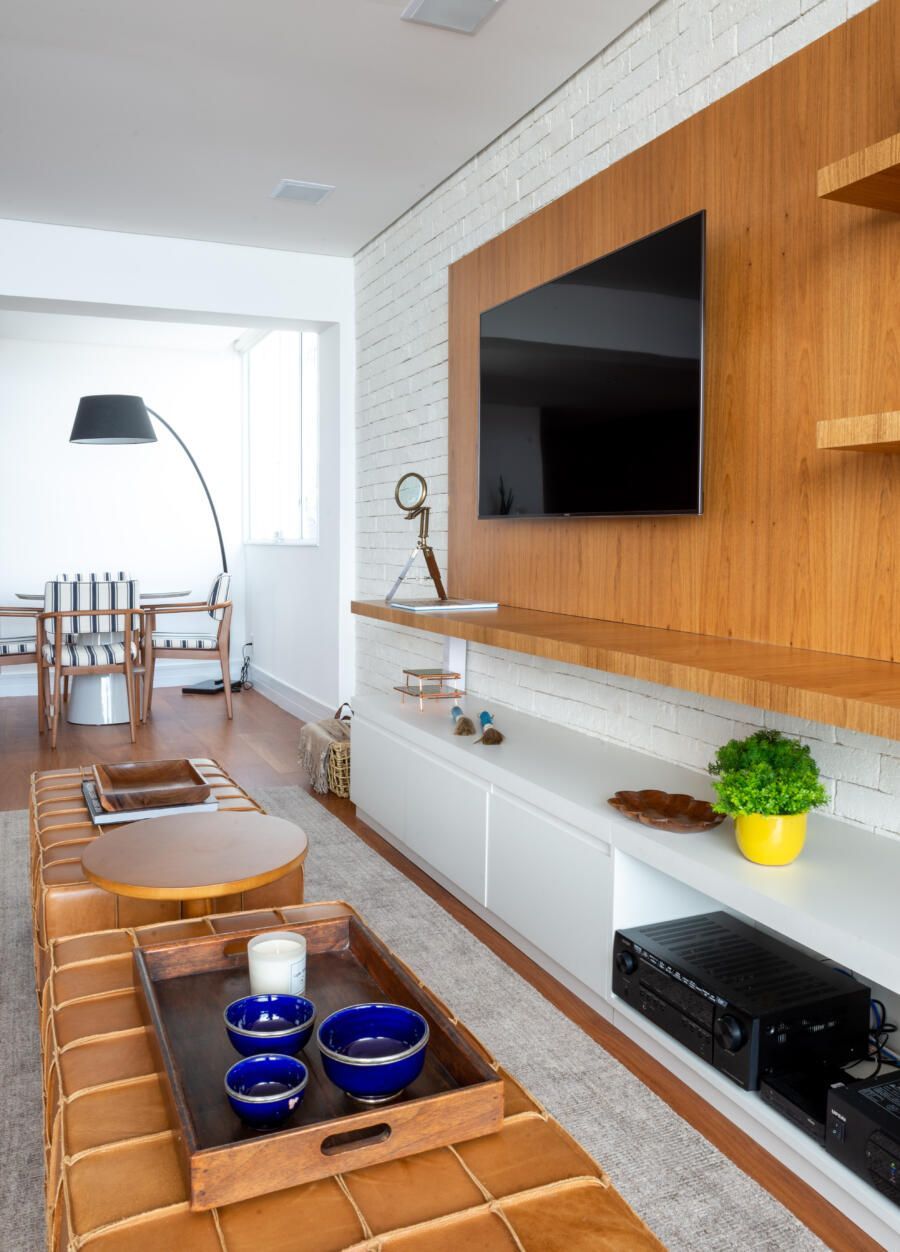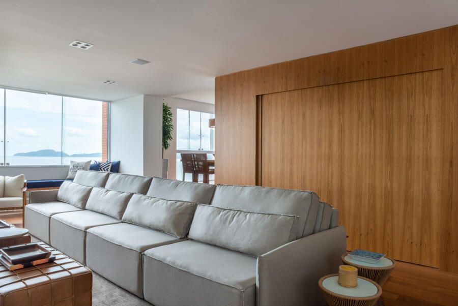 “Mesmo que ambos ambientes sejam de grandes proporções, os moradores desejavam trazer a sensação de liberdade e amplitude, então realizamos a manutenção do piso em tacos de madeira na ampla sala para gerar maior conforto. Além disso, fizemos a personalização de vários detalhes de decoração, como as recordações de viagem em destaque na sala, no hall íntimo e os quartos dos filhos com peças decorativas personalizadas que fizeram muita diferença no acabamento.”