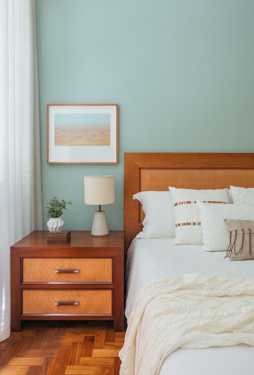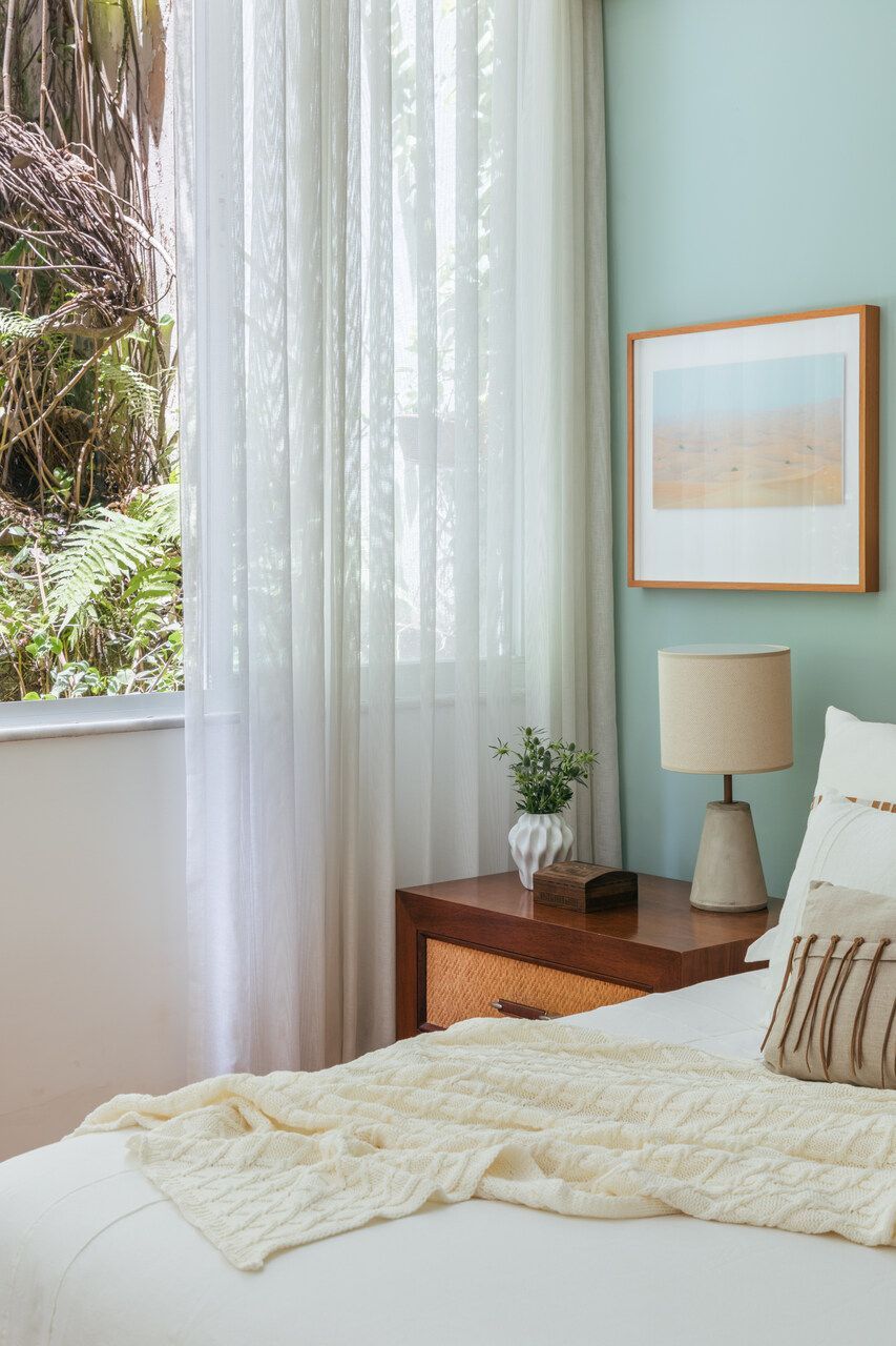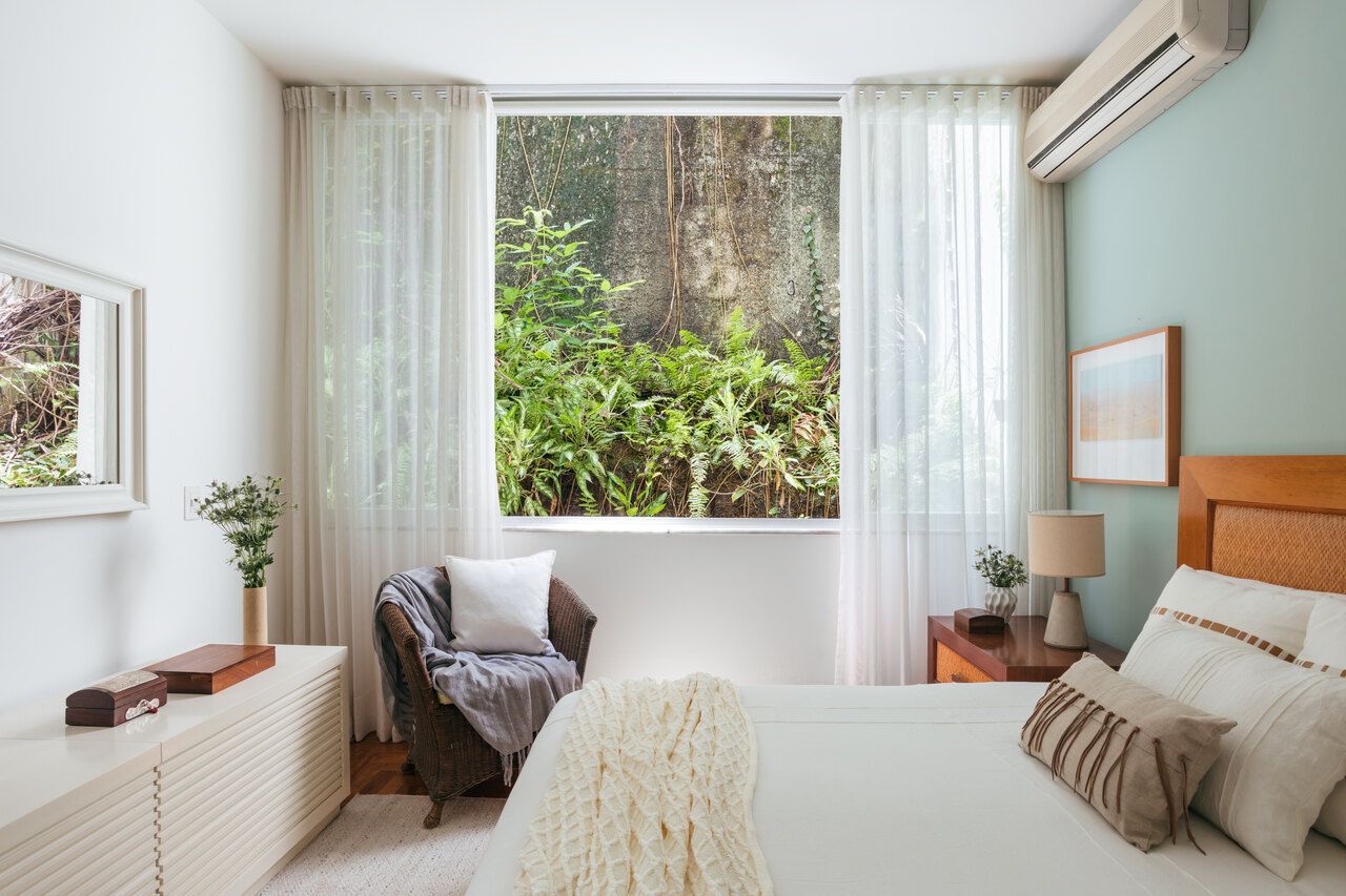 Uma das mudanças mais significativas foi a criação de uma suíte principal nos fundos, abrindo mão da suíte original com vista para a Lagoa. A nova suíte conta com dois banheiros para o casal e um closet. Essa parte do apartamento se tornou um refúgio tranquilo, isolado do ruído da cidade, com uma ampla janela com vista para um pequeno jardim interno. Os pássaros dessa região, de diversas espécies, proporcionam um despertar encantador a cada manhã.