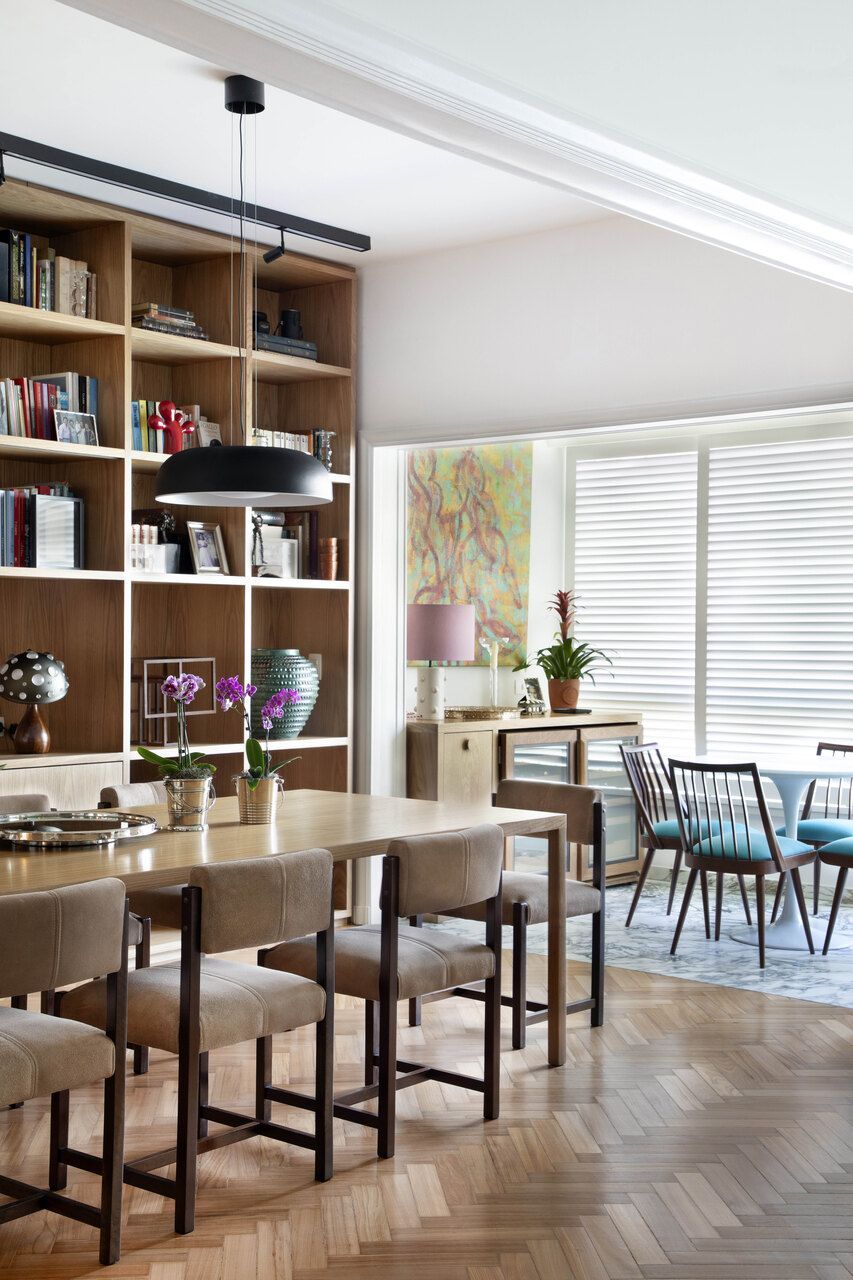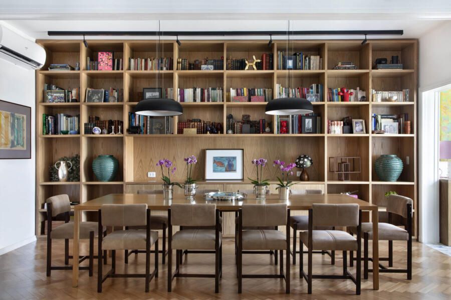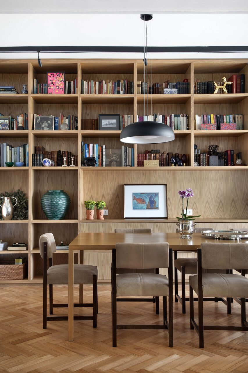 Um elemento de marcenaria desenhado exclusivamente pelo escritório tornou-se o protagonista funcional da sala de jantar: uma estante em carvalho americano composta por 33 nichos. Além de organizar o acervo de livros e objetos dos moradores, a peça atua como um anteparo que aquece visualmente o ambiente e traz textura à parede principal. A integração com a cozinha mantém esse mesmo padrão de acabamentos, garantindo que a área de preparo das refeições seja uma extensão elegante do convívio, em vez de um espaço isolado, reforçando o conceito de que cada metro quadrado deve ser aproveitado e celebrado.