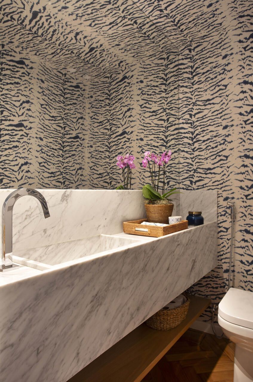 Em contraste com a claridade das salas, o lavabo foi concebido para surpreender através de uma atmosfera dramática e envolvente. As arquitetas optaram por revestir paredes e teto com um papel de parede de estampa animal, criando um ambiente cenográfico que destoa propositalmente da serenidade do restante da casa. Concluído em cerca de dez meses, o projeto prova que é possível revitalizar um imóvel antigo com audácia cromática e design de ponta, sem sacrificar a elegância e o respeito à arquitetura original que o tornam verdadeiramente único.
