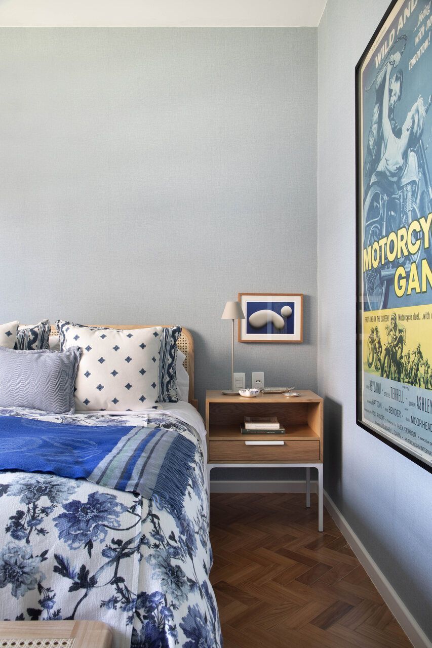 Logo na entrada, o projeto rompe com o óbvio através de um corredor tingido integralmente de azul-bic, do piso ao teto. Essa intervenção audaciosa transforma o que seria apenas uma área de passagem em uma galeria imersiva, funcionando como um eixo de conexão entre a ala social, a cozinha e a área íntima. Visível de diversos ângulos da sala, essa “caixa colorida” injeta uma vibração contemporânea e artística no apartamento, servindo como o cartão de visitas perfeito para uma casa habitada por uma designer de joias e um profissional do mercado financeiro.