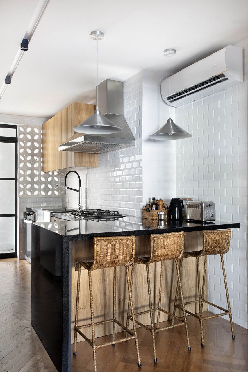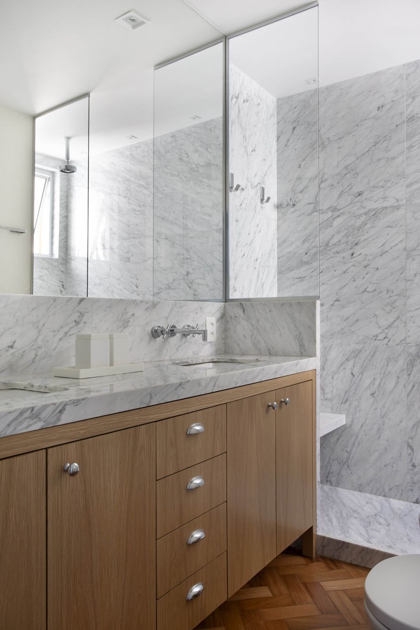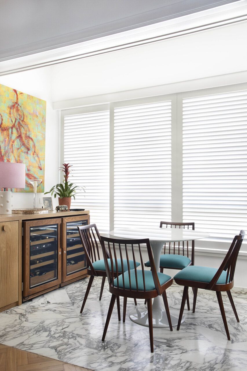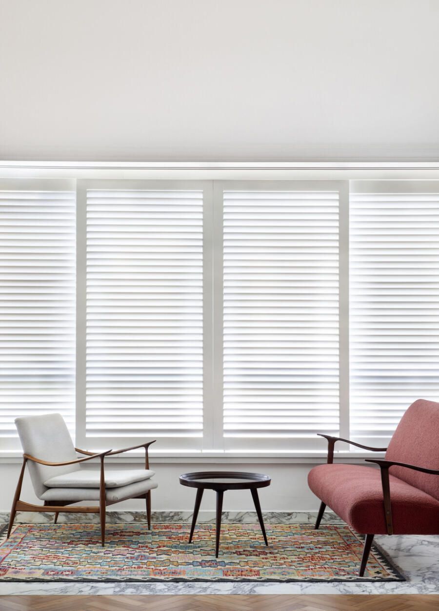 Na área social, a preservação de materiais originais funciona como uma âncora histórica de extrema elegância. O piso em taco de peroba-do-campo, com sua icônica paginação em espinha de peixe, foi meticulosamente restaurado para recuperar seu brilho e calor, estendendo-se inclusive para a cozinha para reforçar a unidade visual. Outros detalhes, como a porta de entrada em serralheria e o mármore original próximo às janelas, foram mantidos como testemunhas da arquitetura de época. Para filtrar a luz do Rio e garantir o conforto térmico, painéis venezianos deslizantes em laca branca foram instalados, permitindo controlar a privacidade sem perder a luminosidade natural.