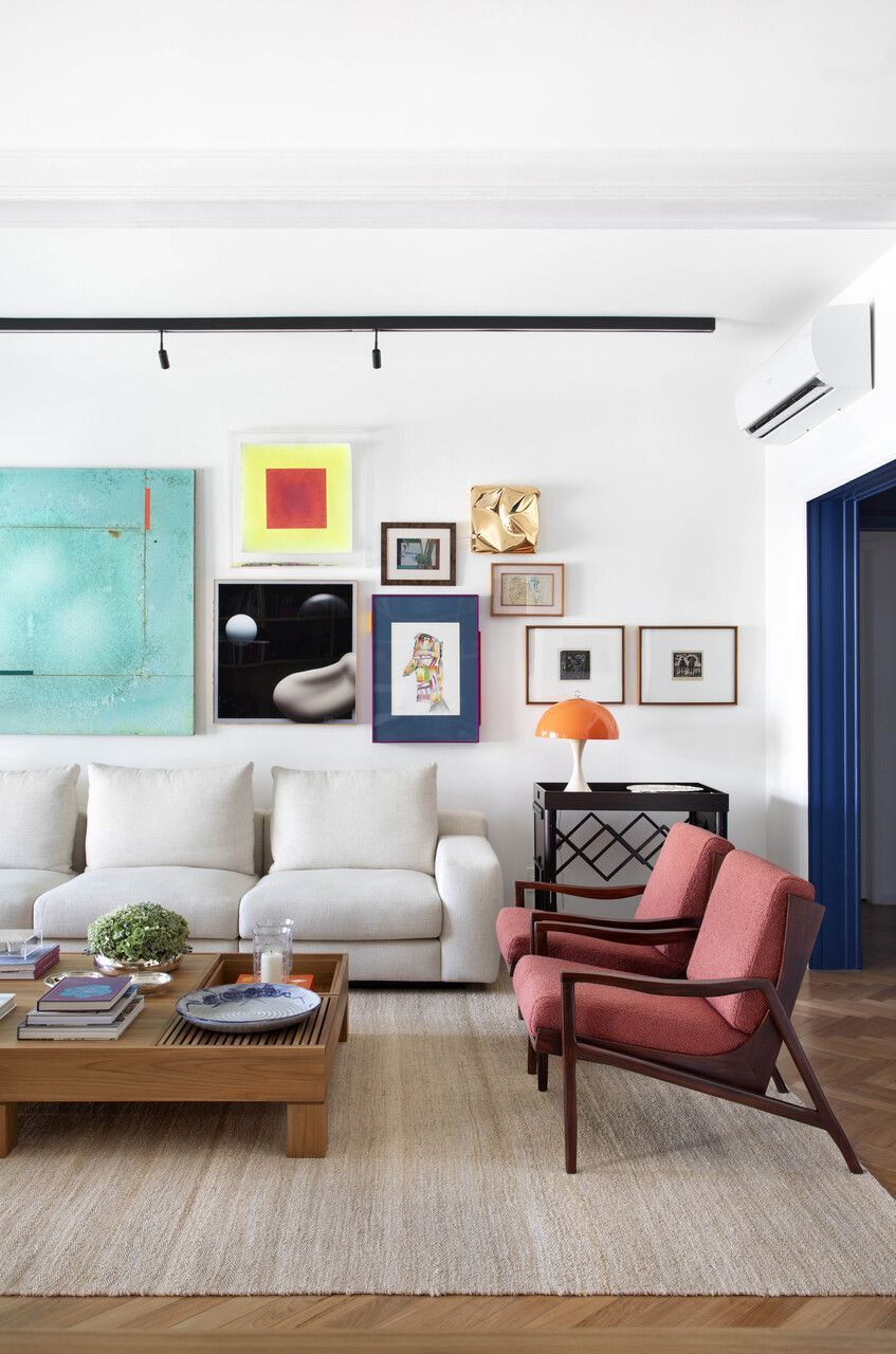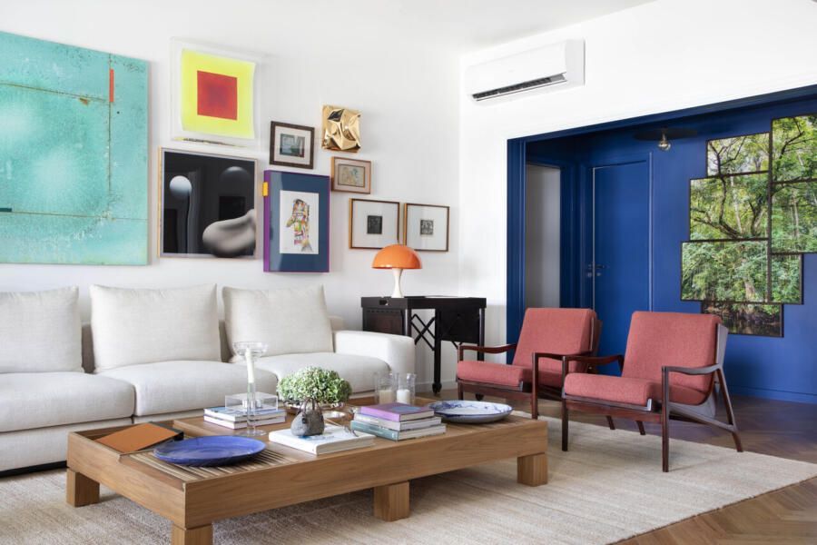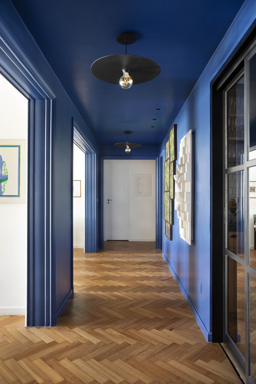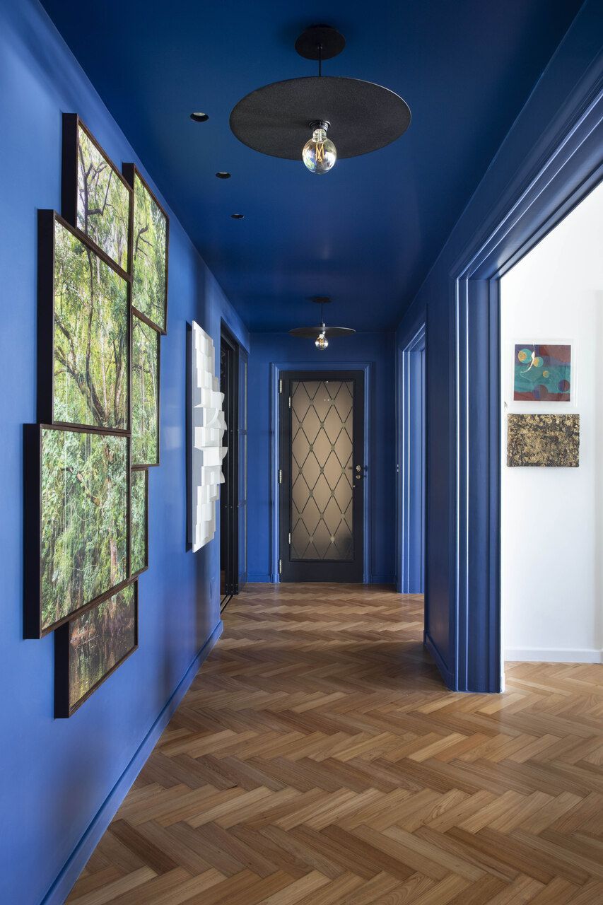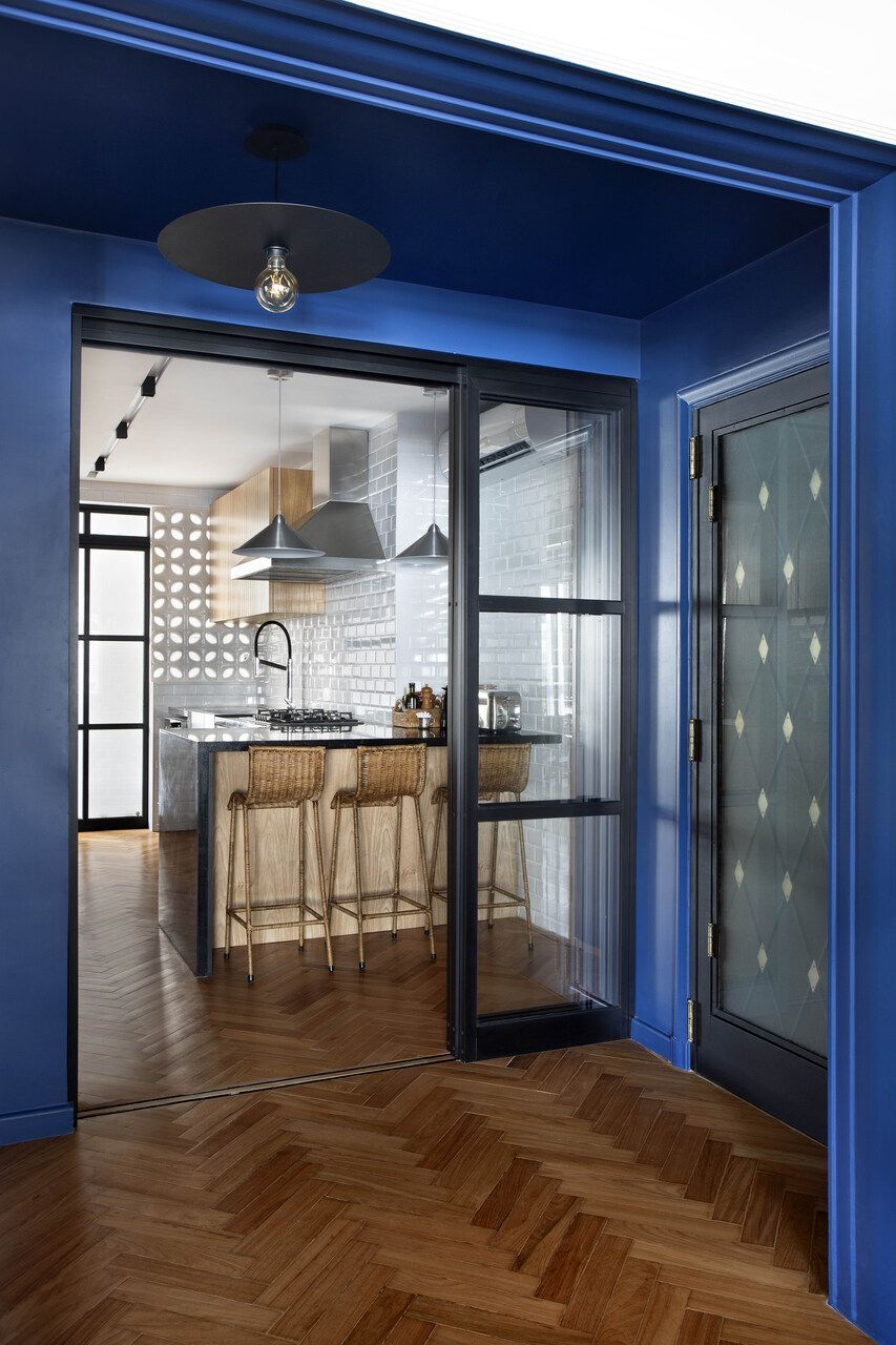 Apartamento antigo restaurado com integração, design nacional e corredor azul-bic