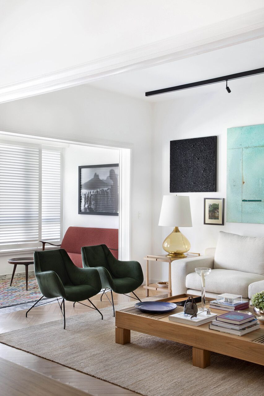 O mobiliário reflete uma curadoria refinada que mistura o acervo pessoal da família com peças fundamentais do design brasileiro moderno e contemporâneo. Poltronas que pertenciam ao endereço anterior ganharam vida nova ao lado das cadeiras Tião, de Sergio Rodrigues, e da icônica poltrona Dinamarquesa, de Jorge Zalszupin. A mesa de centro Rosá, assinada por Maria Cândida Machado, e o carrinho-bar Nômade, de Claudia Moreira Salles, completam o cenário, criando uma sala que não parece um showroom, mas sim um espaço preenchido com histórias, afeto e excelência estética.